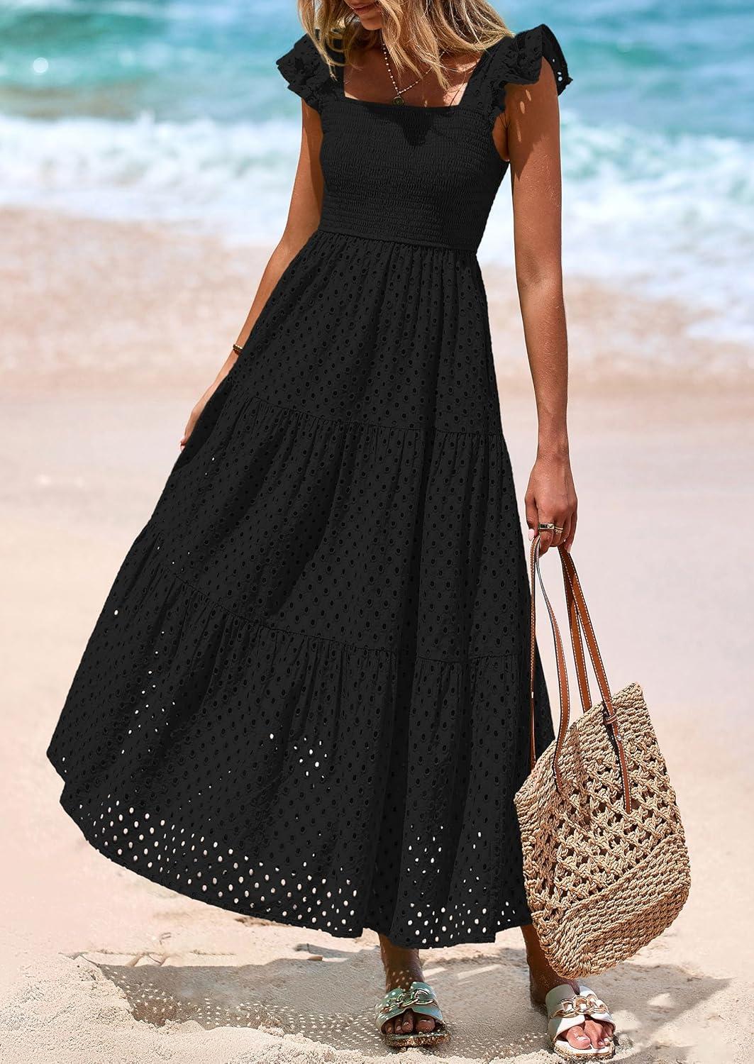 PRETTYGARDEN Womens Summer Square Neck Maxi Dresses Cap Sleeve Eyelet Smocked Tiered A Line Flowy Long Dress with Pockets(Black)