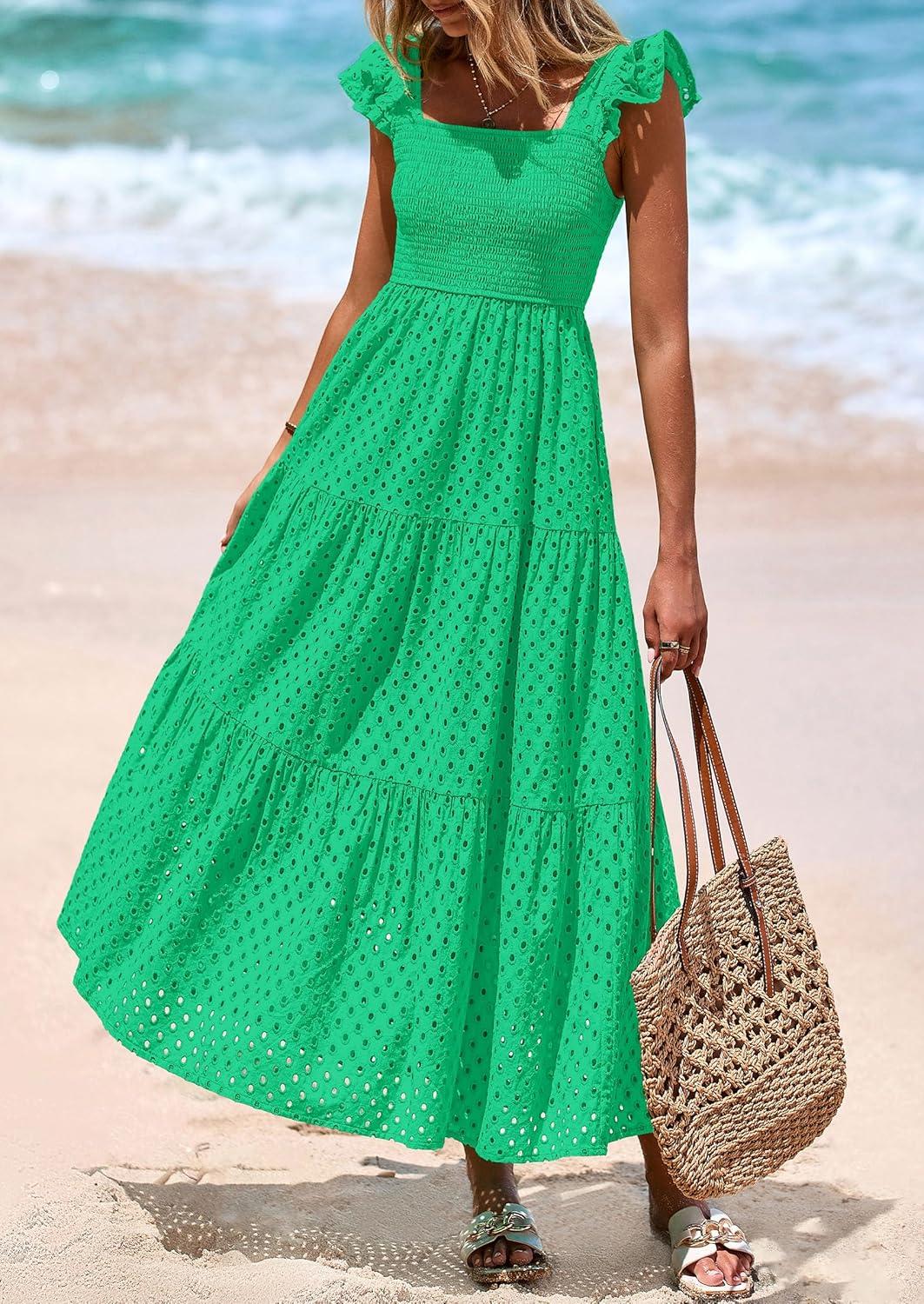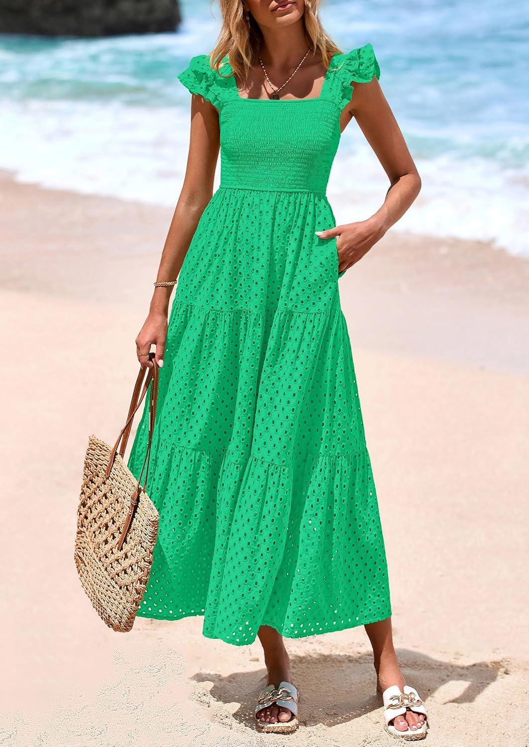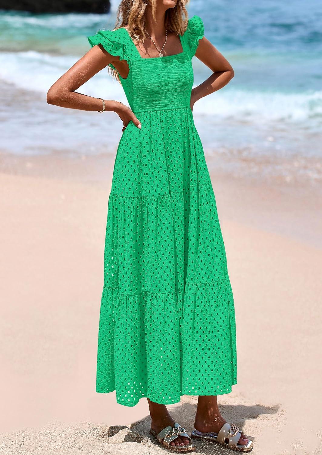 PRETTYGARDEN Womens Summer Square Neck Maxi Dresses Cap Sleeve Eyelet Smocked Tiered A Line Flowy Long Dress with Pockets(Green)