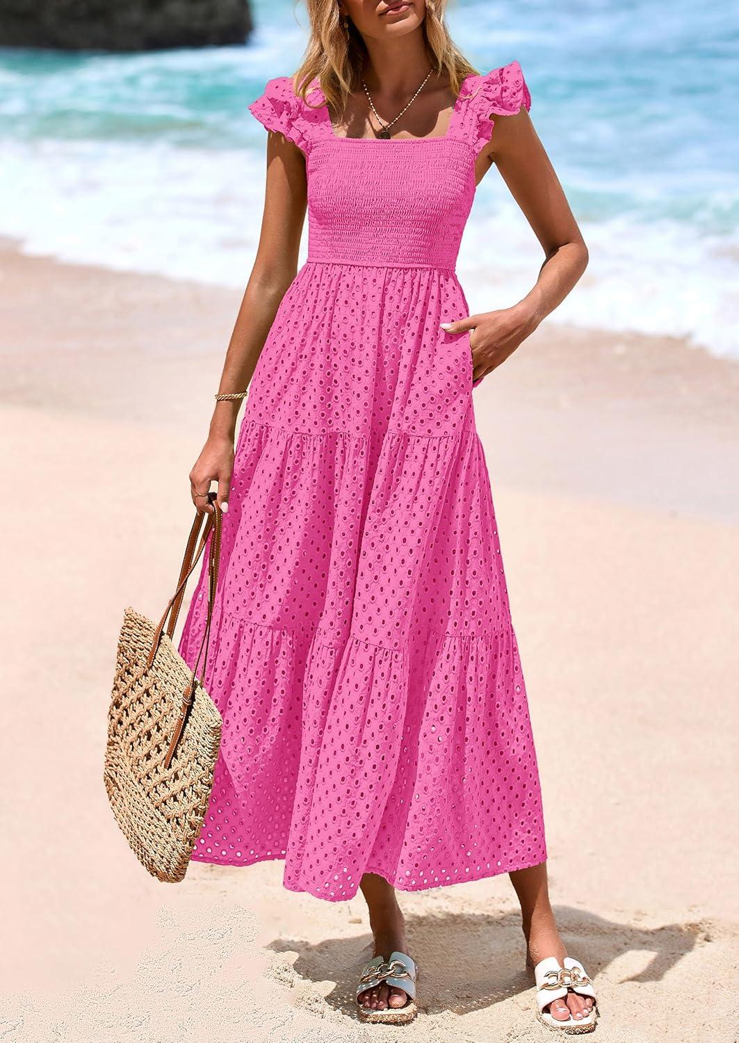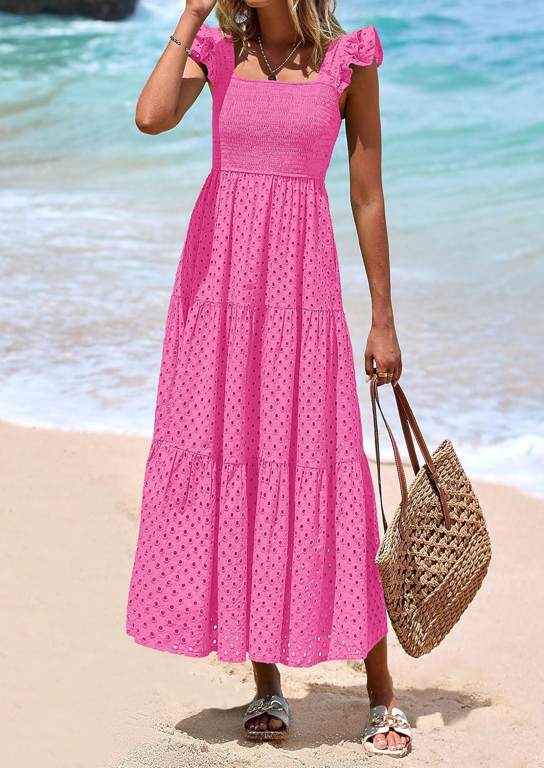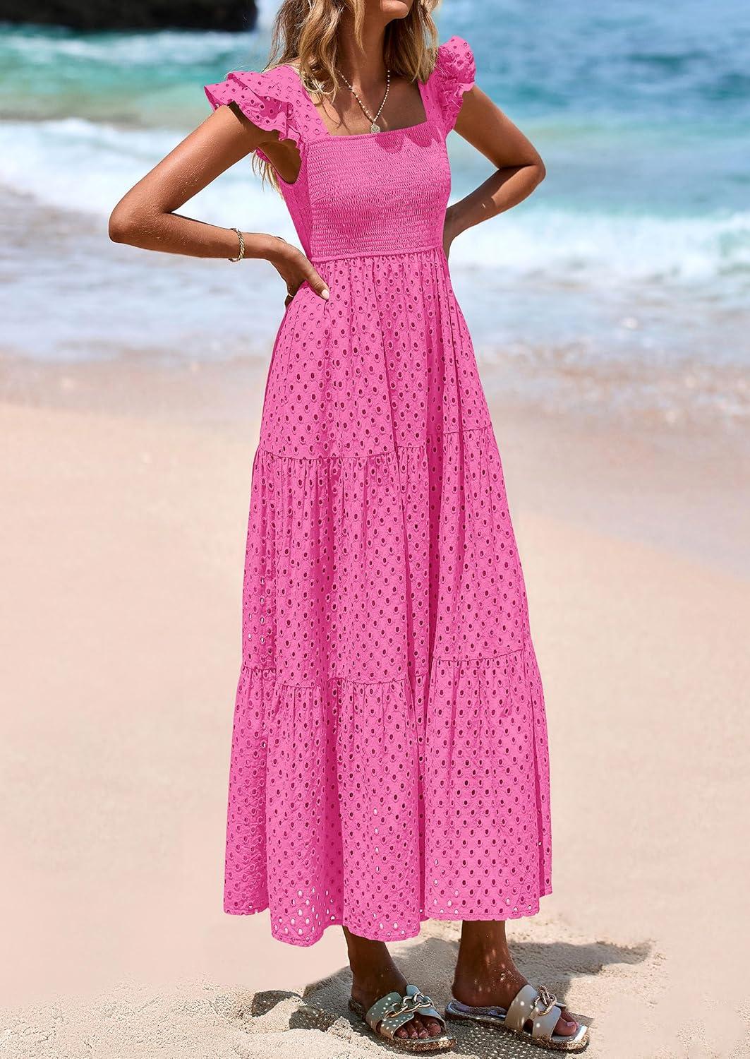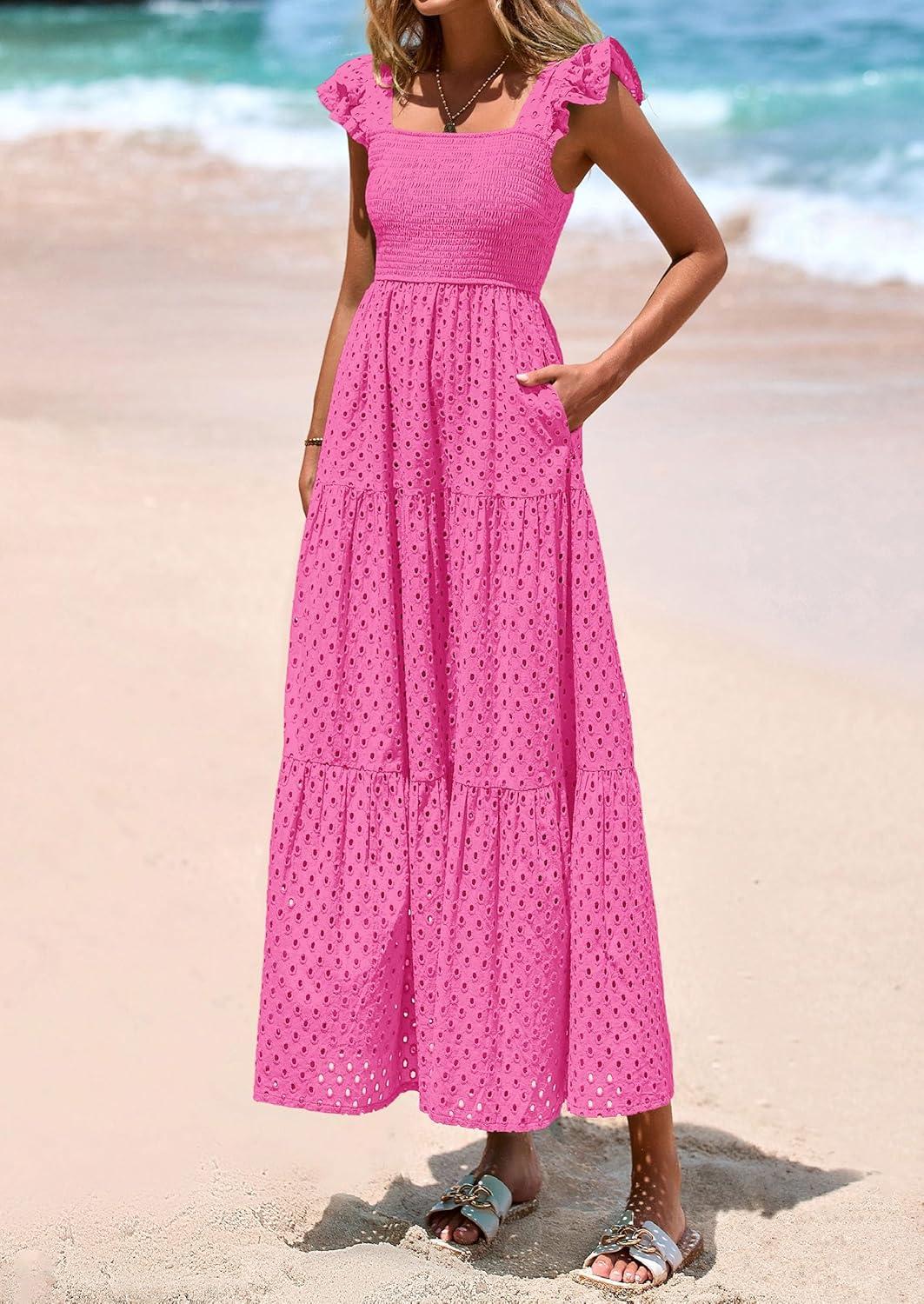 PRETTYGARDEN Womens Summer Square Neck Maxi Dresses Cap Sleeve Eyelet Smocked Tiered A Line Flowy Long Dress with Pockets(Hot Pink)