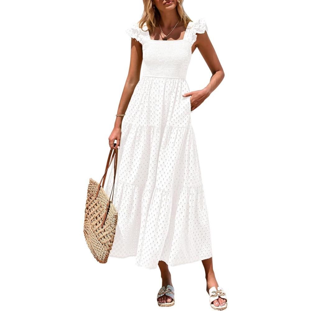 PRETTYGARDEN Womens Summer Square Neck Maxi Dresses Cap Sleeve Eyelet Smocked Tiered A Line Flowy Long Dress with Pockets(White)
