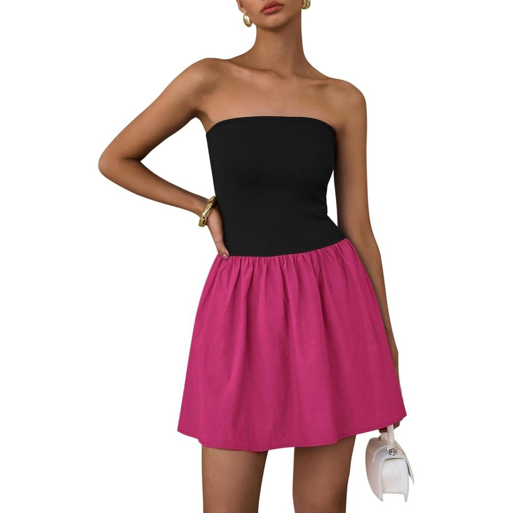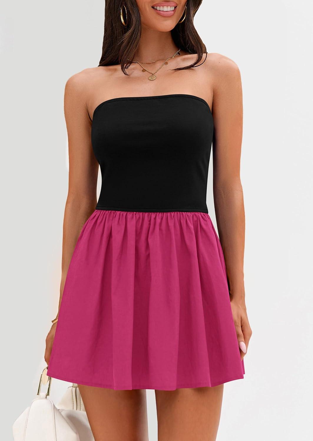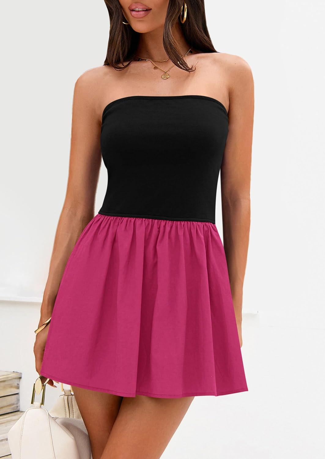 imagePRETTYGARDEN Womens Summer Strapless Mini Party Dress 2025 Casual Tube Top Ruffle A Line Short Patchwork SundressesBlack Rose Red