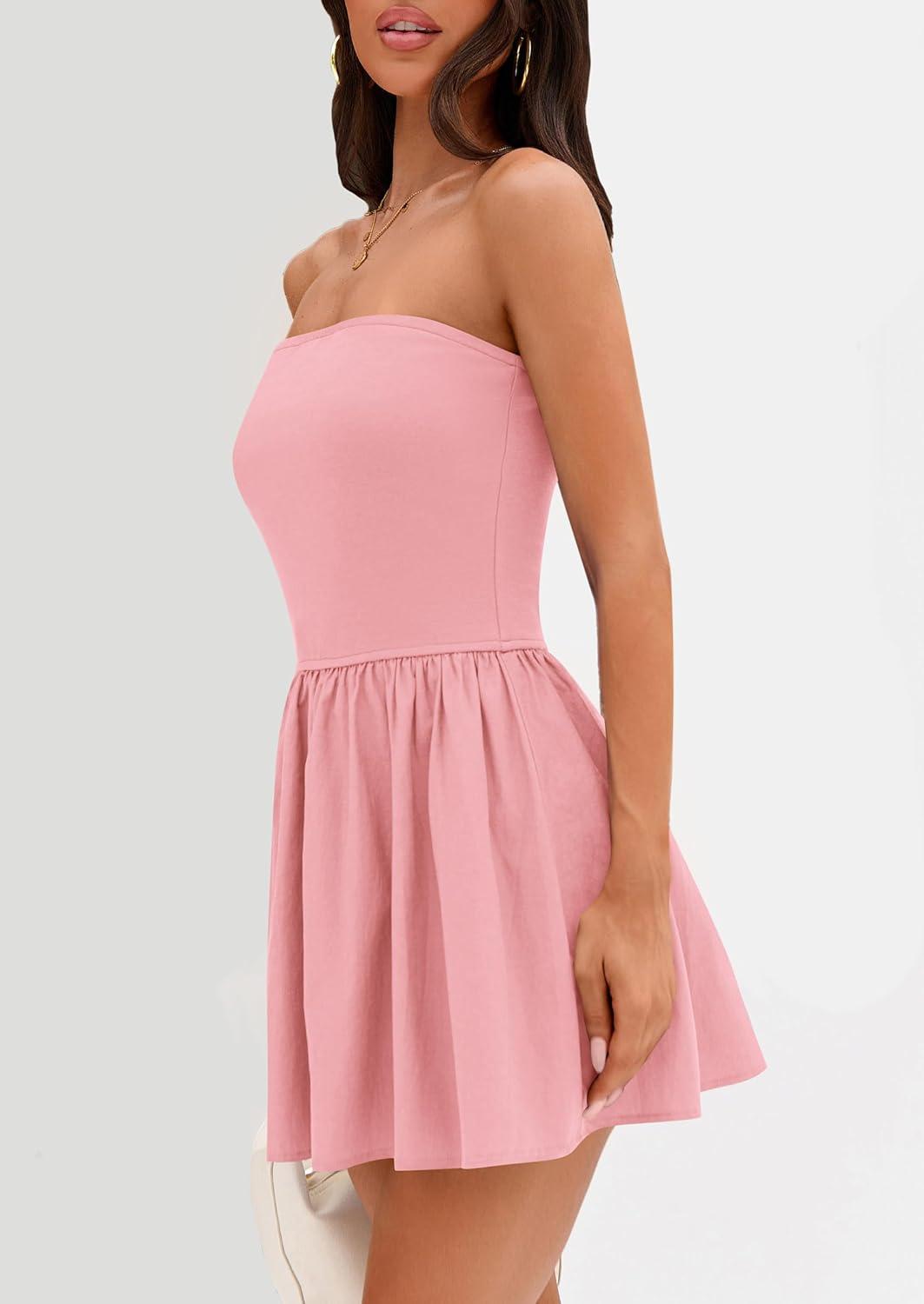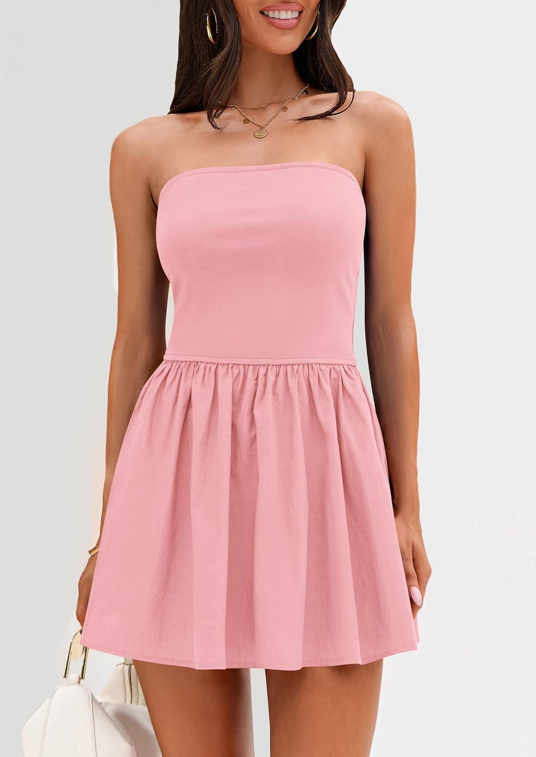 PRETTYGARDEN Women's Summer Strapless Mini Party Dress 2025 Casual Tube Top Ruffle A Line Short Patchwork Sundresses(Pink)