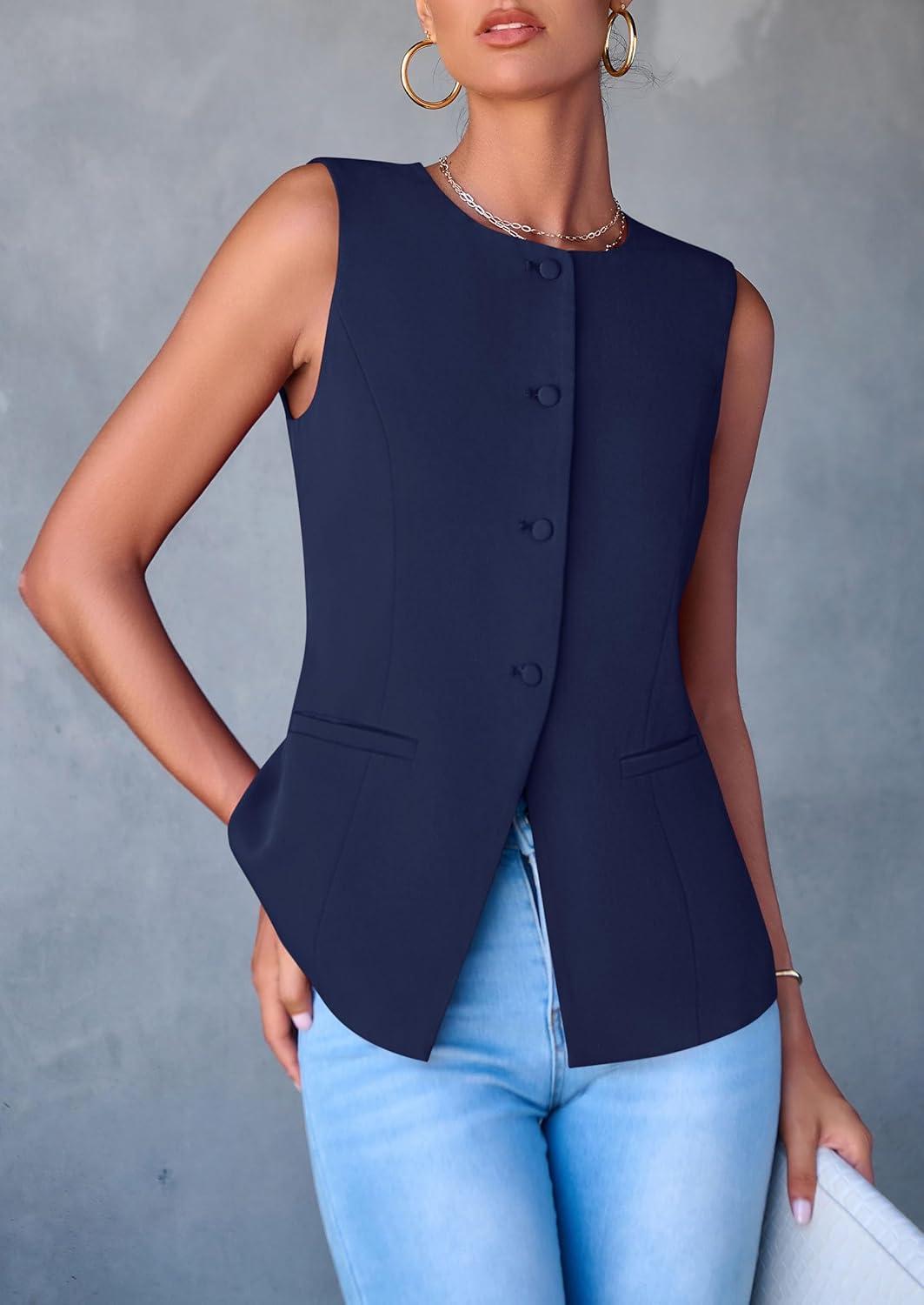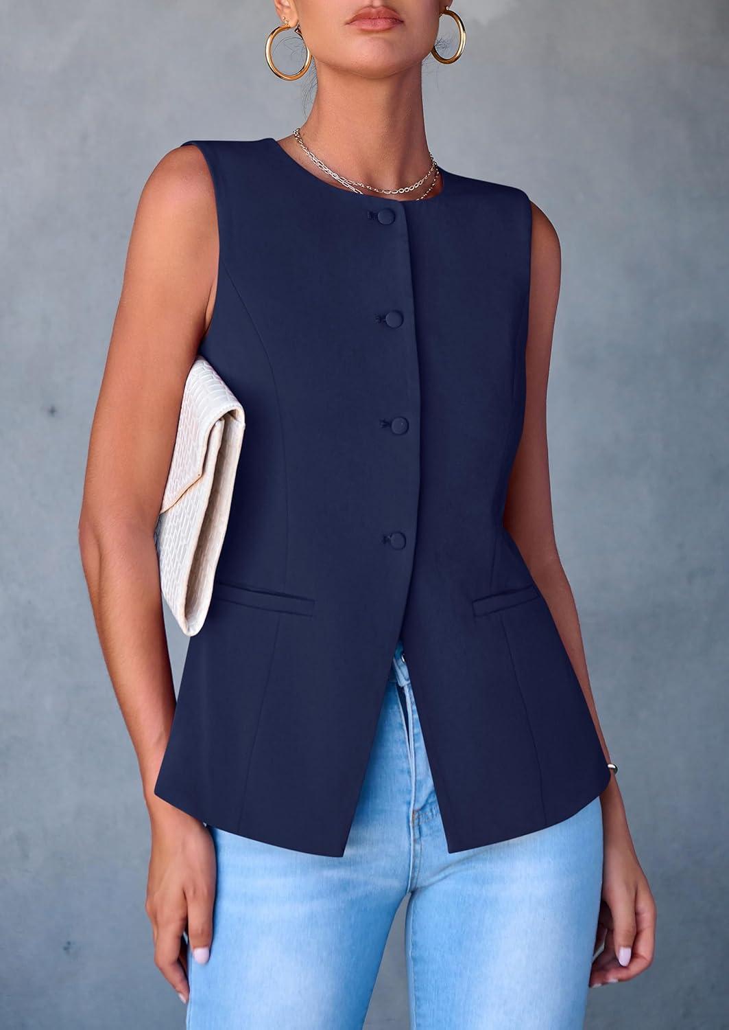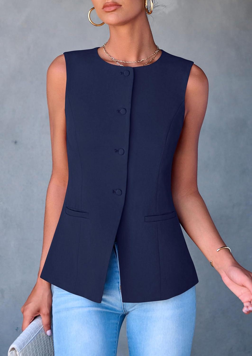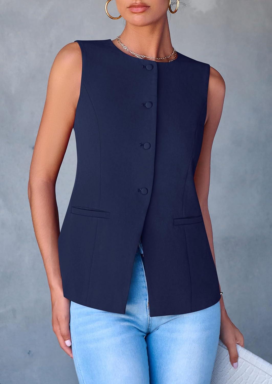 PRETTYGARDEN Women's Summer Suit Vest Tops 2025 Dressy Business Casual Sleeveless Button Down Trendy Fashion Blazer Waistcoat(Dark Blue)