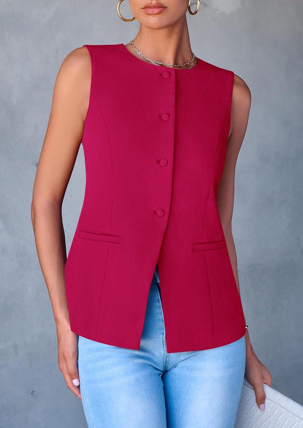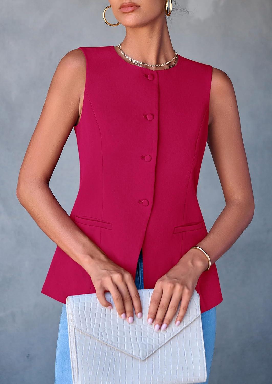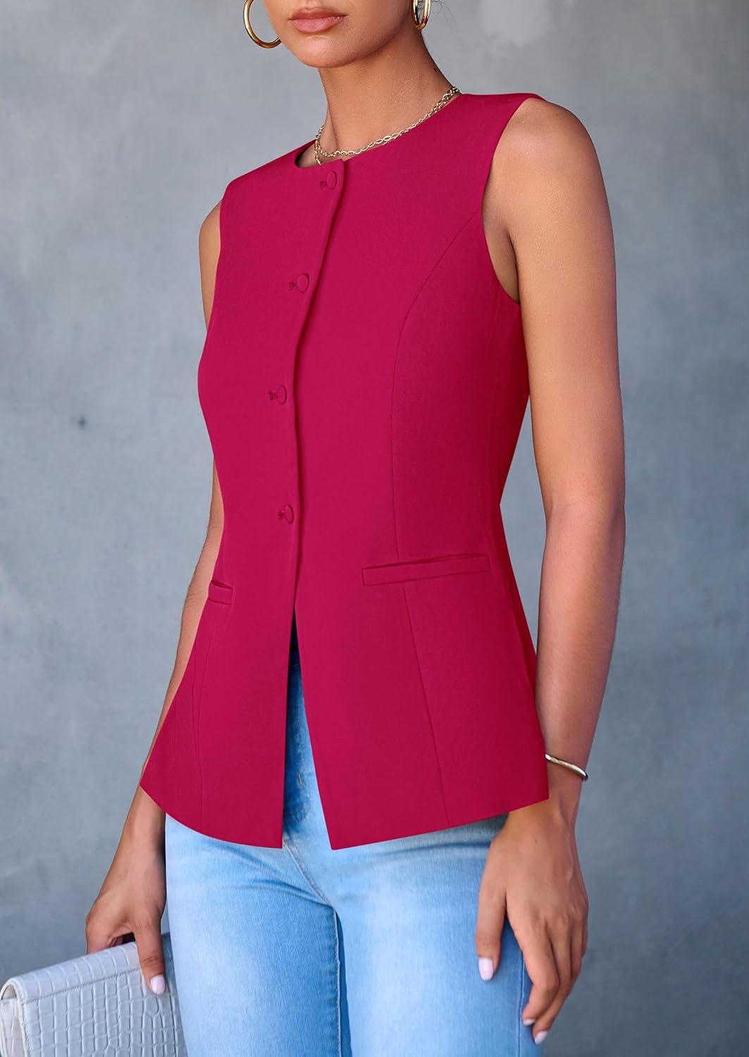 PRETTYGARDEN Women's Summer Suit Vest Tops 2025 Dressy Business Casual Sleeveless Button Down Trendy Fashion Blazer Waistcoat(Magenta)