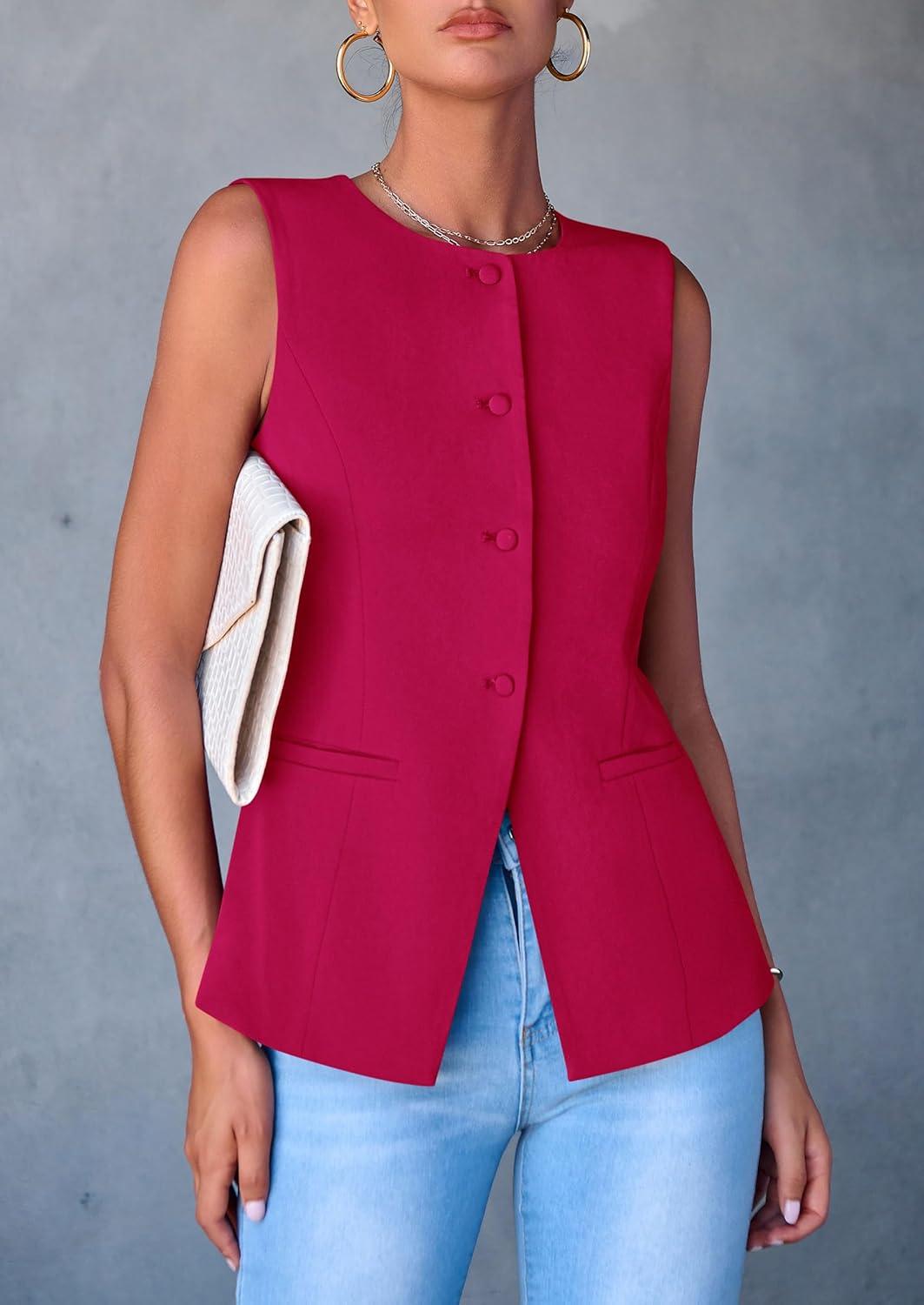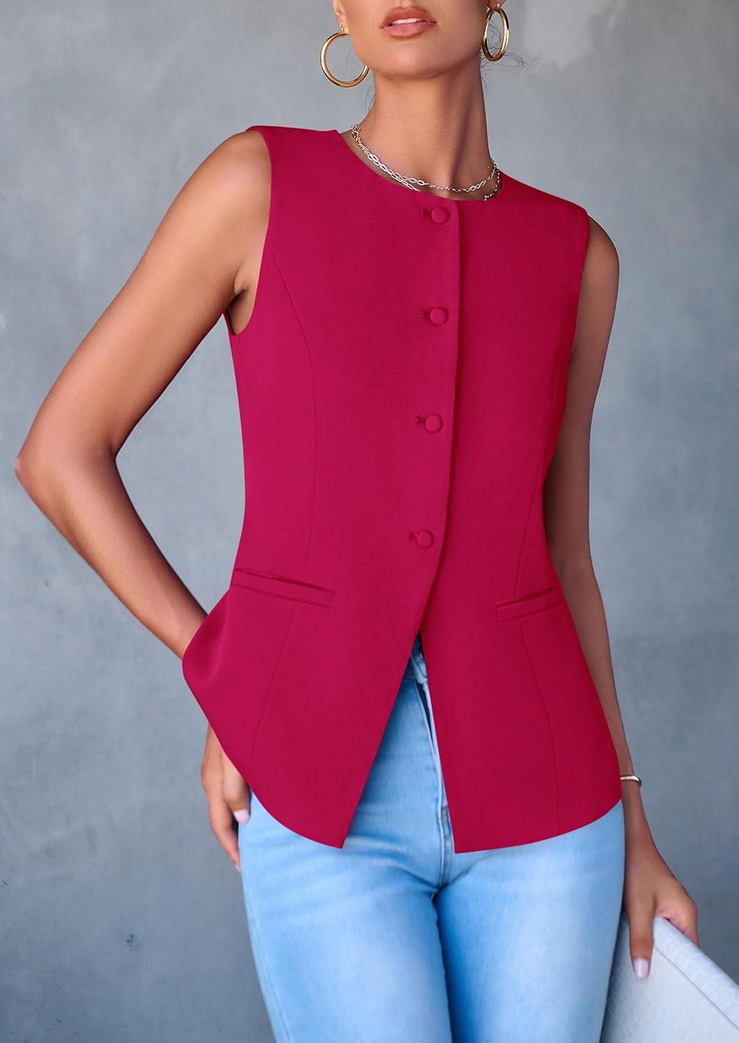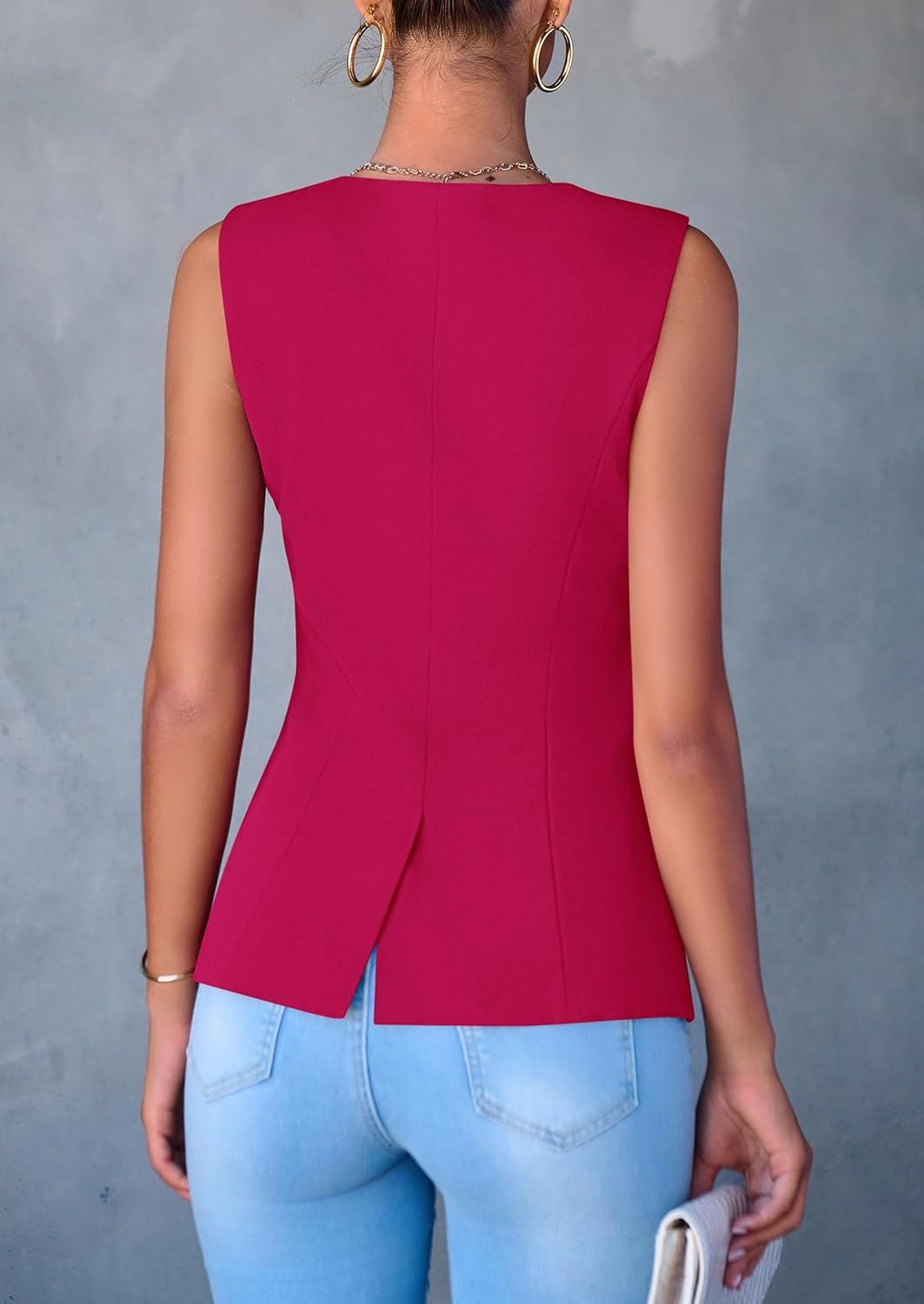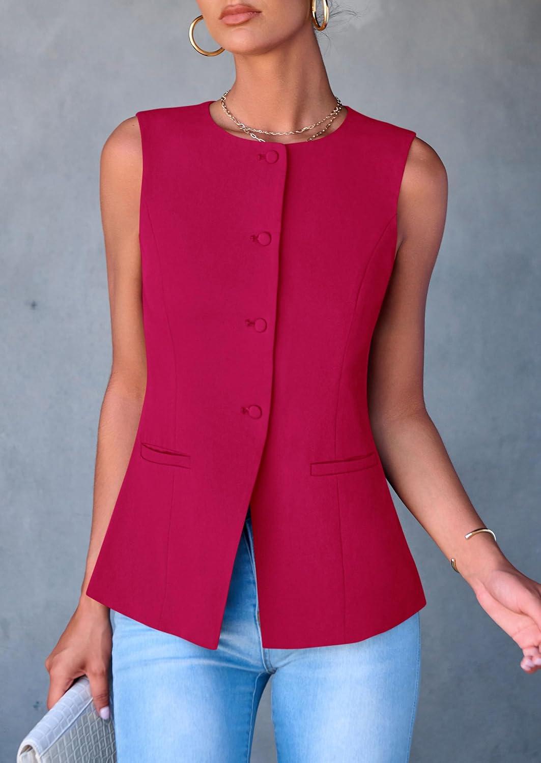 PRETTYGARDEN Women's Summer Suit Vest Tops 2025 Dressy Business Casual Sleeveless Button Down Trendy Fashion Blazer Waistcoat(Magenta)