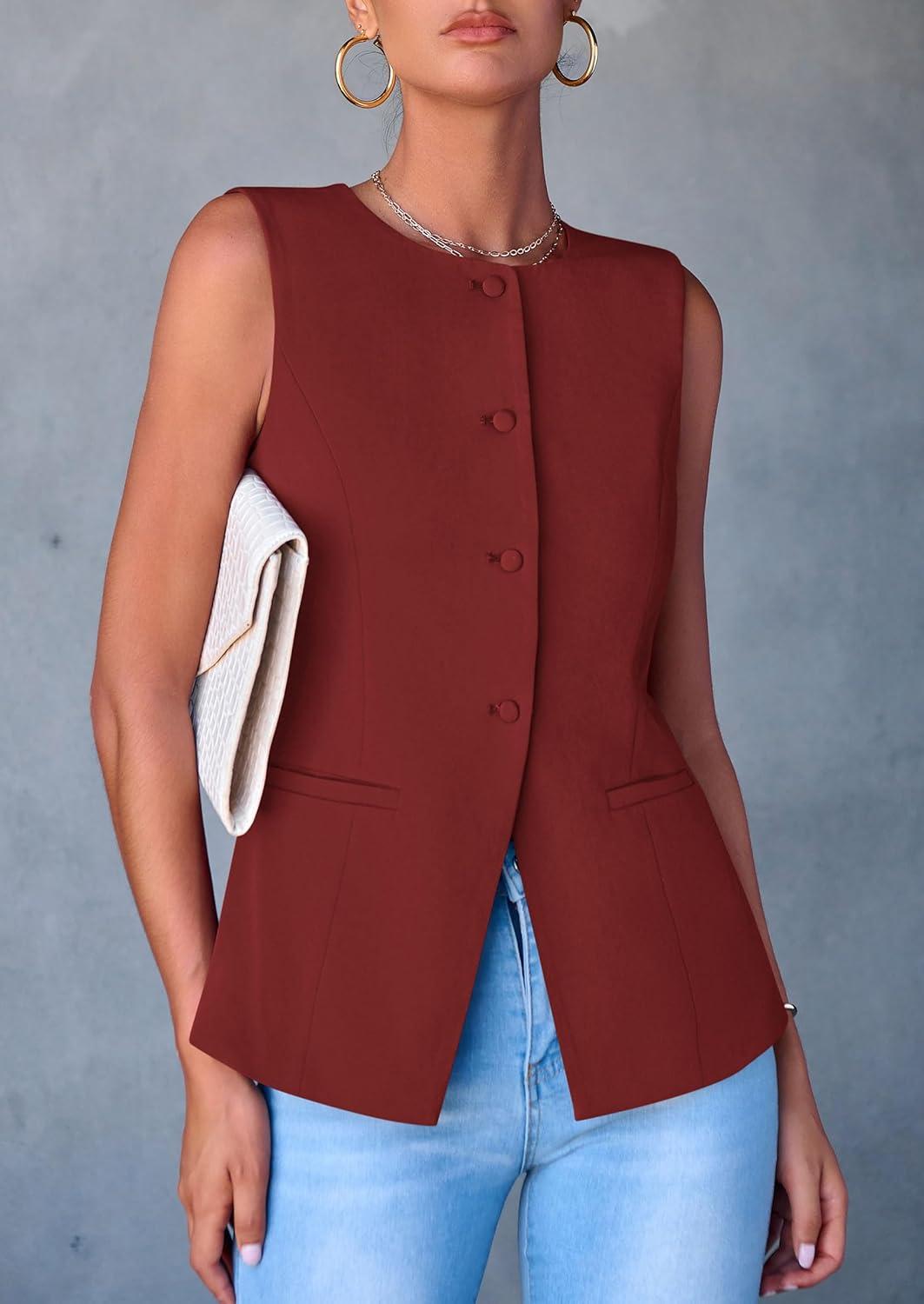 PRETTYGARDEN Women's Summer Suit Vest Tops 2025 Dressy Business Casual Sleeveless Button Down Trendy Fashion Blazer Waistcoat(Orange Red)
