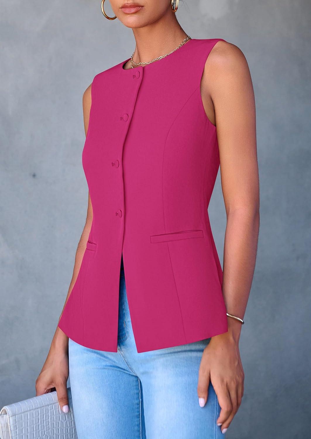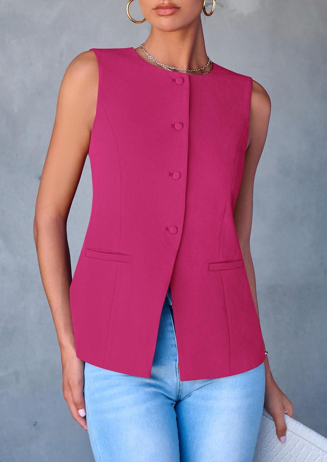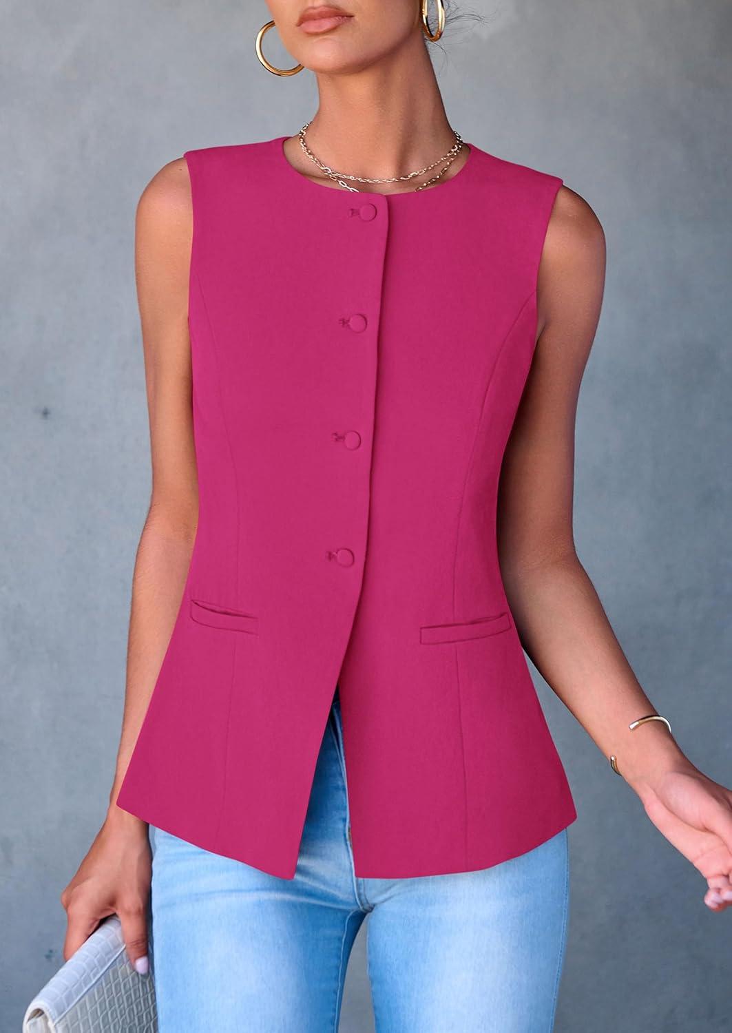 PRETTYGARDEN Women’s Summer Suit Vest Tops 2025 Dressy Business Casual Sleeveless Button Down Trendy Fashion Blazer Waistcoat(Rose Red)