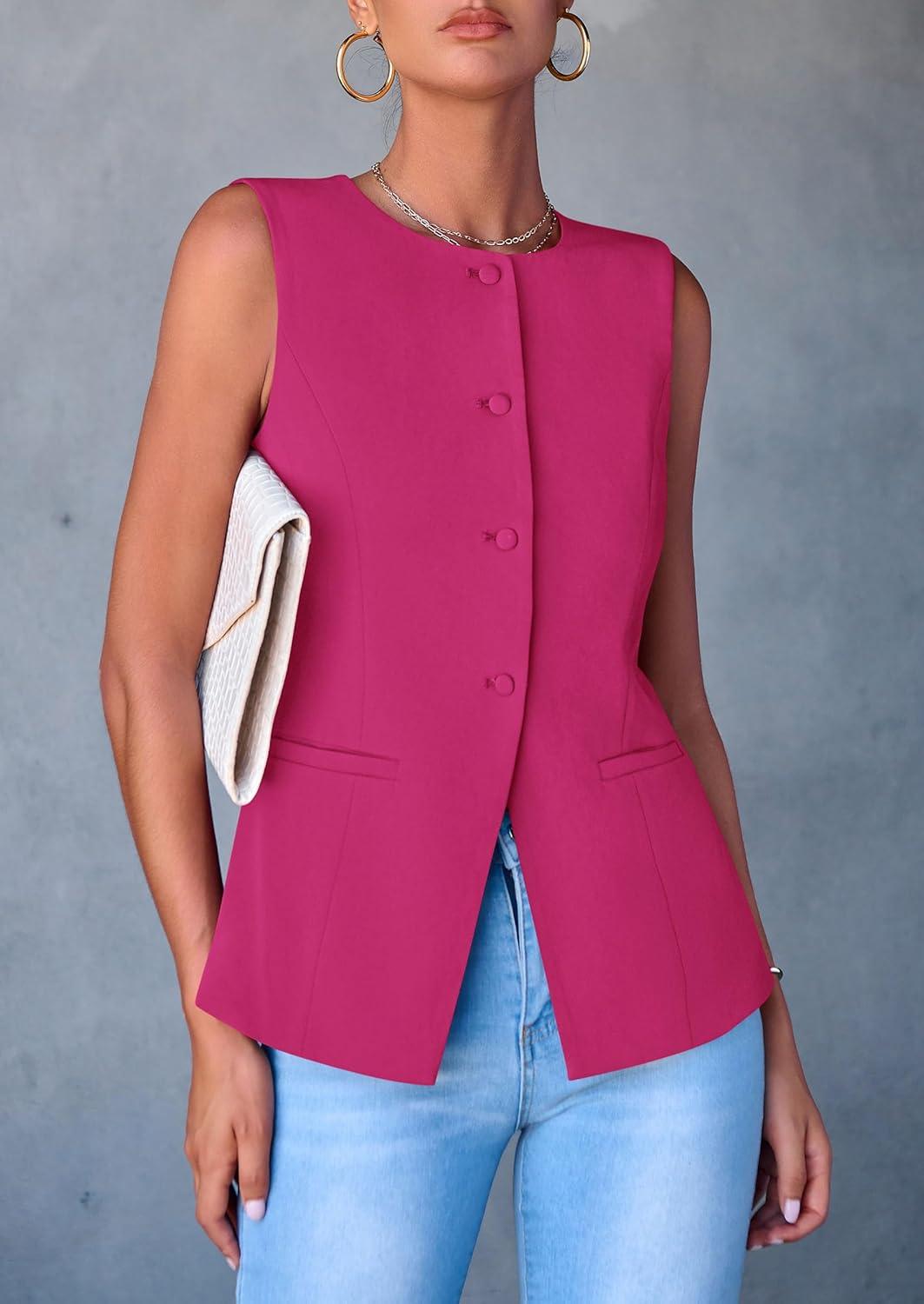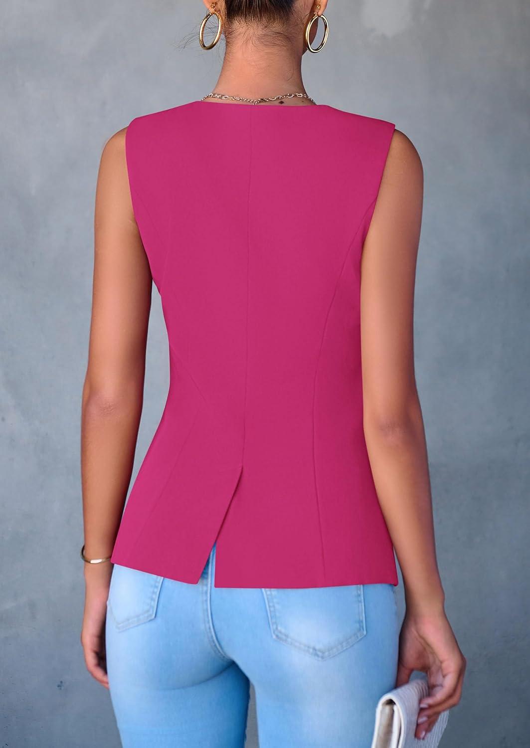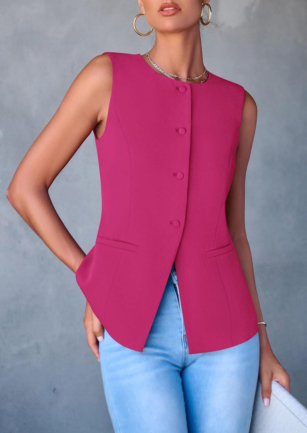 PRETTYGARDEN Women’s Summer Suit Vest Tops 2025 Dressy Business Casual Sleeveless Button Down Trendy Fashion Blazer Waistcoat(Rose Red)