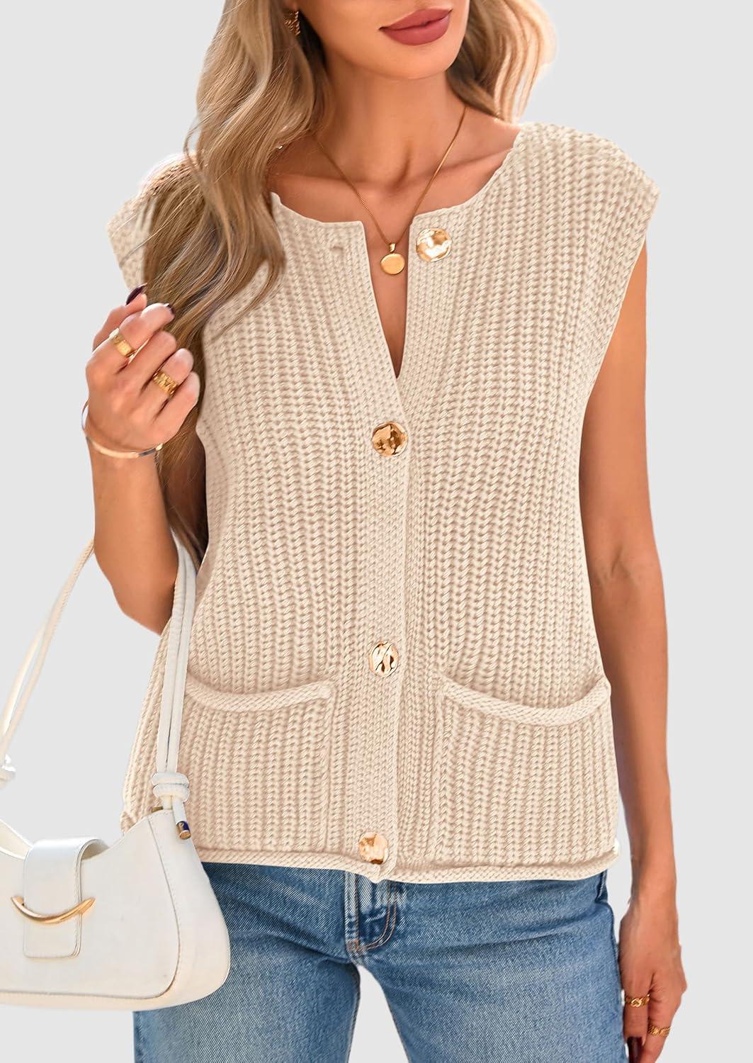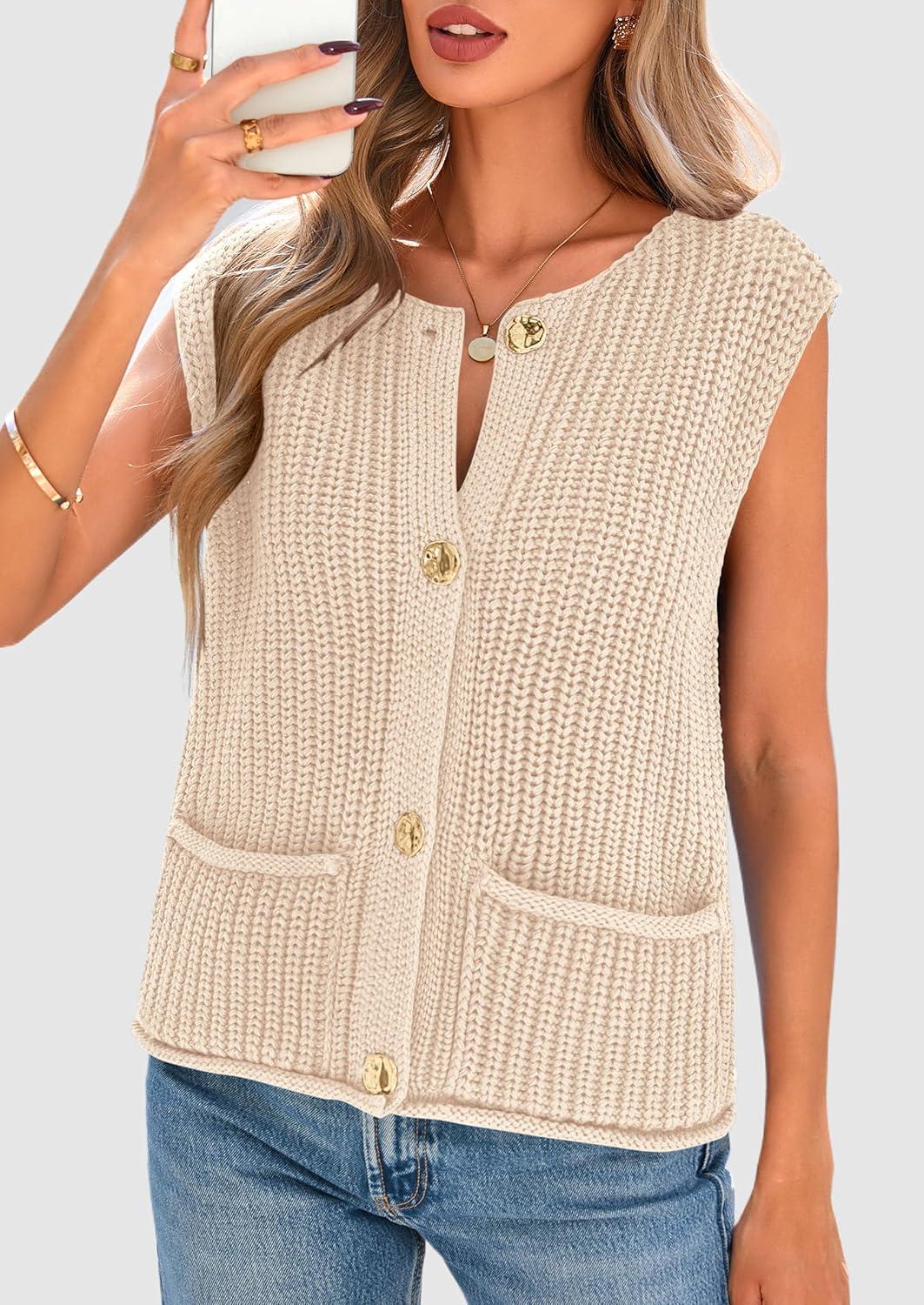 PRETTYGARDEN Women’s Summer Sweaters Vest 2025 Sleeveless Button Down Cropped Pockets Chunky Knit Cardigan Trendy Tank Tops(Beige)