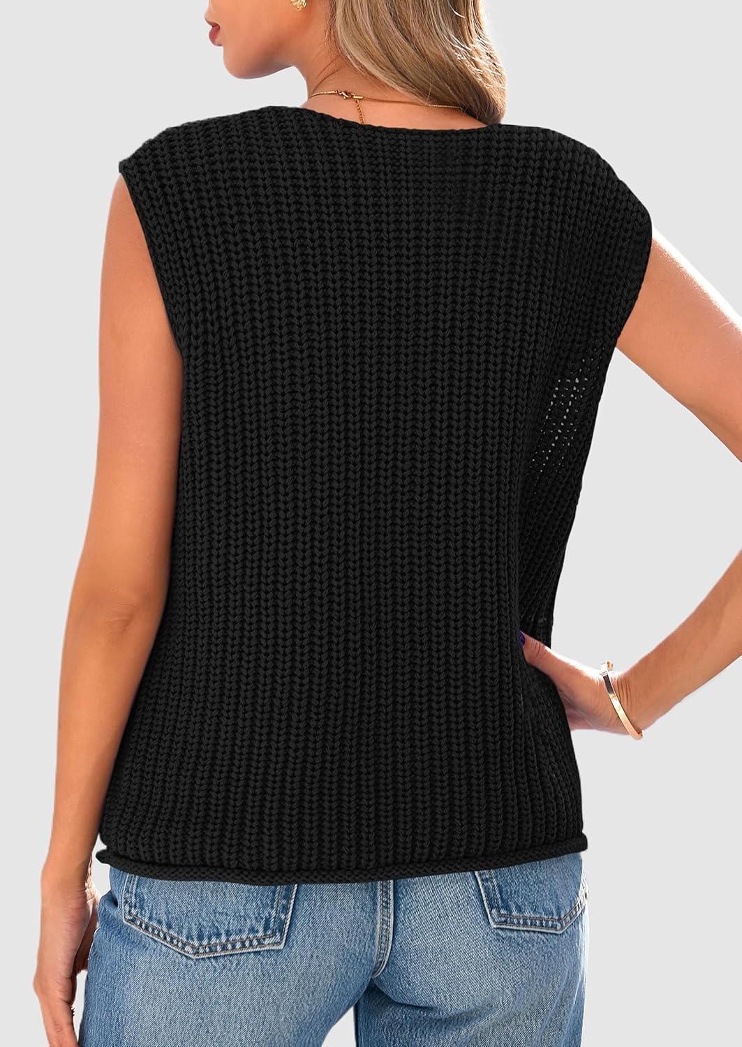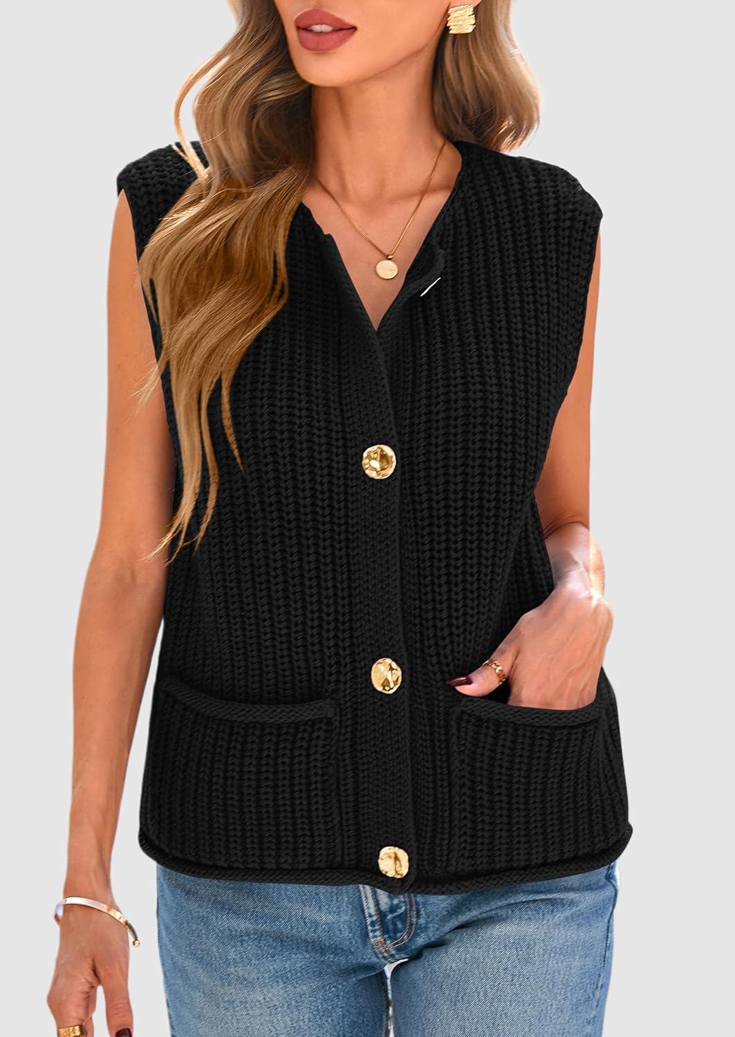 imagePRETTYGARDEN Womens Summer Sweaters Vest 2025 Sleeveless Button Down Cropped Pockets Chunky Knit Cardigan Trendy Tank TopsBlack