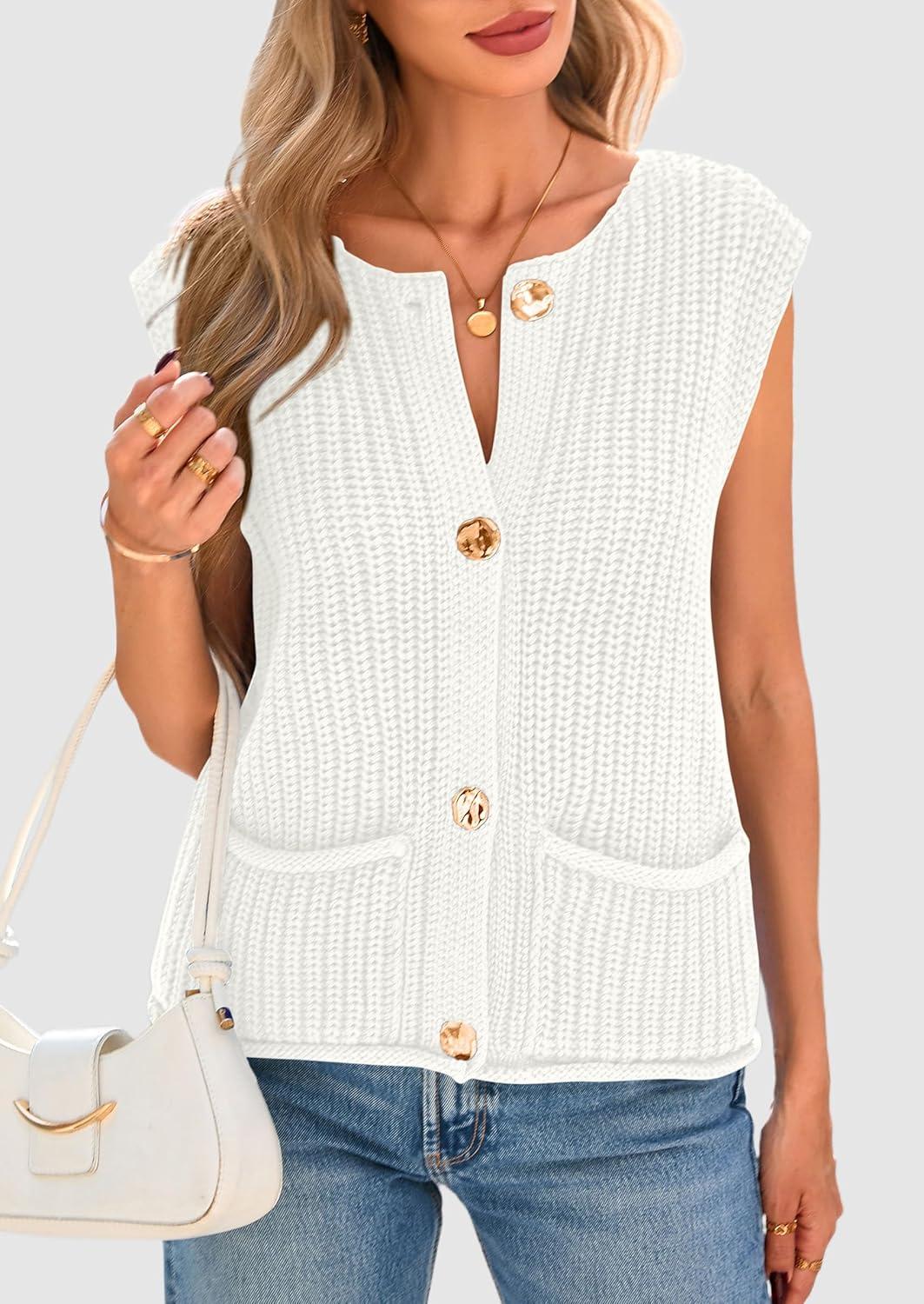imagePRETTYGARDEN Womens Summer Sweaters Vest 2025 Sleeveless Button Down Cropped Pockets Chunky Knit Cardigan Trendy Tank TopsWhite
