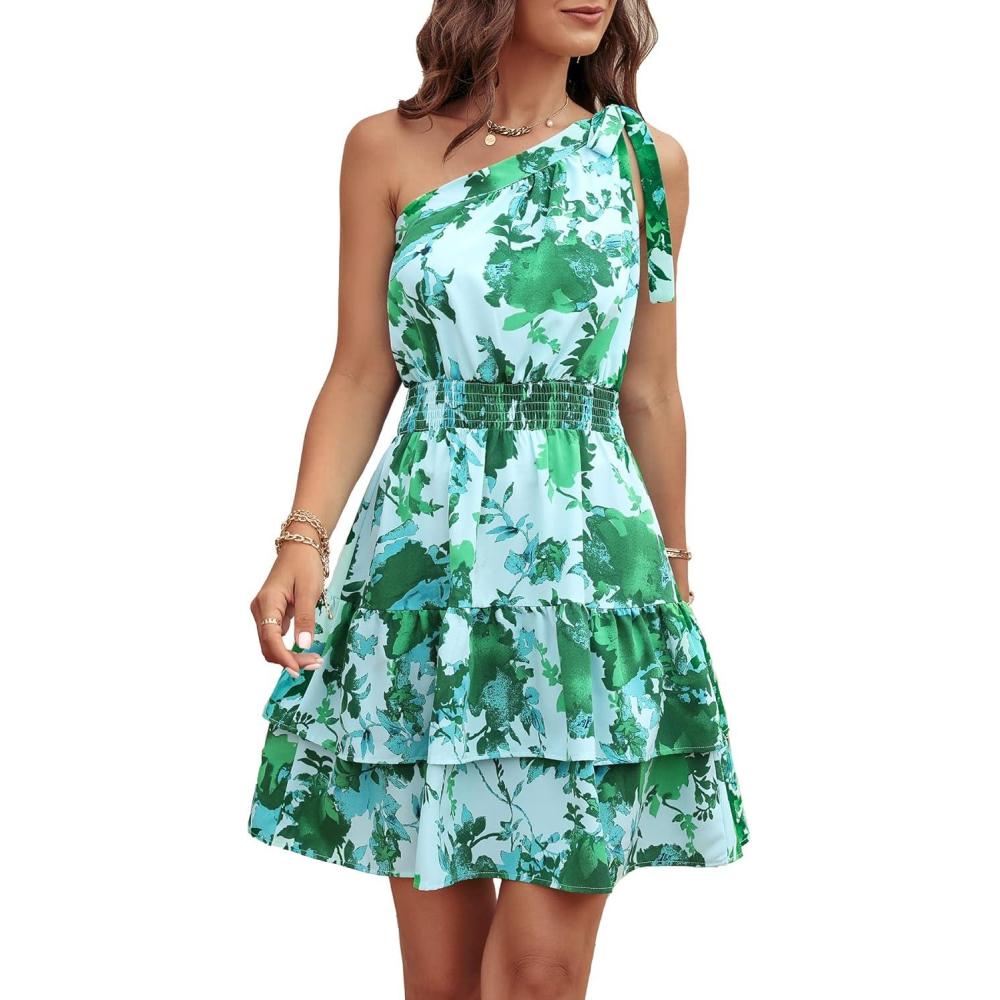PRETTYGARDEN Women’s Summer Tie One Shoulder Boho Floral Dress Elastic Waist Tiered Ruffle A Line Flowy Mini Dresses(Print Green)