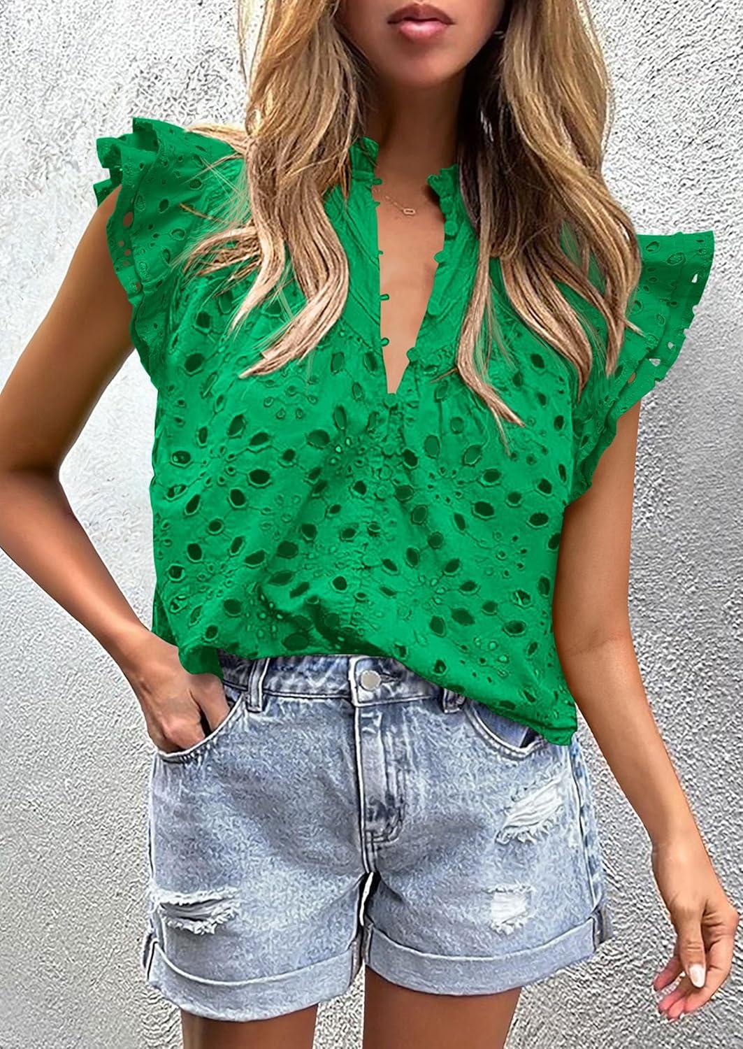 PRETTYGARDEN Womens Summer Tops 2025 Dressy Casual Ruffle Cap Sleeve Button V Neck Embroidered Eyelet Blouses Shirts(Green)