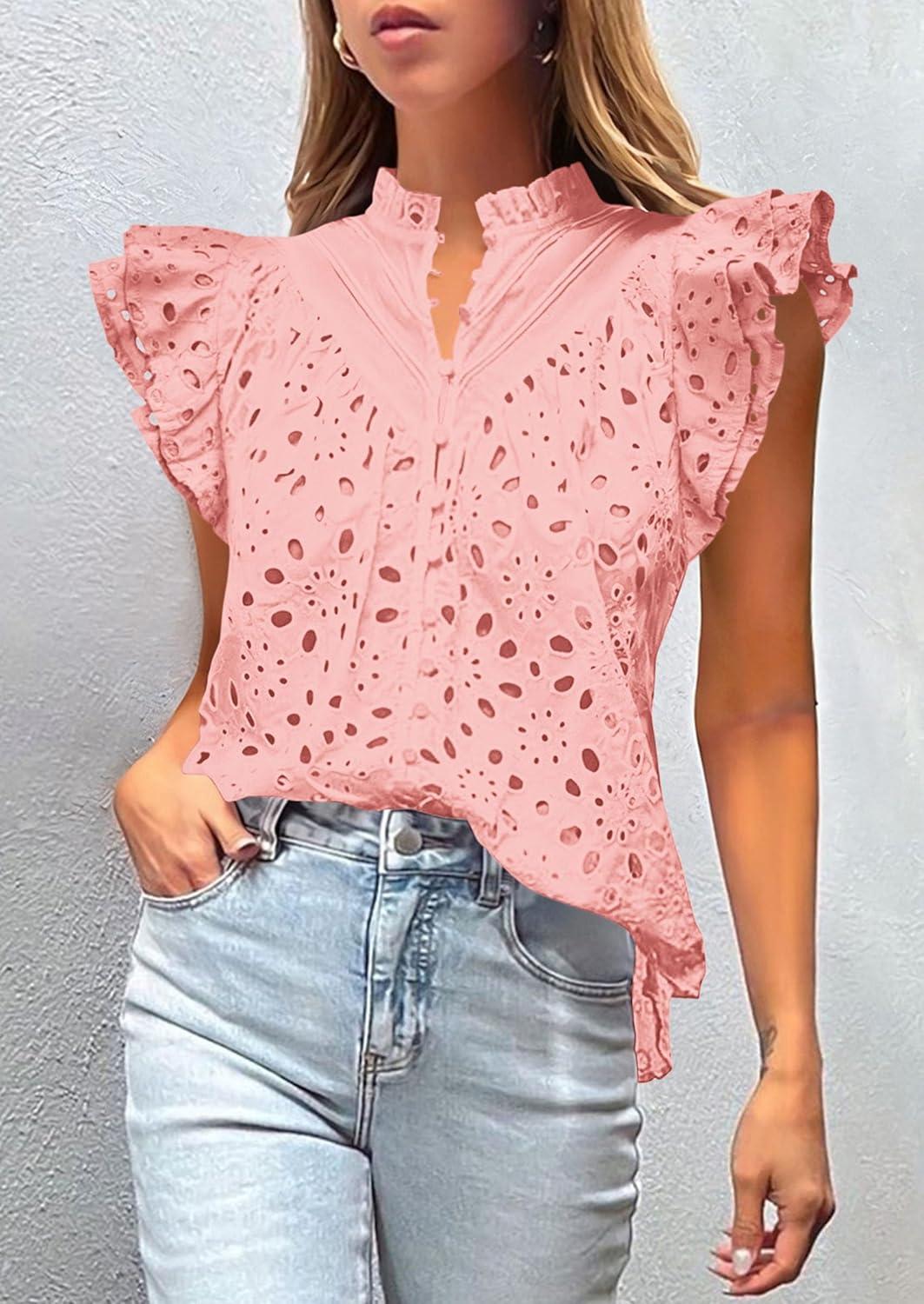 PRETTYGARDEN Womens Summer Tops 2025 Dressy Casual Ruffle Cap Sleeve Button V Neck Embroidered Eyelet Blouses Shirts(Pink)