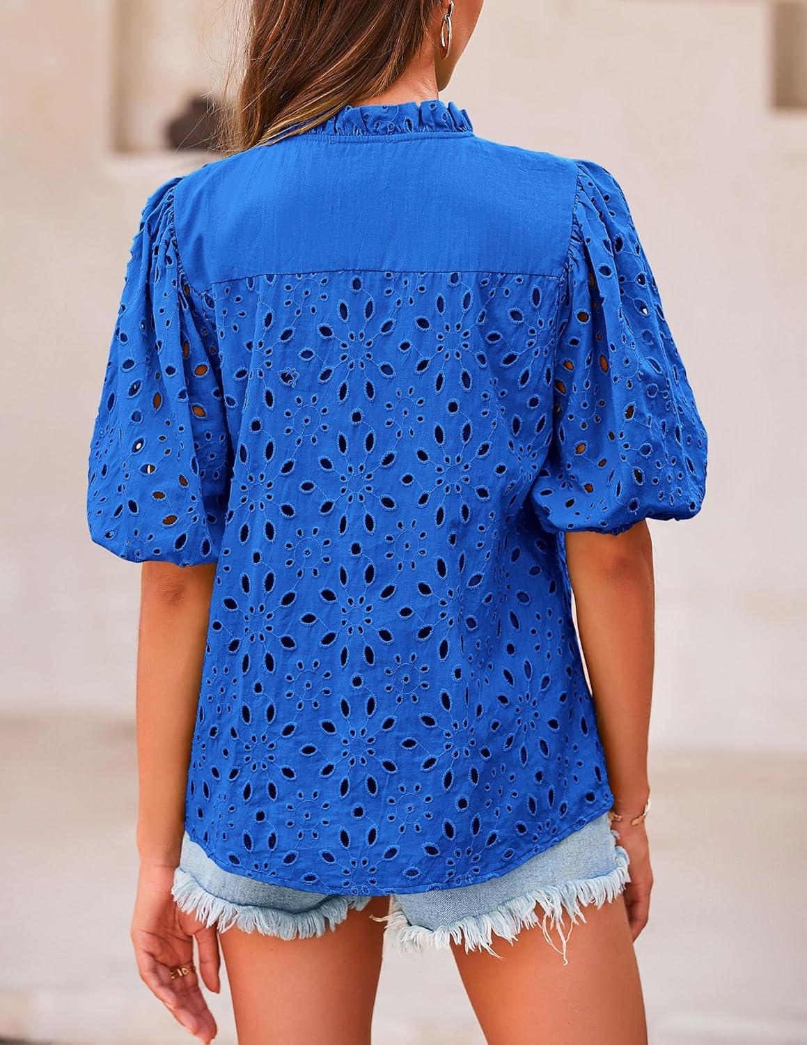 PRETTYGARDEN Women's Summer Tops 2025 Dressy Casual Short Sleeve V Neck Buttons Hollow Out Lace Embroidered Blouses Shirts(Blue)
