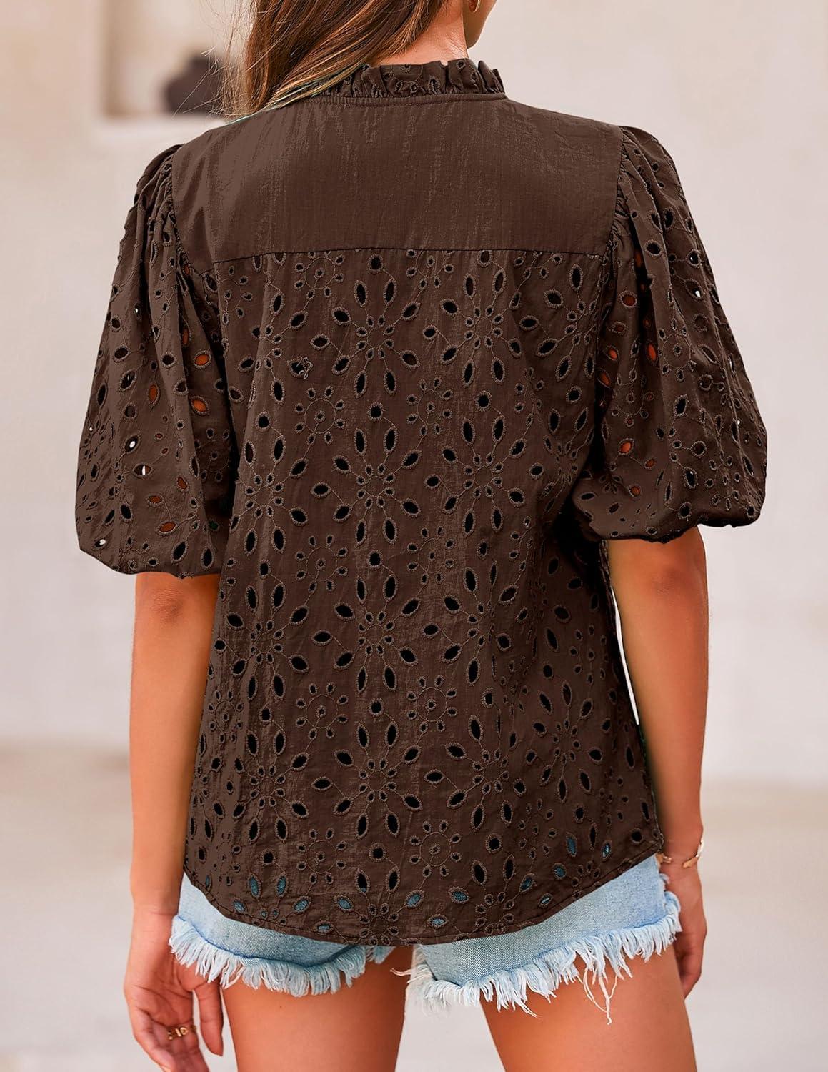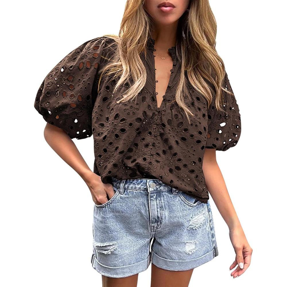 PRETTYGARDEN Women's Summer Tops 2025 Dressy Casual Short Sleeve V Neck Buttons Hollow Out Lace Embroidered Blouses Shirts(Coffee)