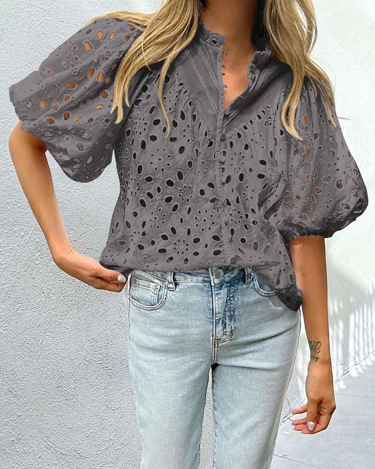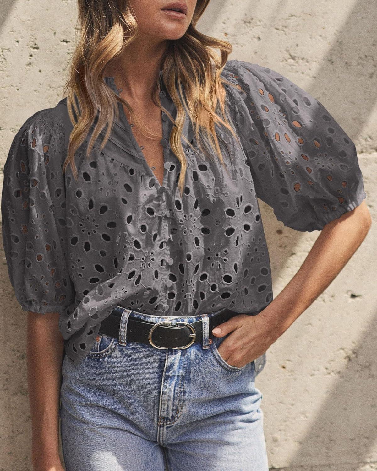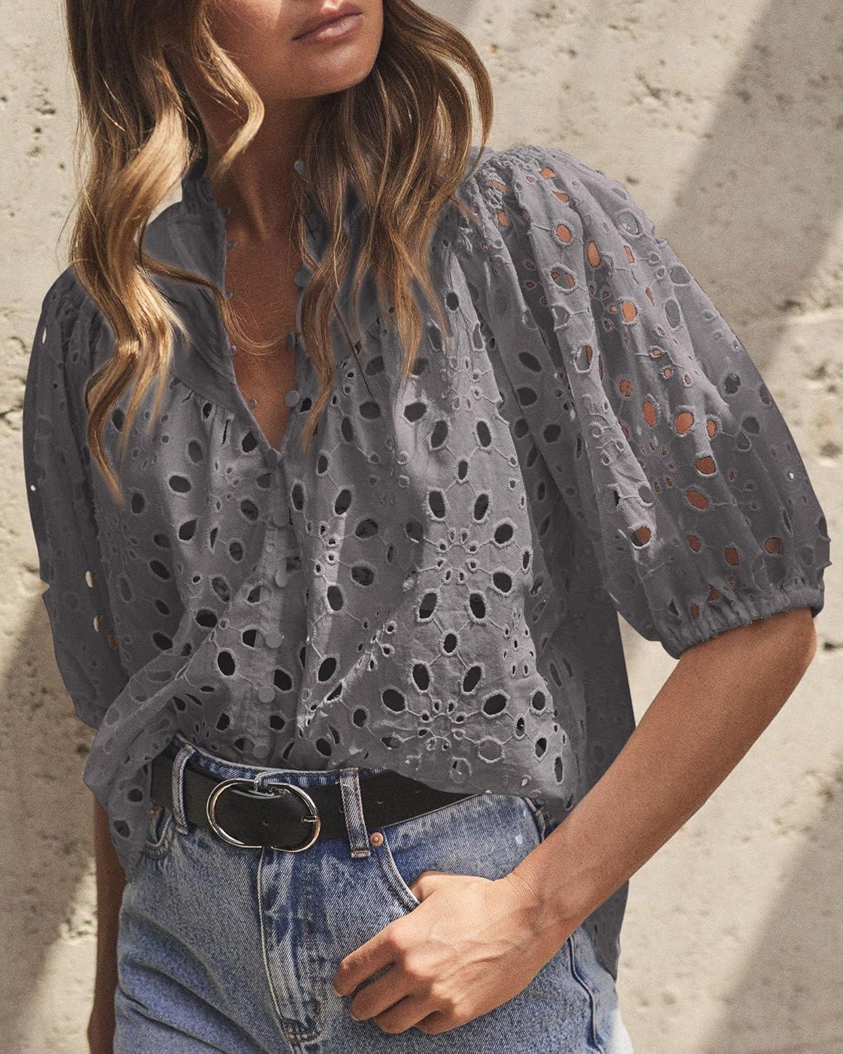 PRETTYGARDEN Women's Summer Tops 2025 Dressy Casual Short Sleeve V Neck Buttons Hollow Out Lace Embroidered Blouses Shirts(Dark Grey)