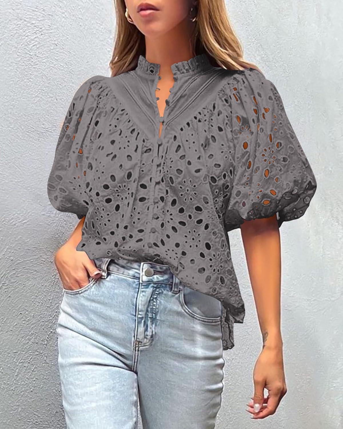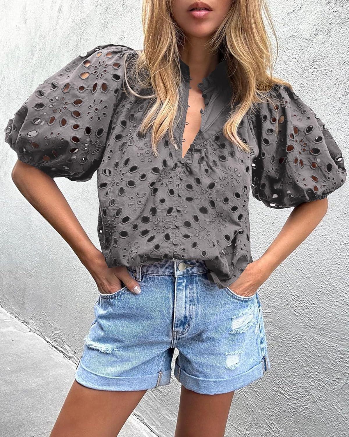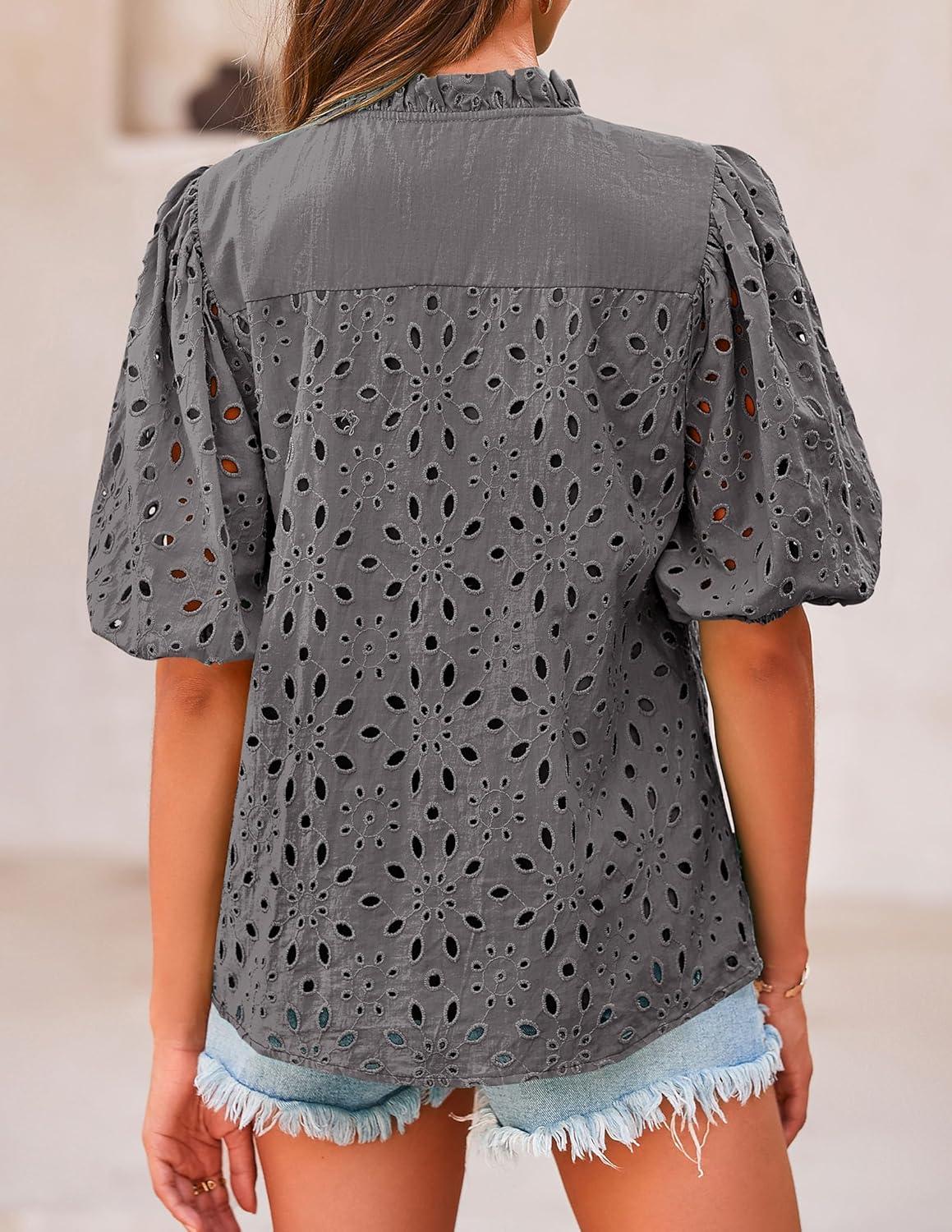 PRETTYGARDEN Women's Summer Tops 2025 Dressy Casual Short Sleeve V Neck Buttons Hollow Out Lace Embroidered Blouses Shirts(Dark Grey)