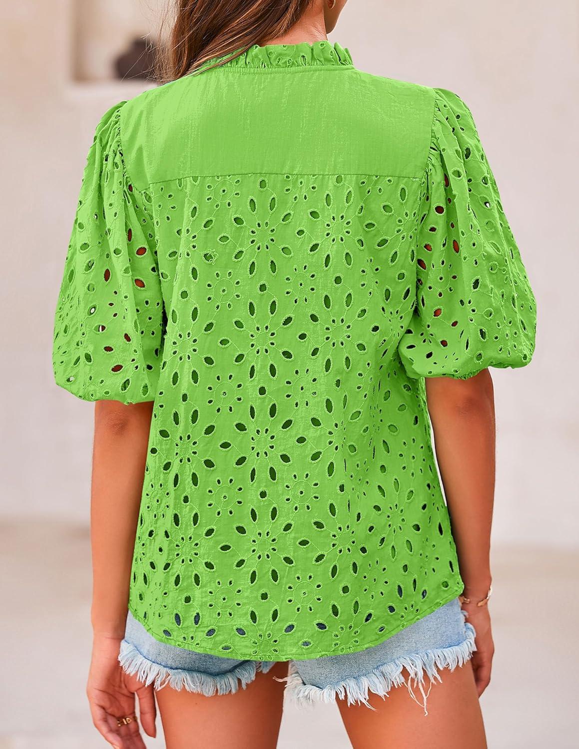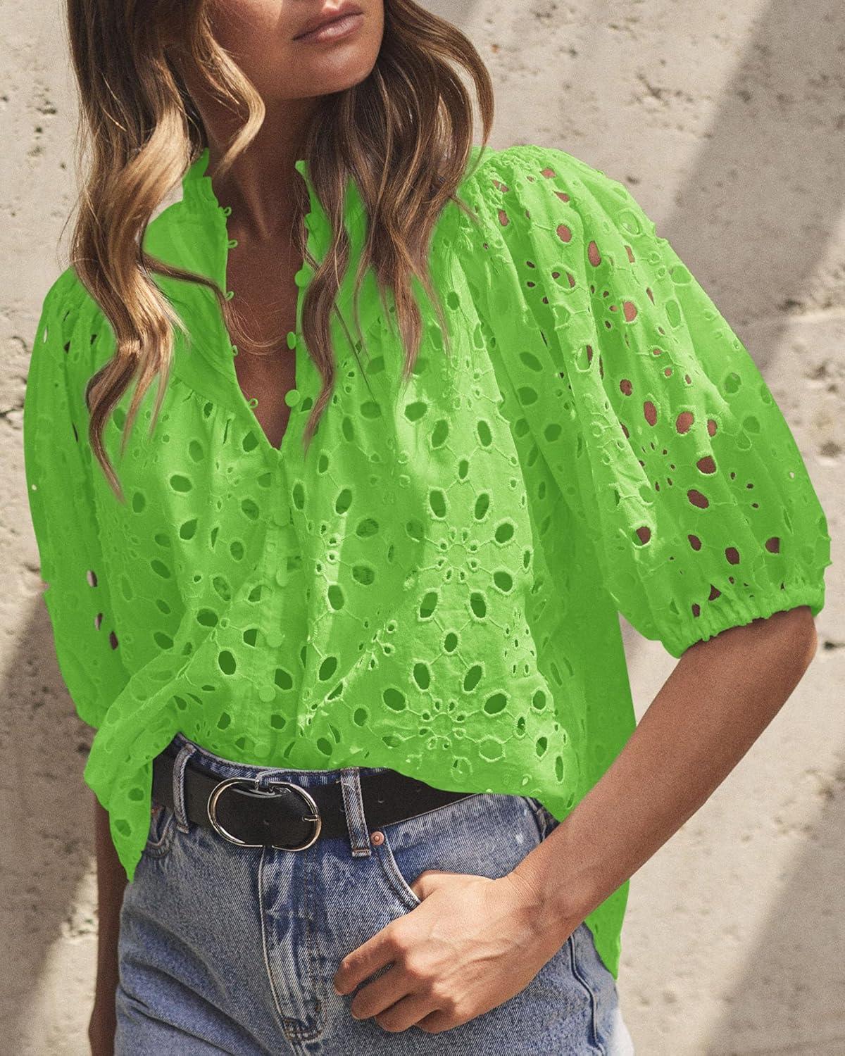 PRETTYGARDEN Women's Summer Tops 2025 Dressy Casual Short Sleeve V Neck Buttons Hollow Out Lace Embroidered Blouses Shirts(Grass Green)