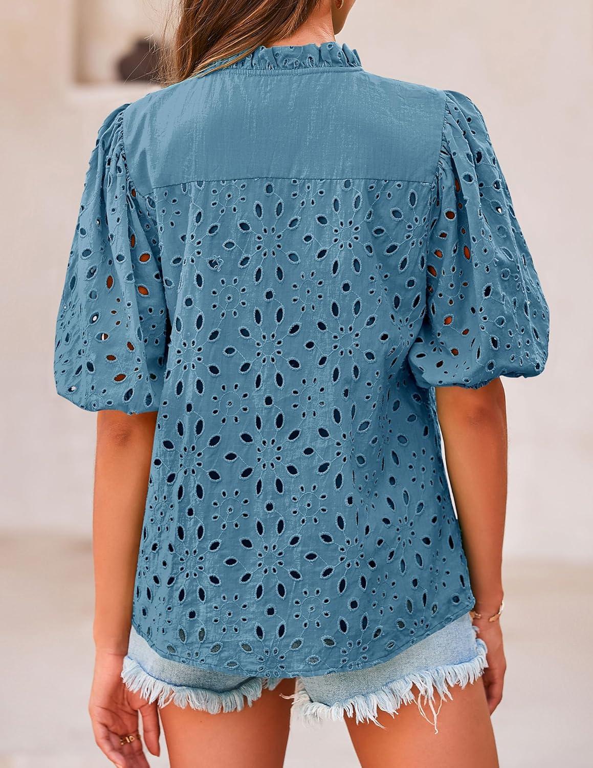 PRETTYGARDEN Women's Summer Tops 2025 Dressy Casual Short Sleeve V Neck Buttons Hollow Out Lace Embroidered Blouses Shirts(Grey Blue)
