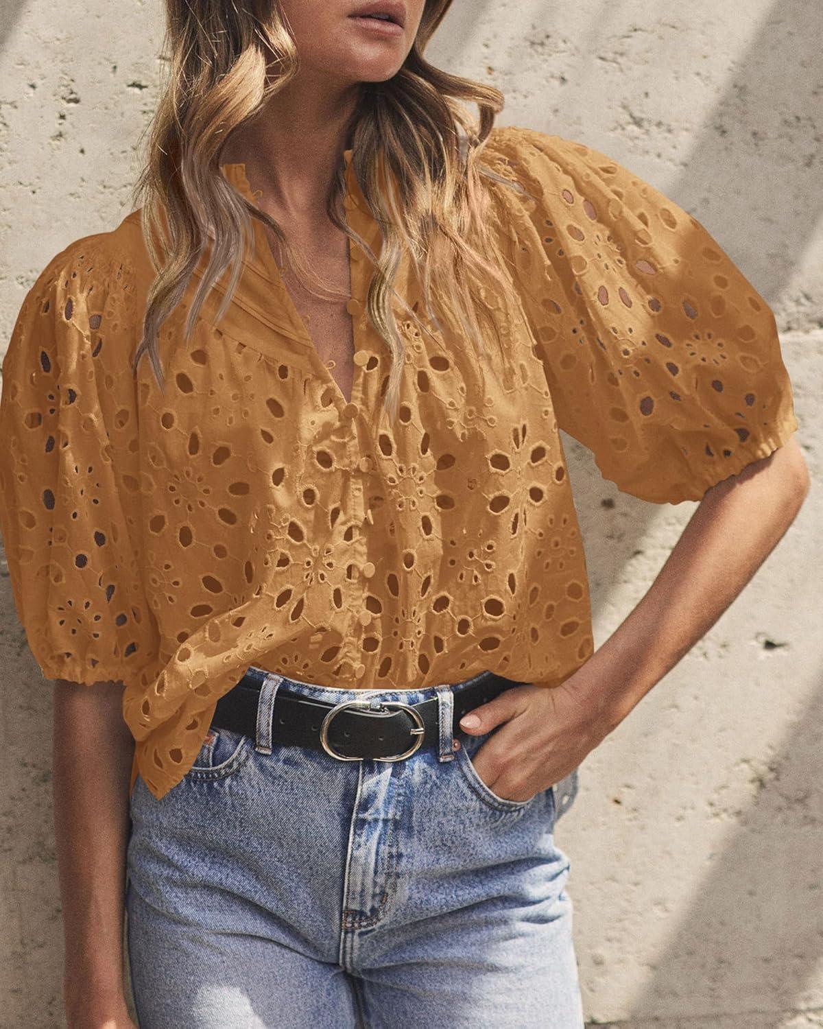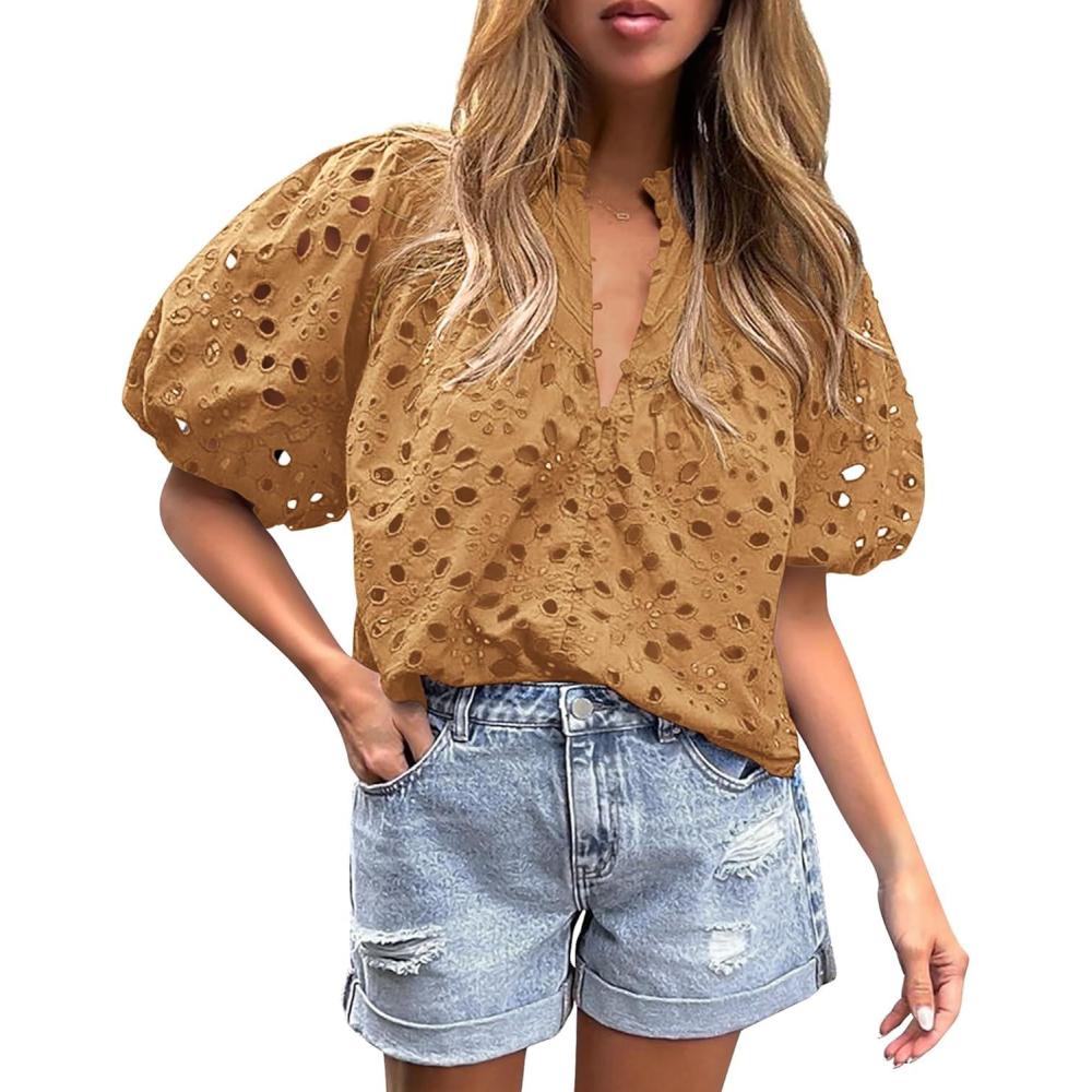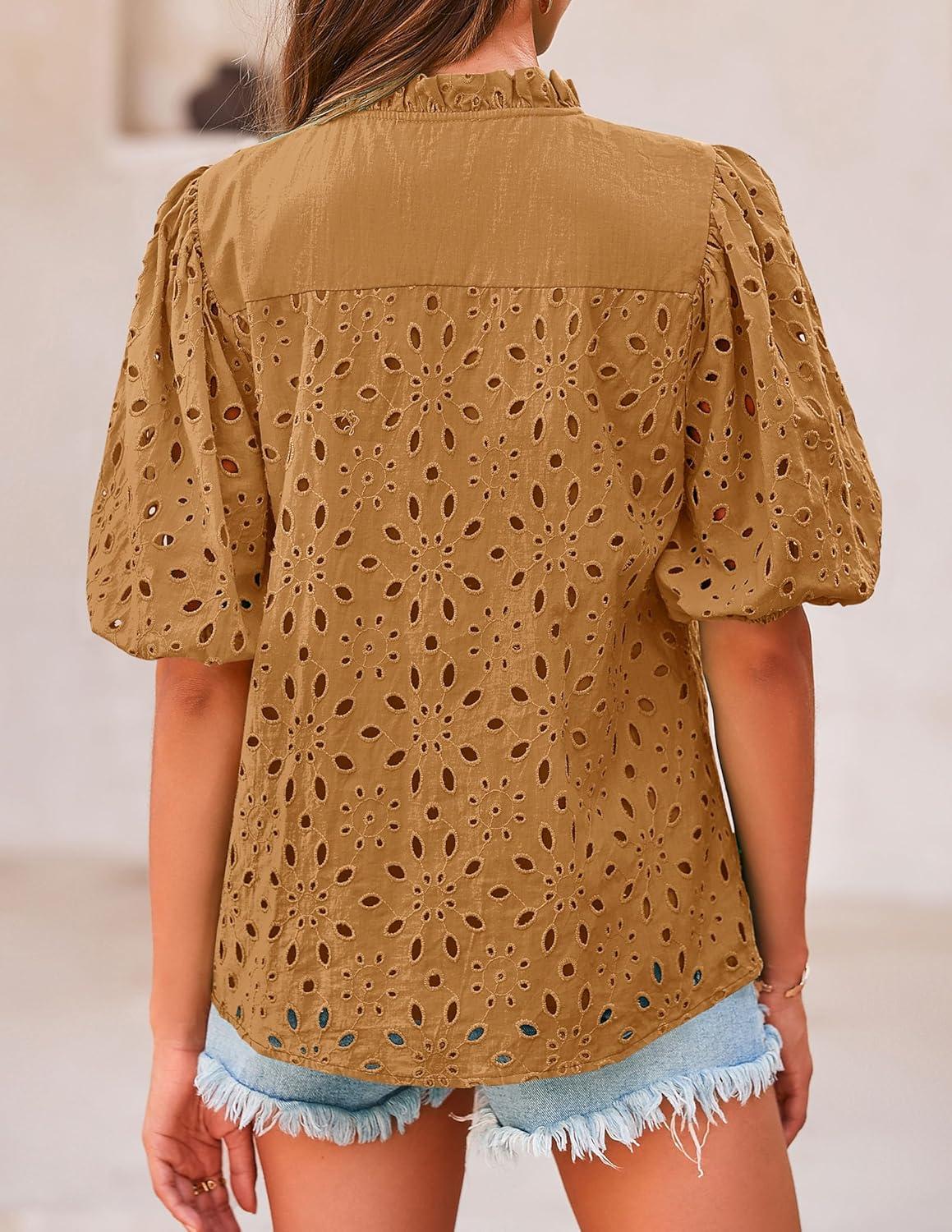 PRETTYGARDEN Women's Summer Tops 2025 Dressy Casual Short Sleeve V Neck Buttons Hollow Out Lace Embroidered Blouses Shirts(Khaki)