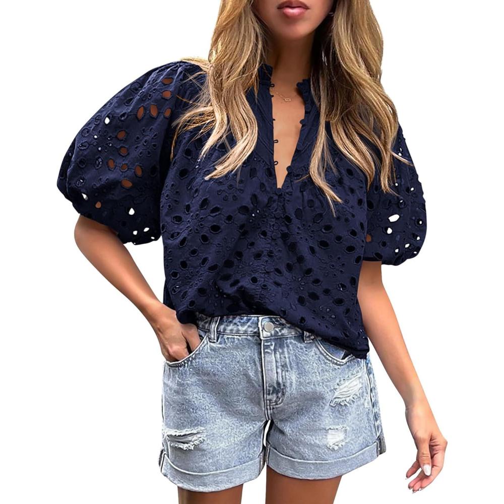 PRETTYGARDEN Women's Summer Tops 2025 Dressy Casual Short Sleeve V Neck Buttons Hollow Out Lace Embroidered Blouses Shirts(Navy)