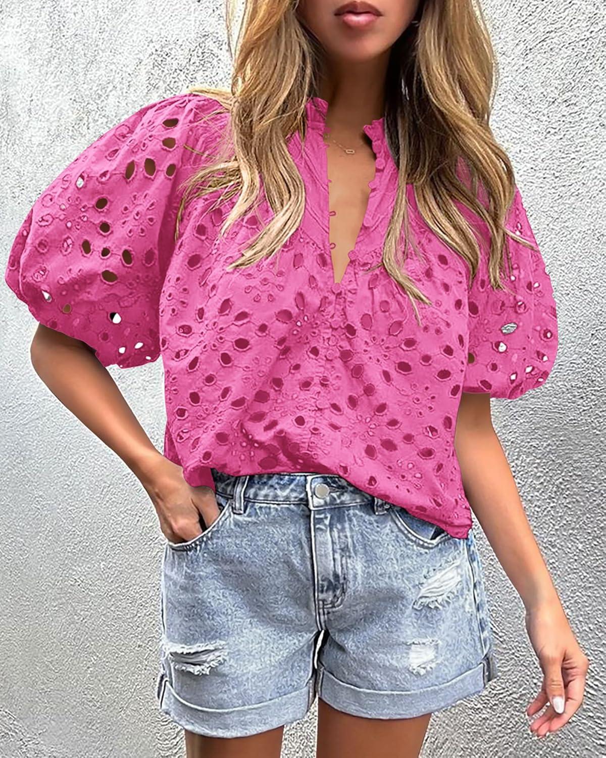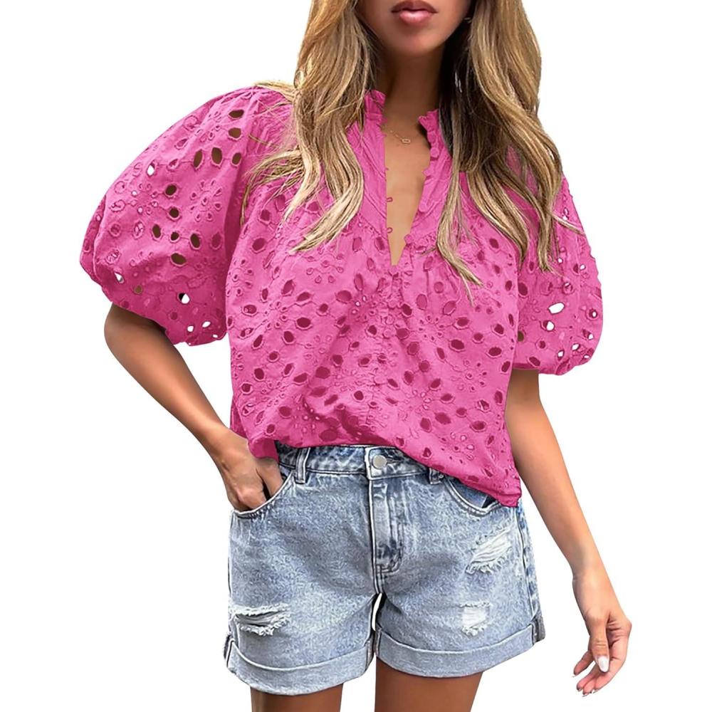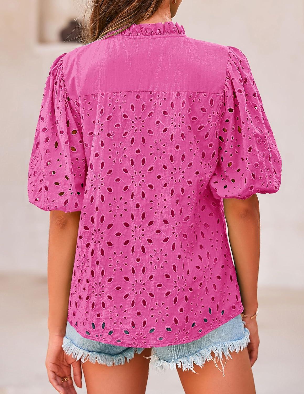 PRETTYGARDEN Women's Summer Tops 2025 Dressy Casual Short Sleeve V Neck Buttons Hollow Out Lace Embroidered Blouses Shirts(Rose Pink)