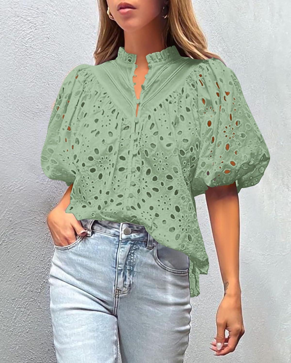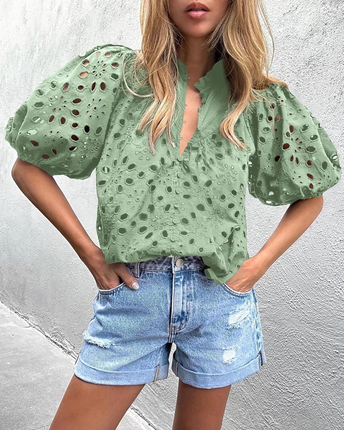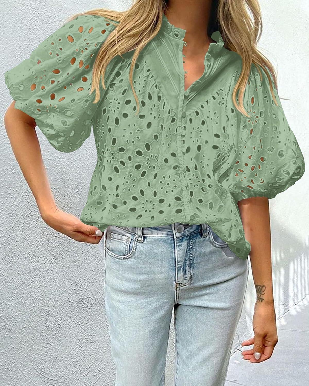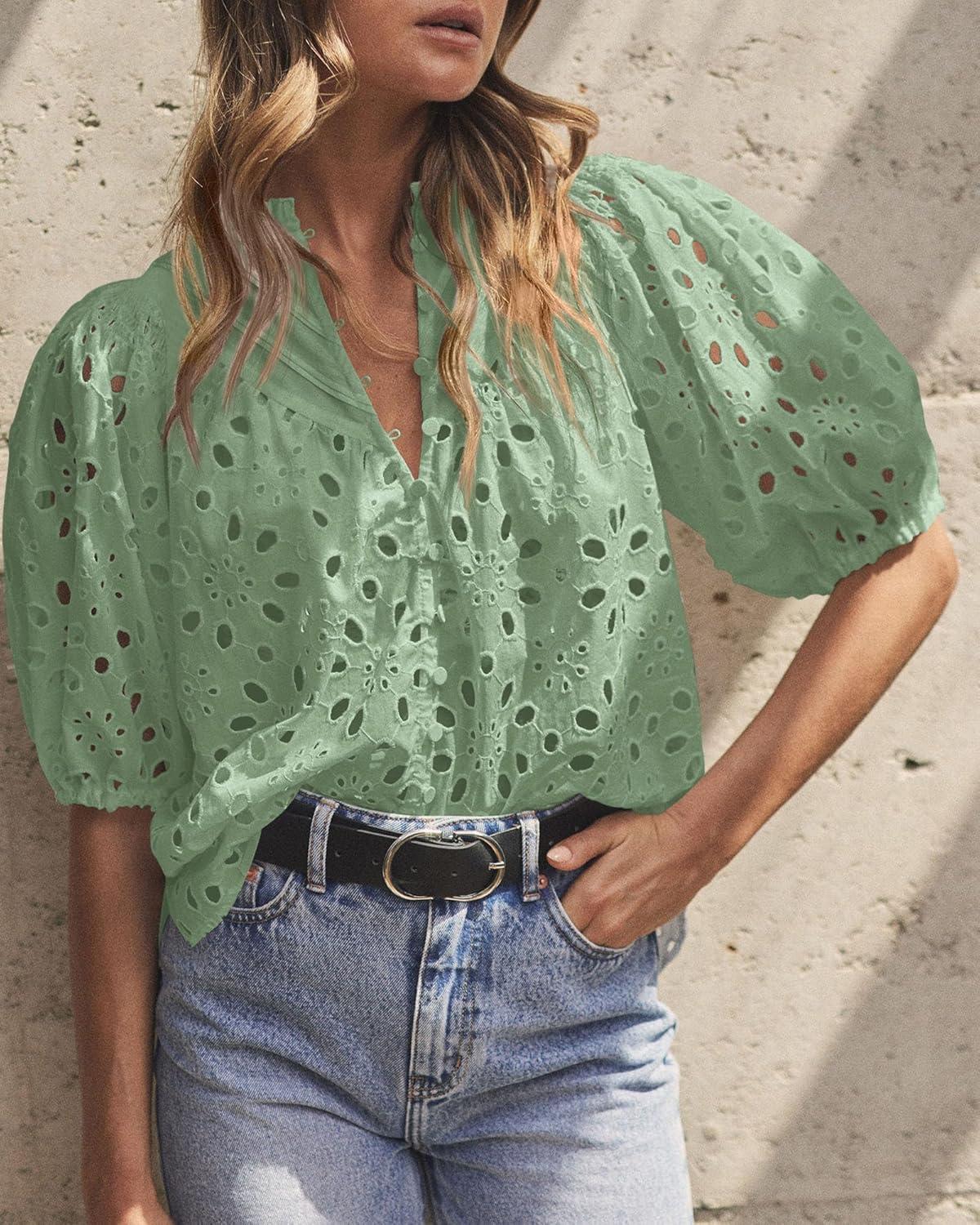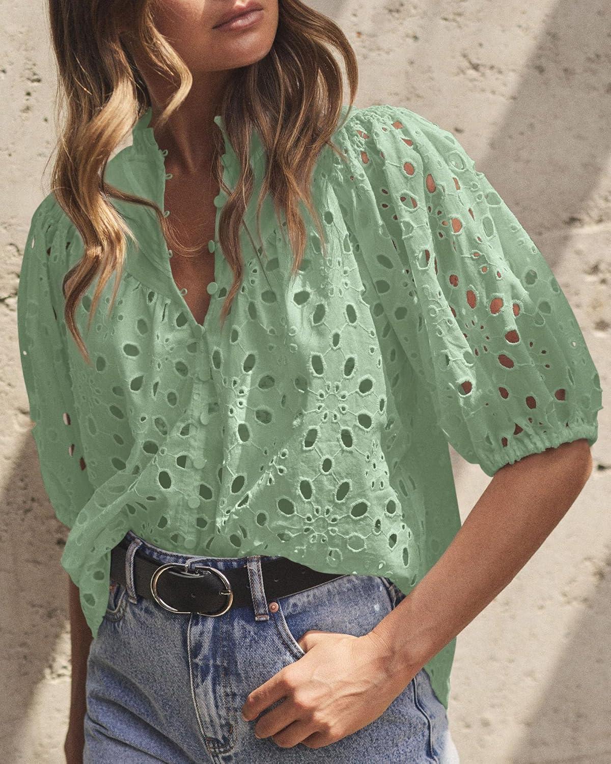 imagePRETTYGARDEN Womens Summer Tops 2025 Dressy Casual Short Sleeve V Neck Buttons Hollow Out Lace Embroidered Blouses ShirtsSage Green