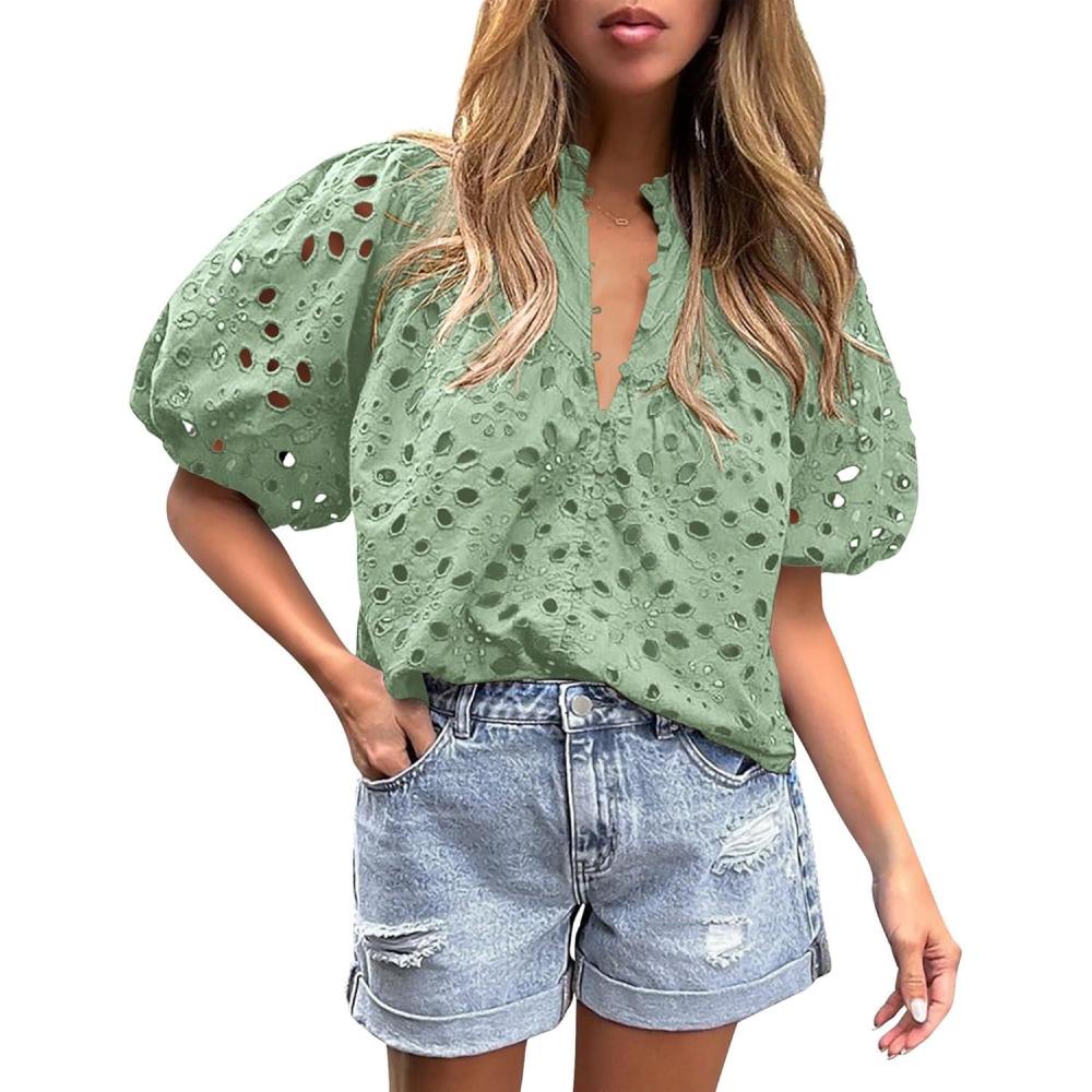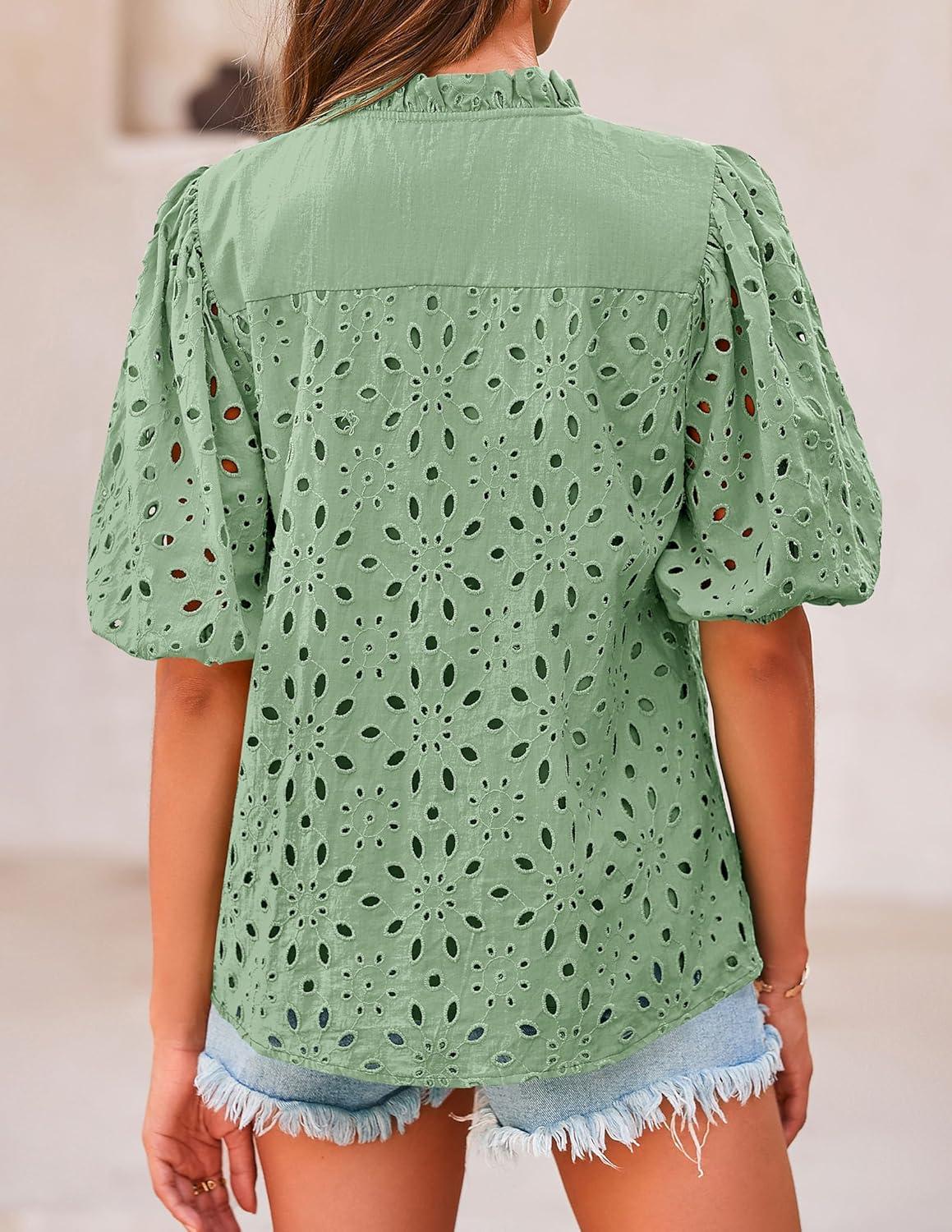 PRETTYGARDEN Women's Summer Tops 2025 Dressy Casual Short Sleeve V Neck Buttons Hollow Out Lace Embroidered Blouses Shirts(Sage Green)