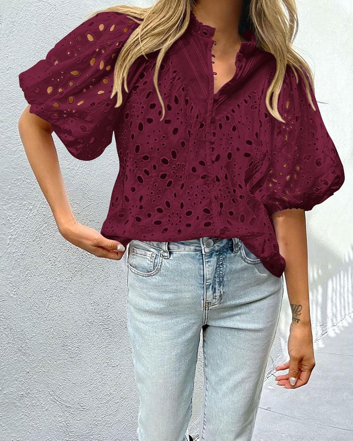 PRETTYGARDEN Women's Summer Tops 2025 Dressy Casual Short Sleeve V Neck Buttons Hollow Out Lace Embroidered Blouses Shirts(Wine Red)
