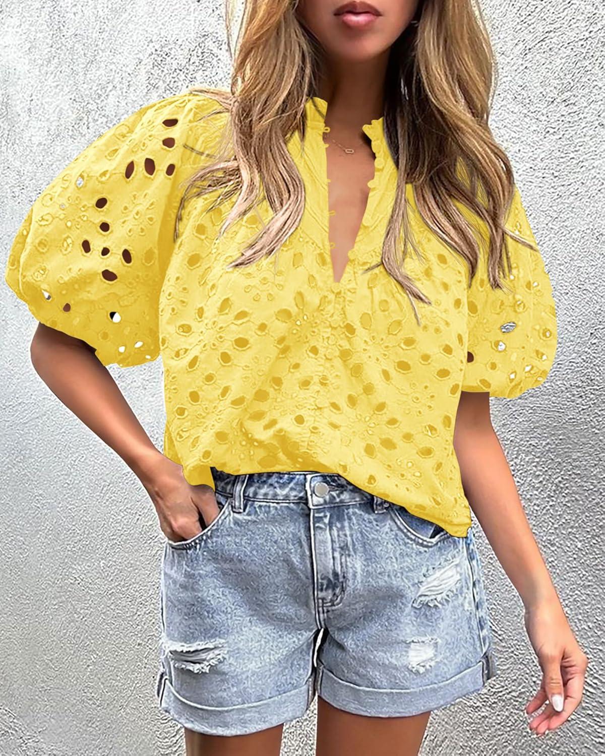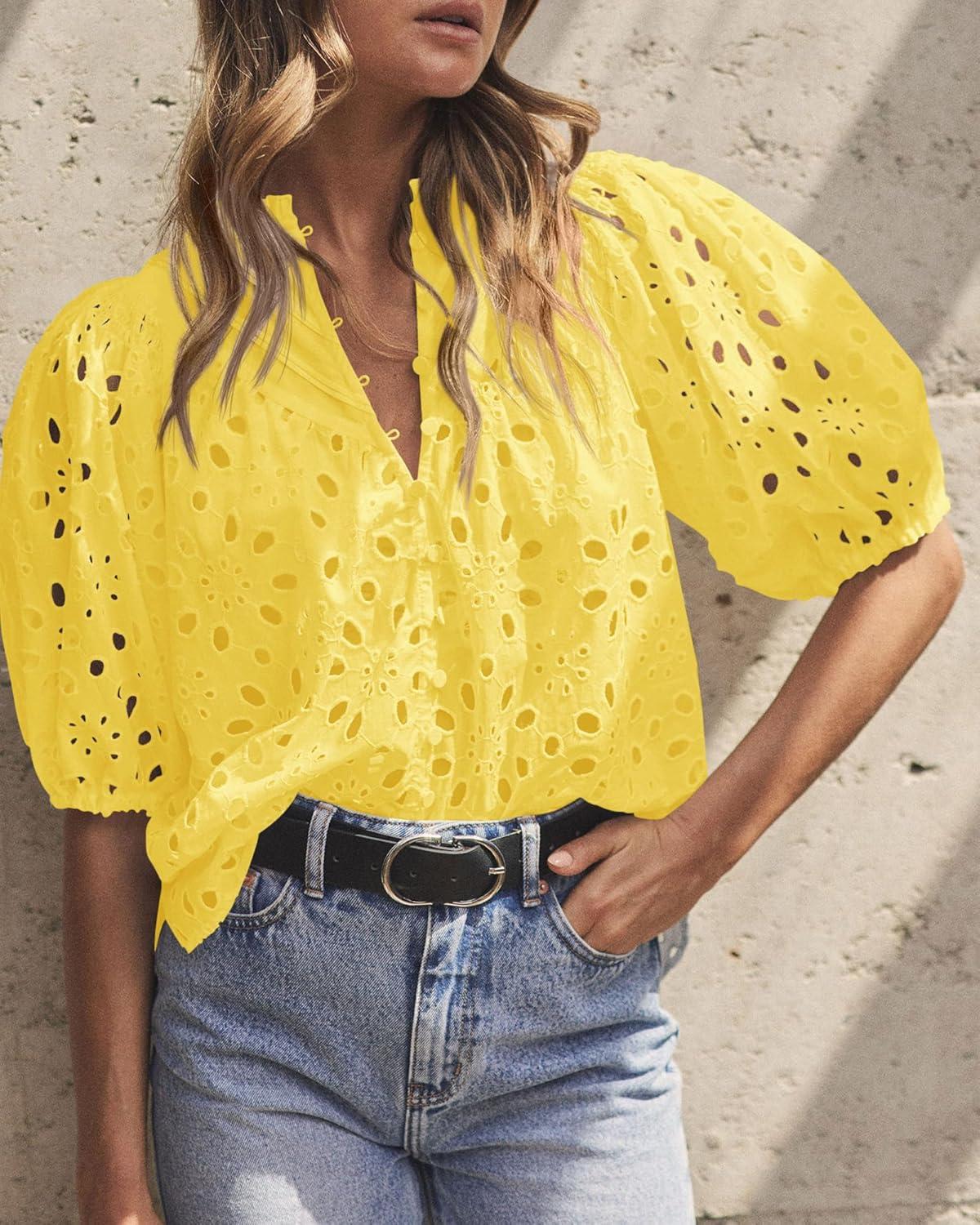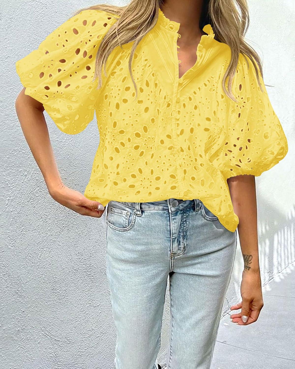 PRETTYGARDEN Women's Summer Tops 2025 Dressy Casual Short Sleeve V Neck Buttons Hollow Out Lace Embroidered Blouses Shirts(Yellow)