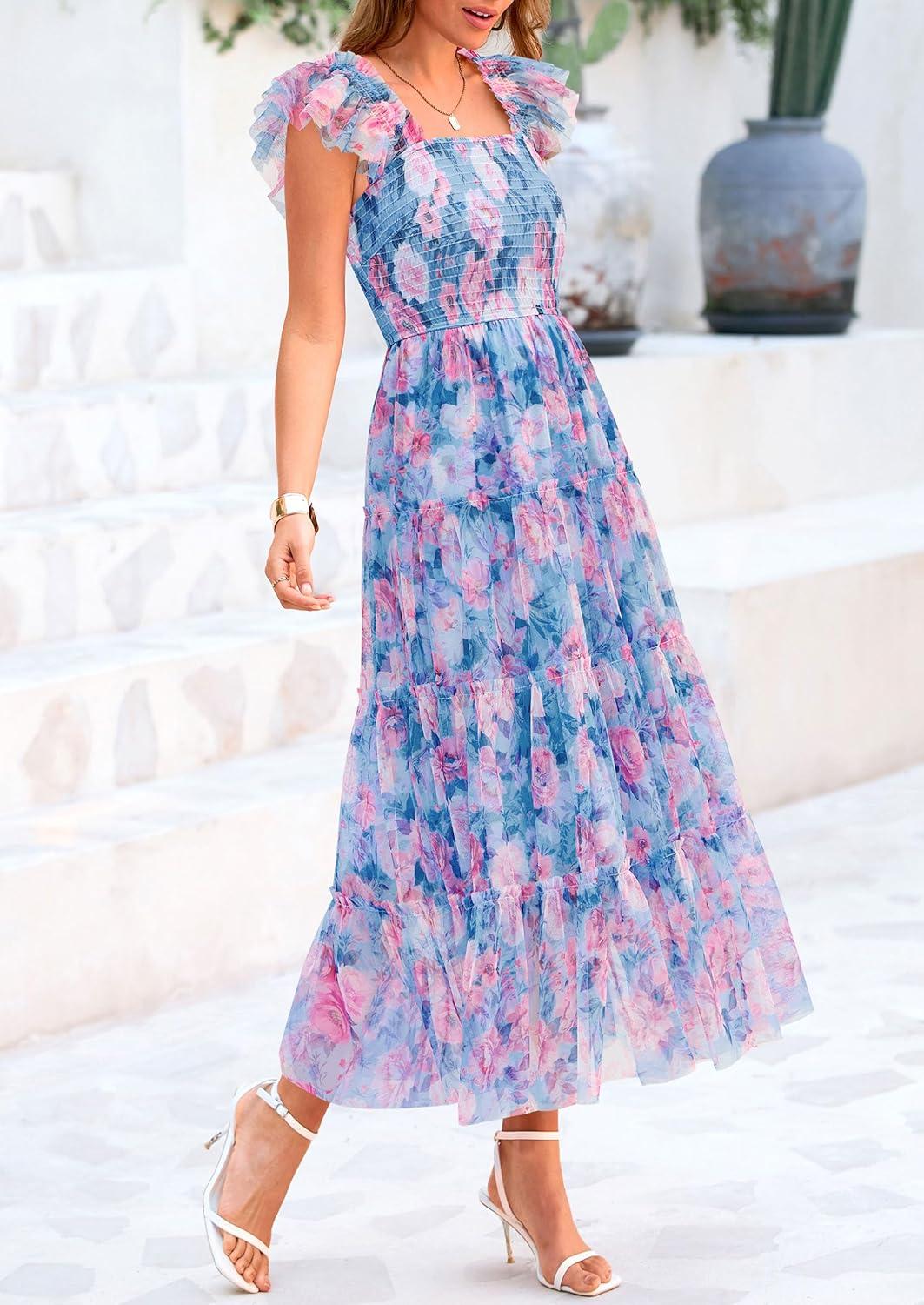 PRETTYGARDEN Women's Summer Tulle Midi Dress Sleeveless Smocked Ruffle Flowy Mesh Dresses Party Wedding Guest Sundress(Floral Blue Pink)
