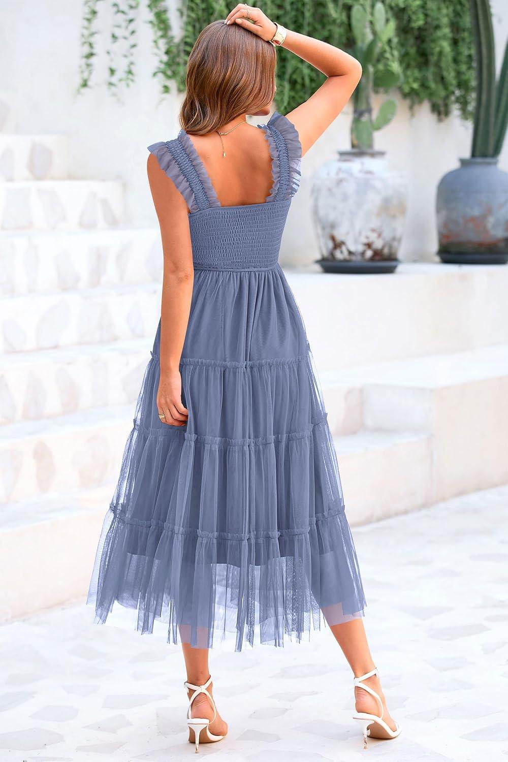 PRETTYGARDEN Women's Summer Tulle Midi Dress Sleeveless Smocked Ruffle Flowy Mesh Dresses Party Wedding Guest Sundress(Grey Blue)