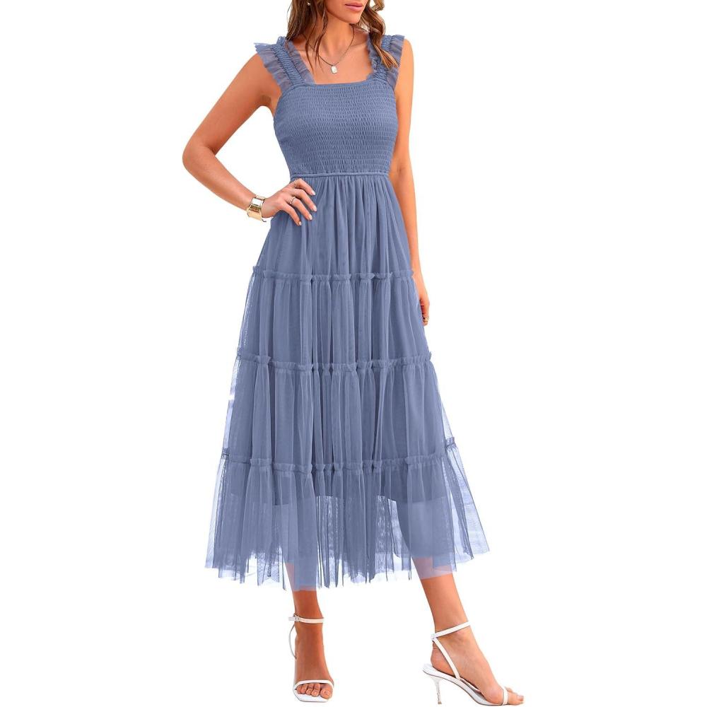 PRETTYGARDEN Women’s Summer Tulle Midi Dress Sleeveless Smocked Ruffle Flowy Mesh Dresses Party Wedding Guest Sundress(Grey Blue)