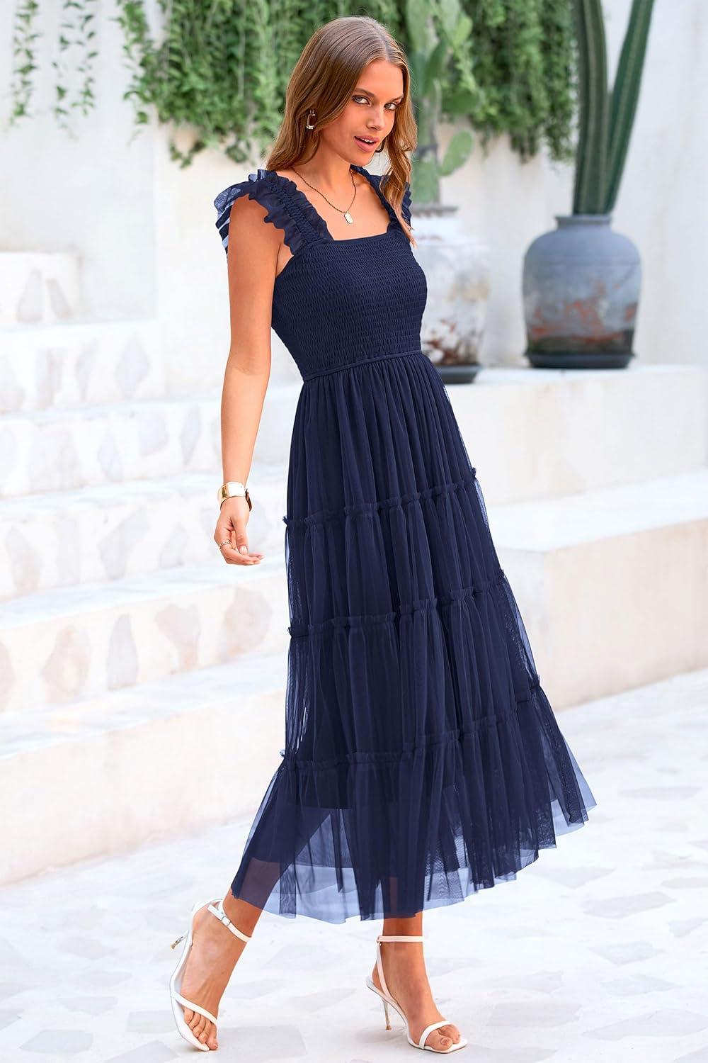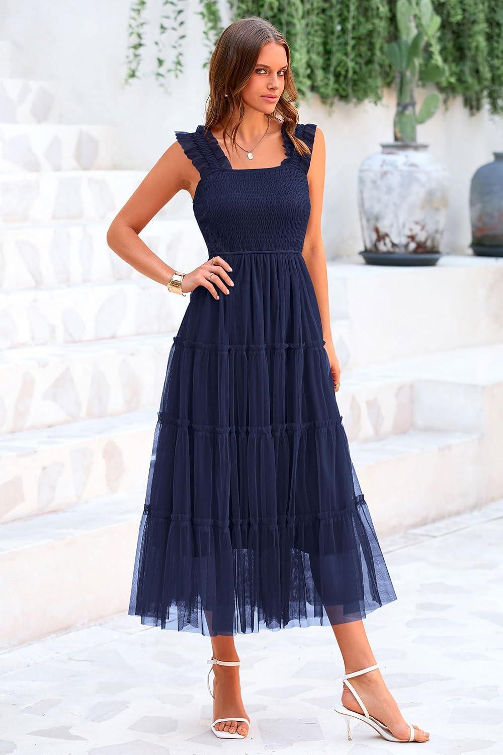 PRETTYGARDEN Women’s Summer Tulle Midi Dress Sleeveless Smocked Ruffle Flowy Mesh Dresses Party Wedding Guest Sundress(Navy)