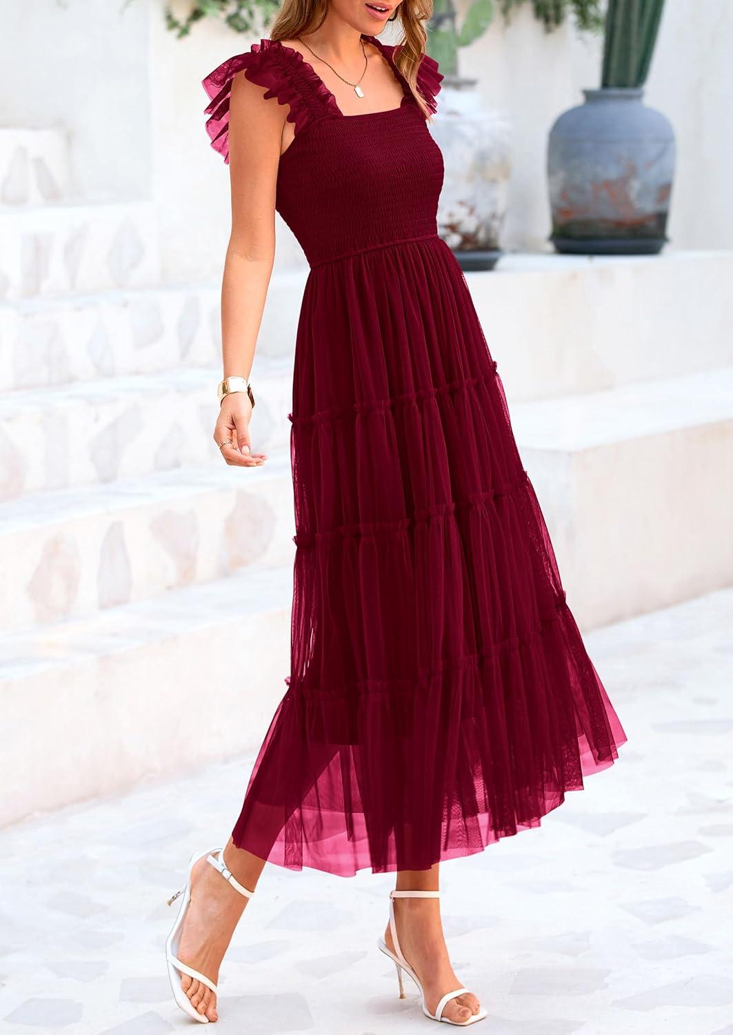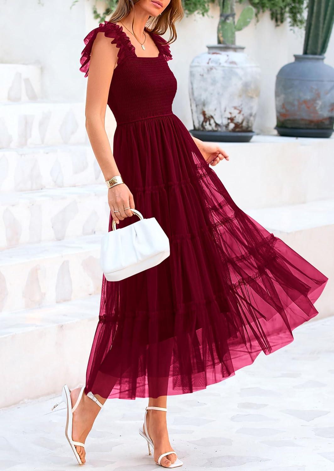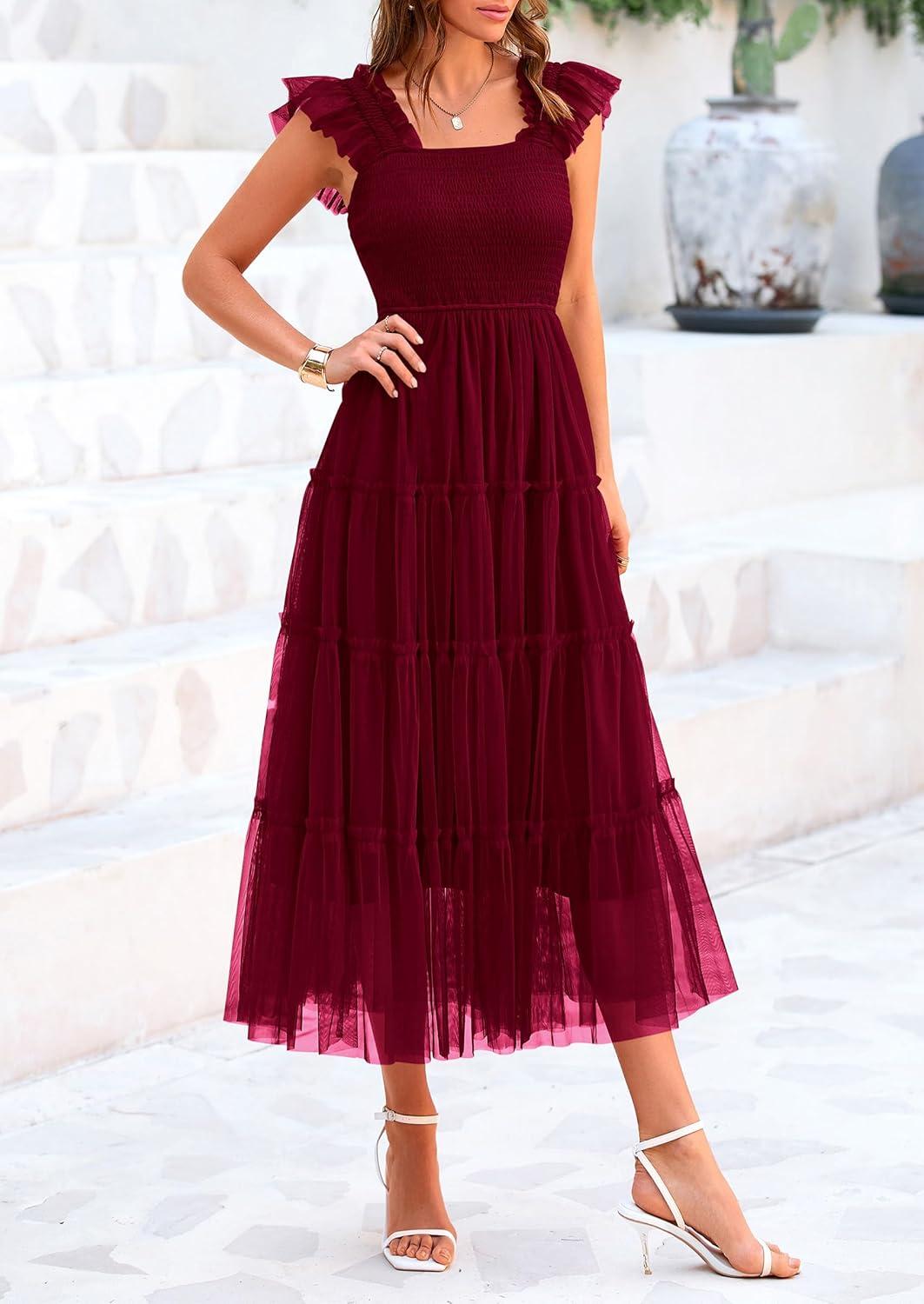 PRETTYGARDEN Women's Summer Tulle Midi Dress Sleeveless Smocked Ruffle Flowy Mesh Dresses Party Wedding Guest Sundress(Wine Red)