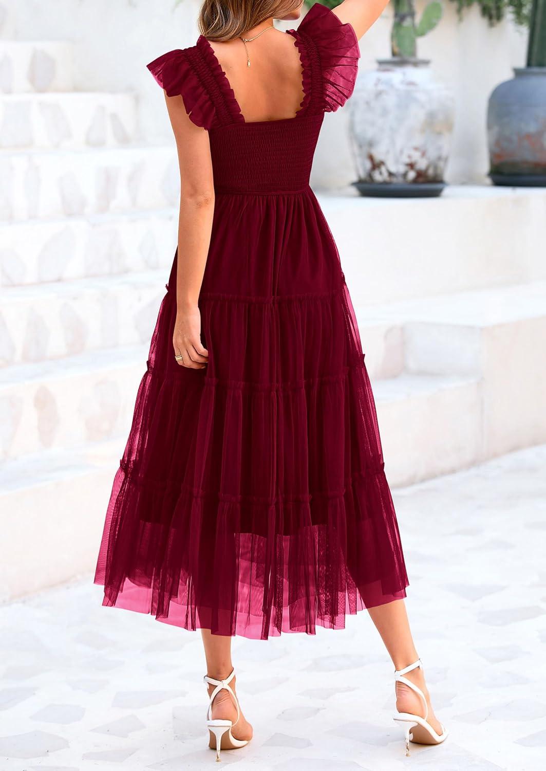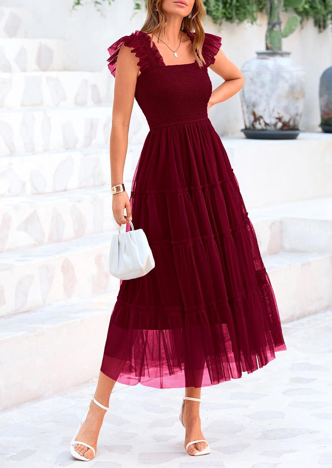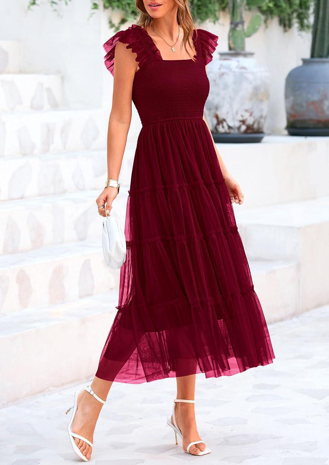 PRETTYGARDEN Women's Summer Tulle Midi Dress Sleeveless Smocked Ruffle Flowy Mesh Dresses Party Wedding Guest Sundress(Wine Red)