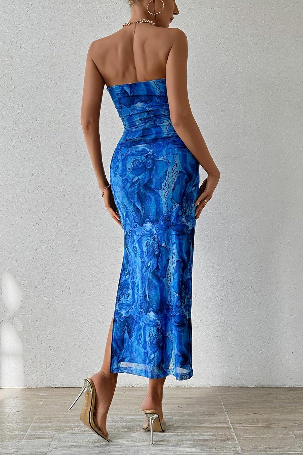 PRETTYGARDEN Women's Summer Wedding Guest Dress Strapless Tube Top Maxi Bodycon Long Floral Mesh Beach Vacation Party Dresses(Print Brilliant Blue)