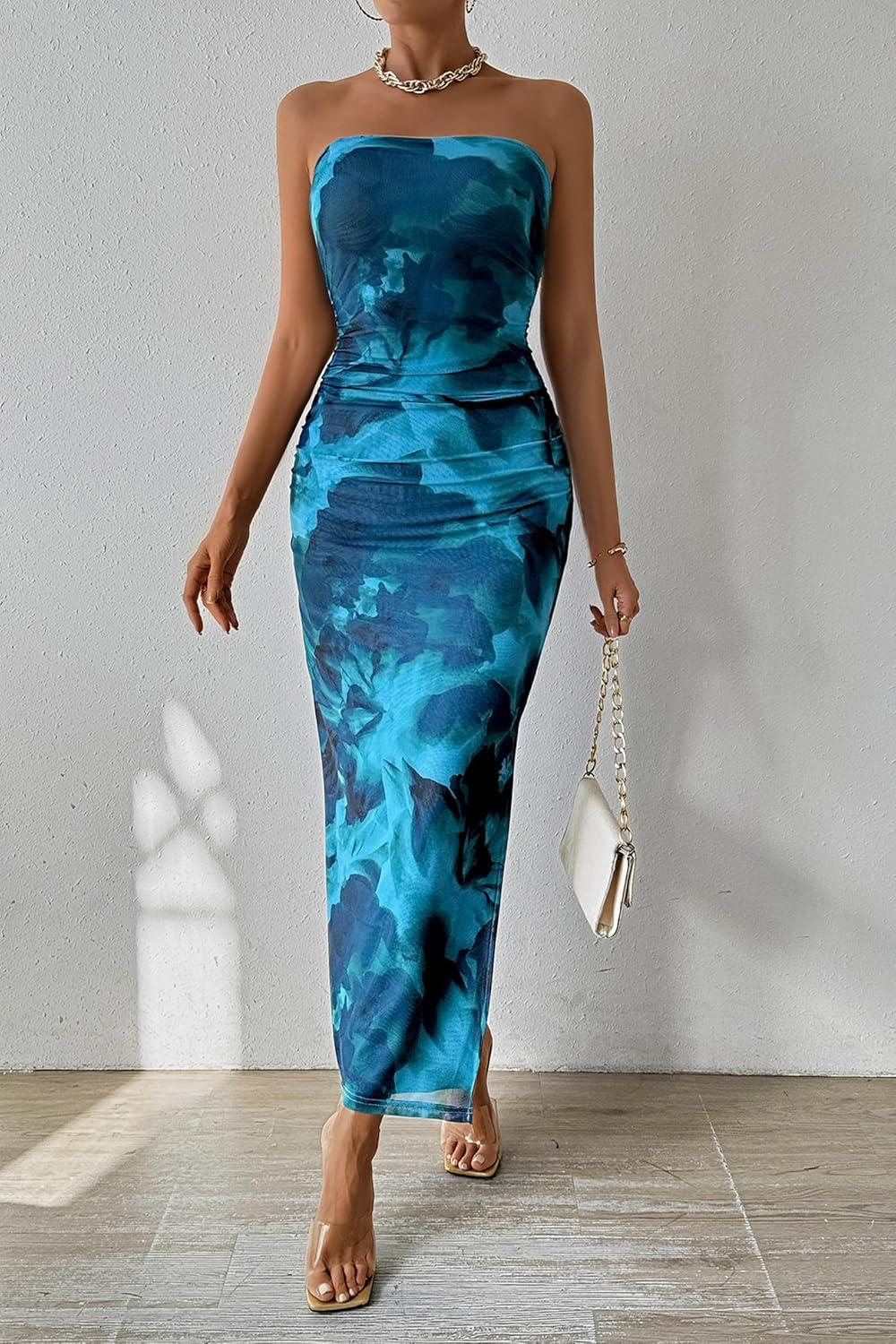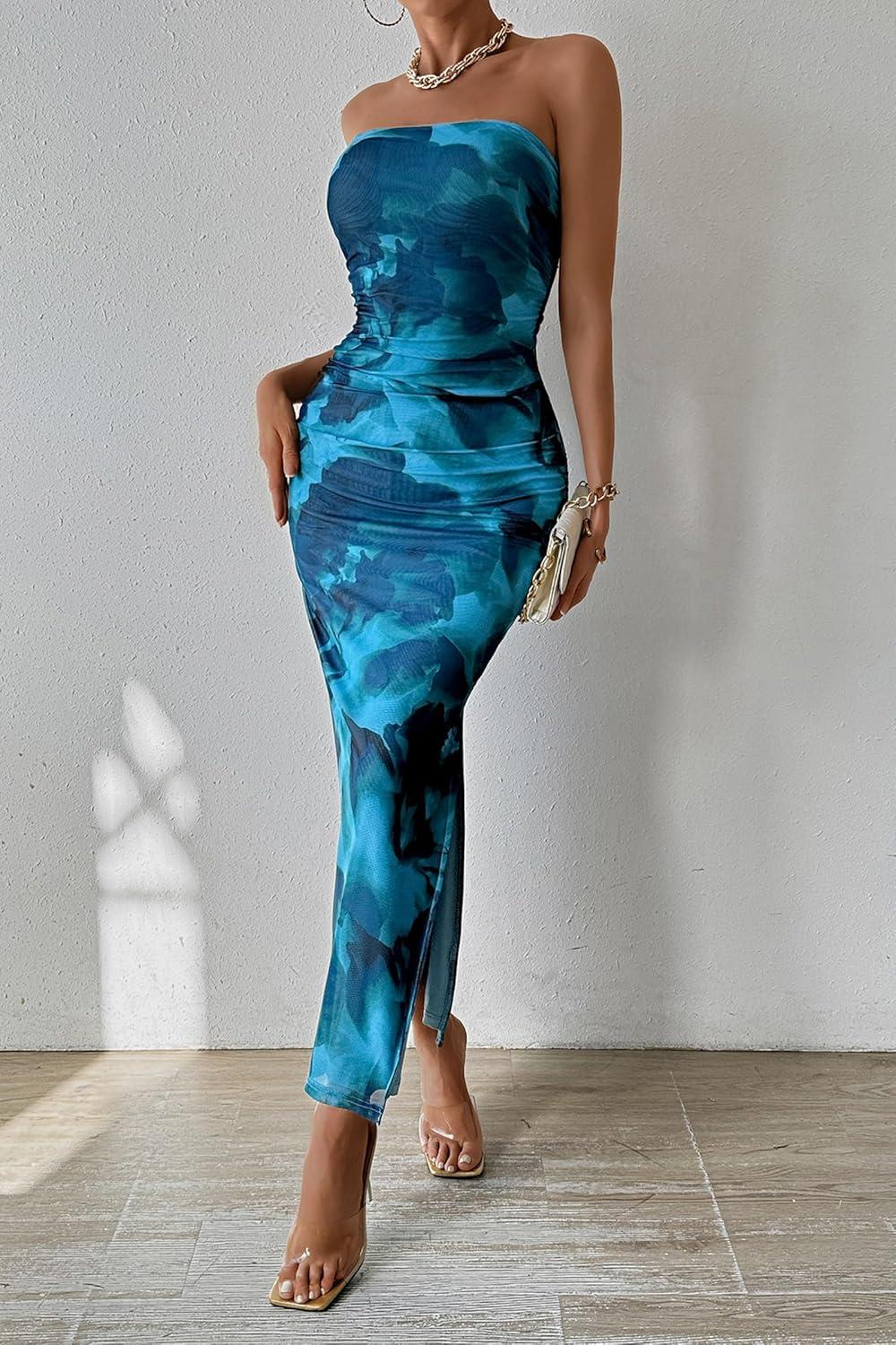 PRETTYGARDEN Women’s Summer Wedding Guest Dress Strapless Tube Top Maxi Bodycon Long Floral Mesh Beach Vacation Party Dresses(Print Lake Blue)