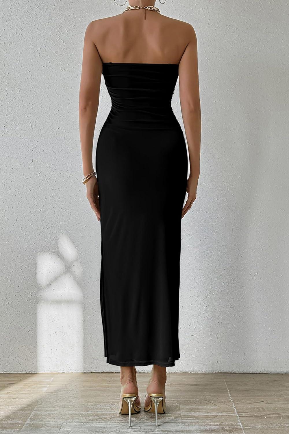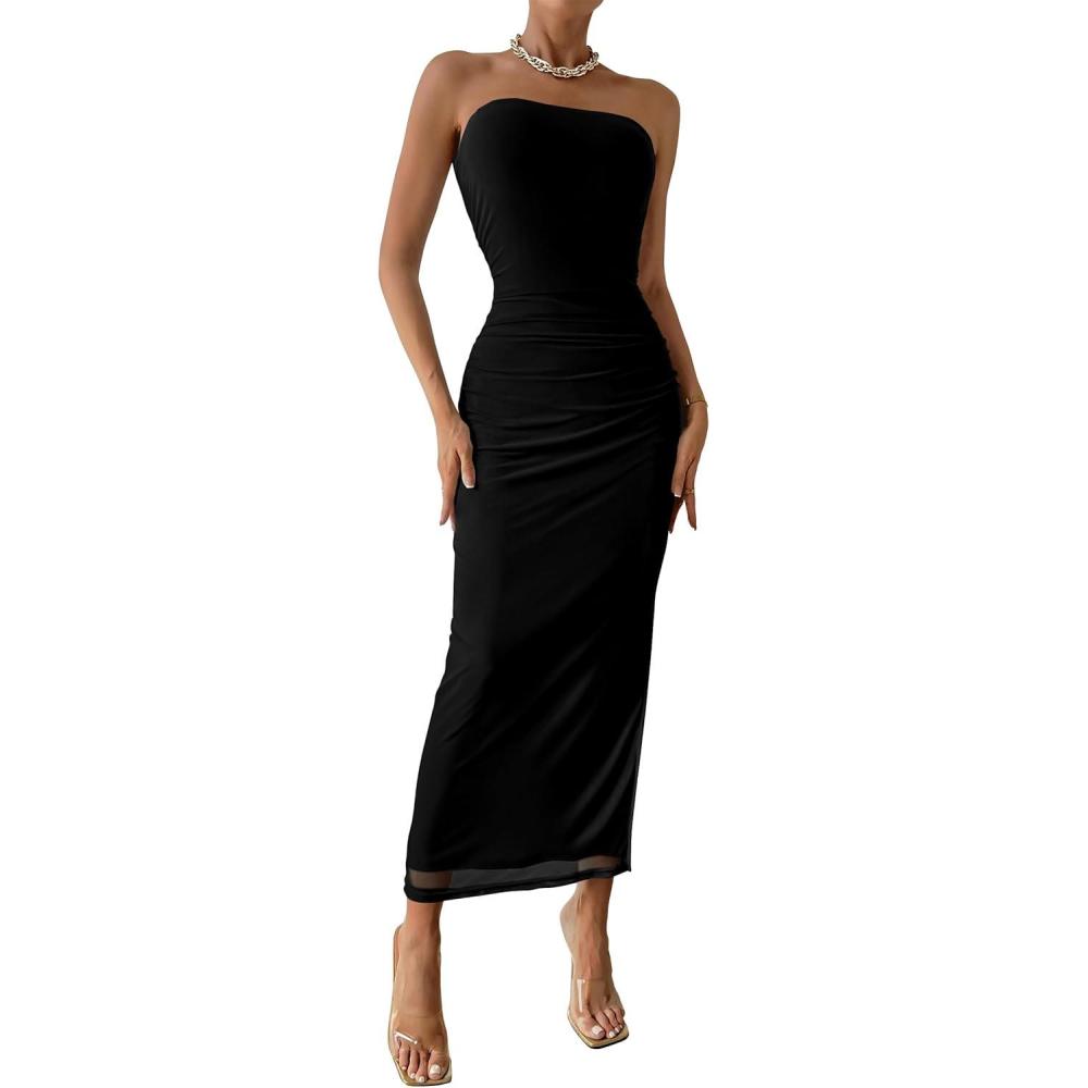 imagePRETTYGARDEN Womens Summer Wedding Guest Dress Strapless Tube Top Maxi Bodycon Long Floral Mesh Beach Vacation Party DressesSolid Black