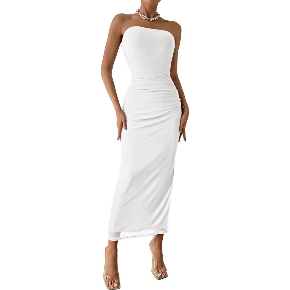 imagePRETTYGARDEN Womens Summer Wedding Guest Dress Strapless Tube Top Maxi Bodycon Long Floral Mesh Beach Vacation Party DressesWhite