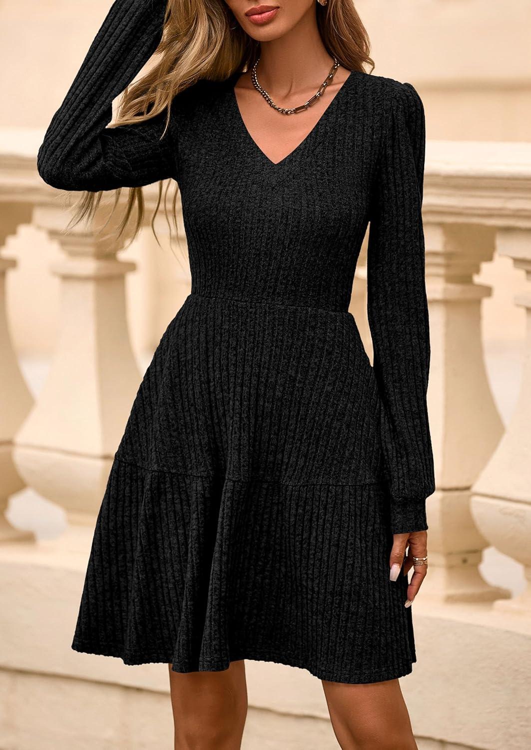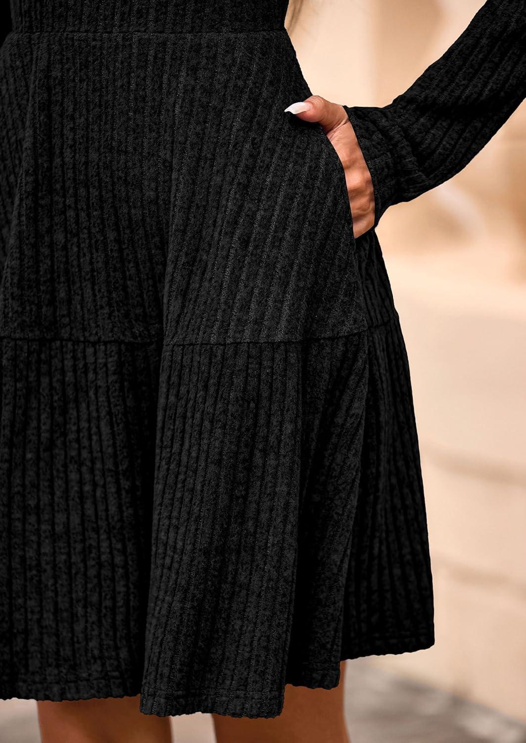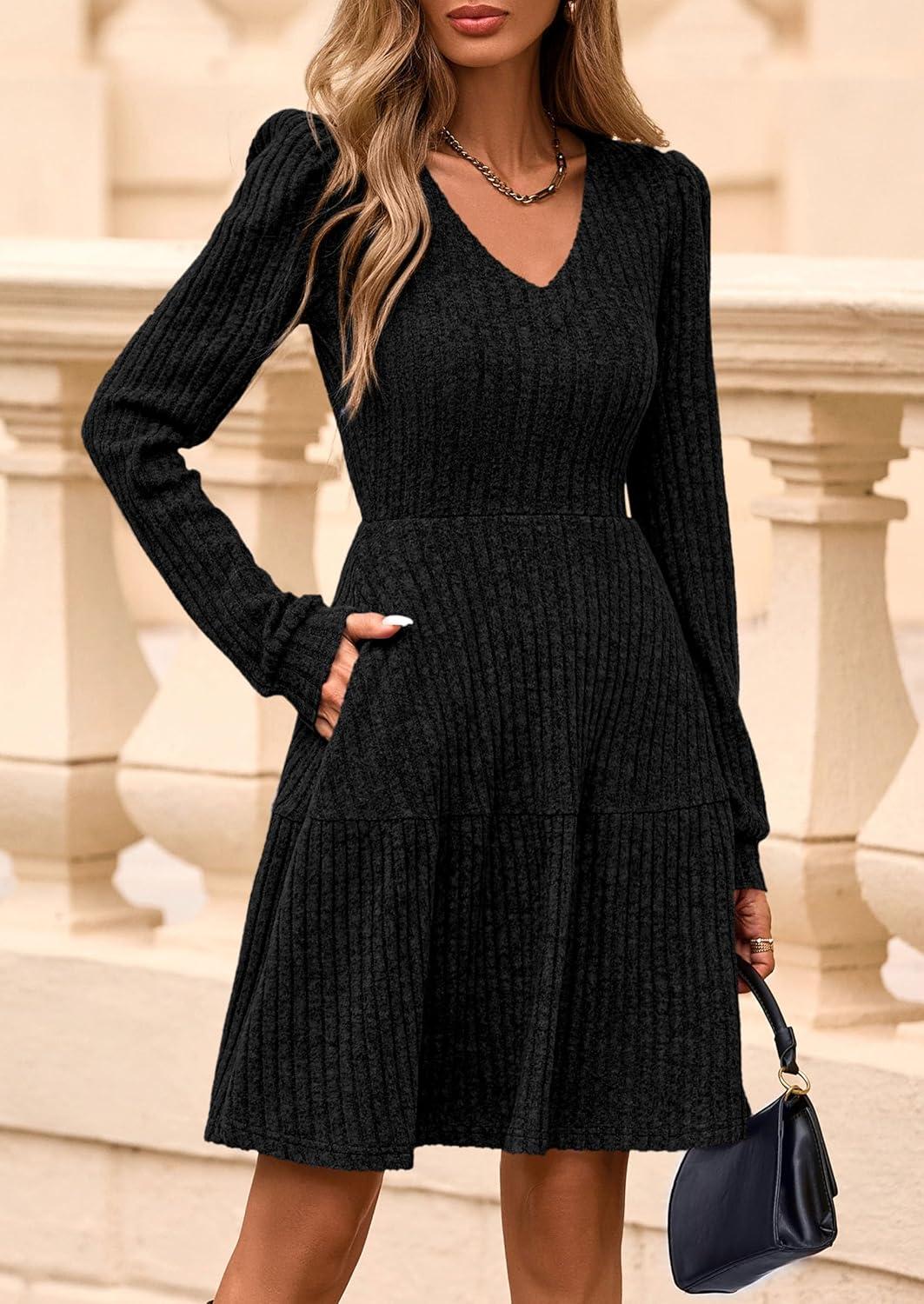 PRETTYGARDEN Womens Sweater Dress 2025 Fall Long Sleeve V Neck A Line Fit and Flare Ribbed Short Dresses Knit Outfits Pockets(Black)