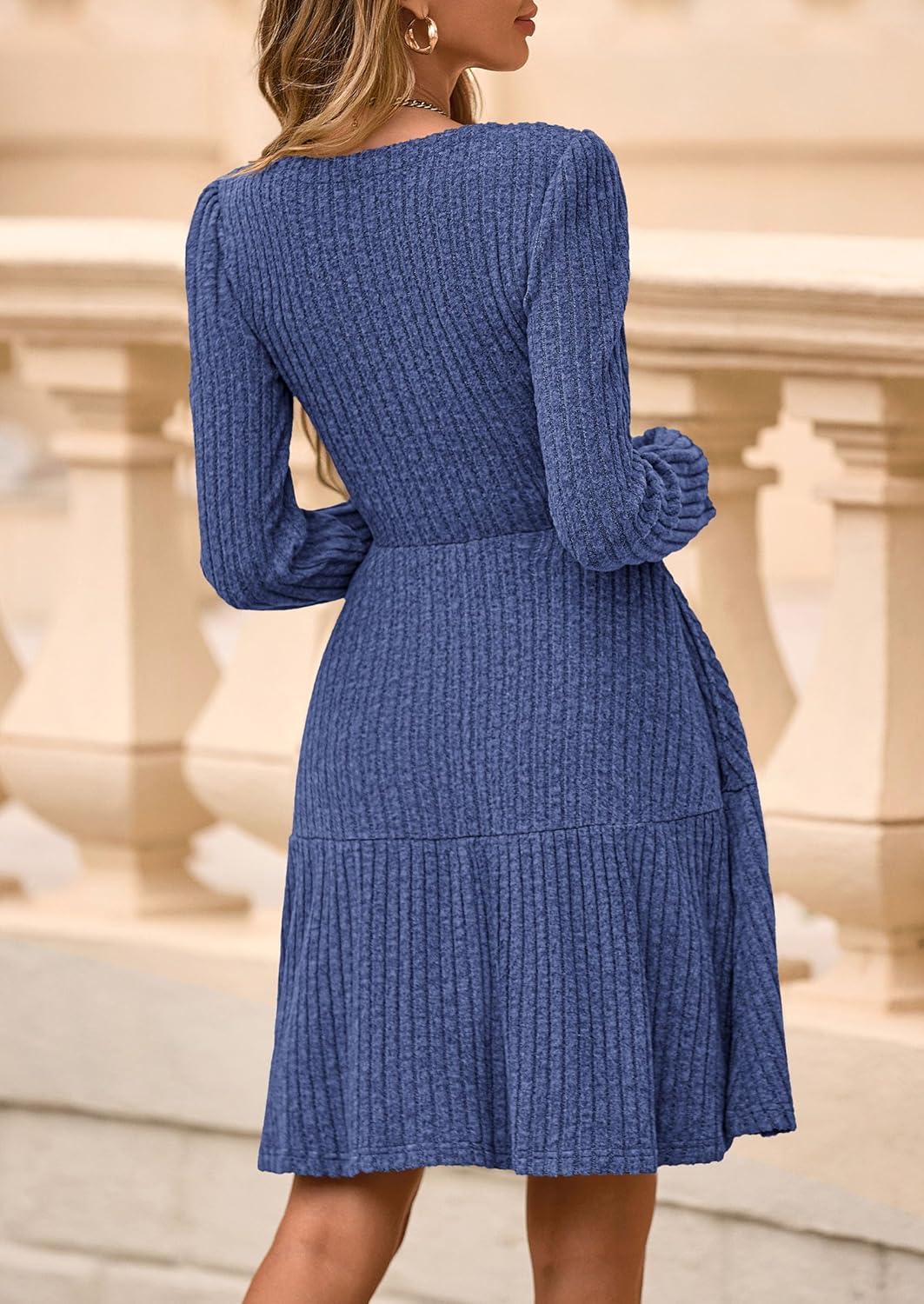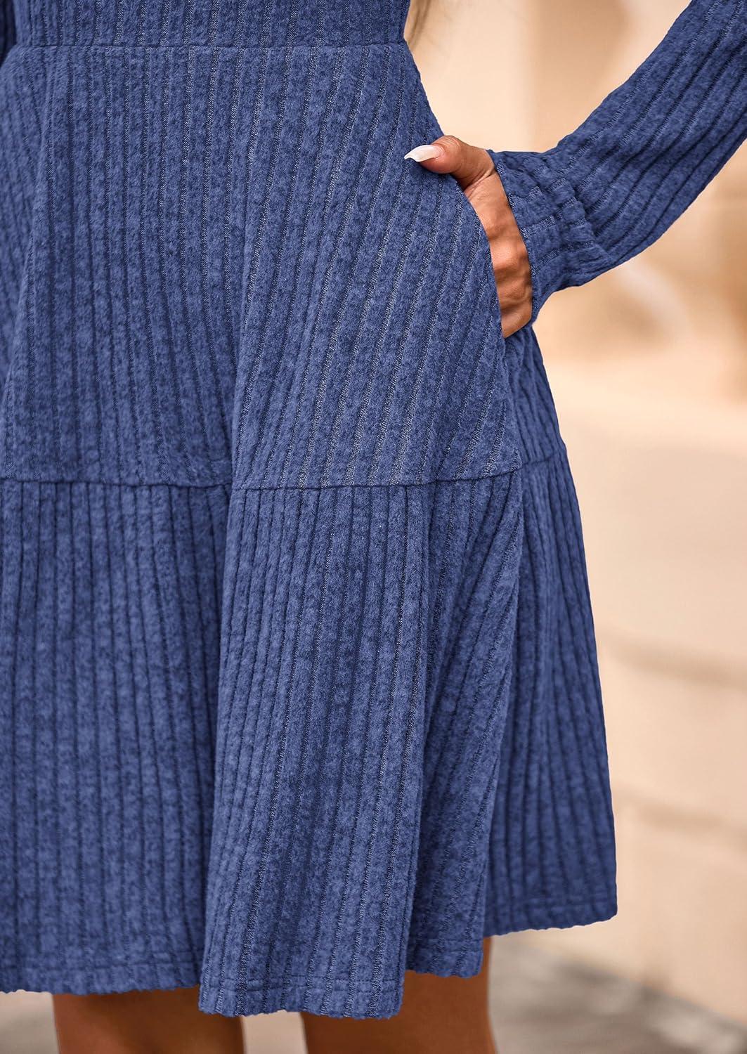 PRETTYGARDEN Womens Sweater Dress 2025 Fall Long Sleeve V Neck A Line Fit and Flare Ribbed Short Dresses Knit Outfits Pockets(Blue)