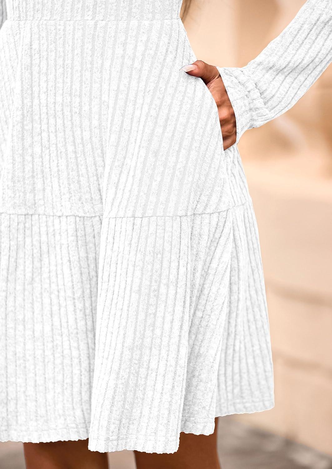 PRETTYGARDEN Womens Sweater Dress 2025 Fall Long Sleeve V Neck A Line Fit and Flare Ribbed Short Dresses Knit Outfits Pockets(White)