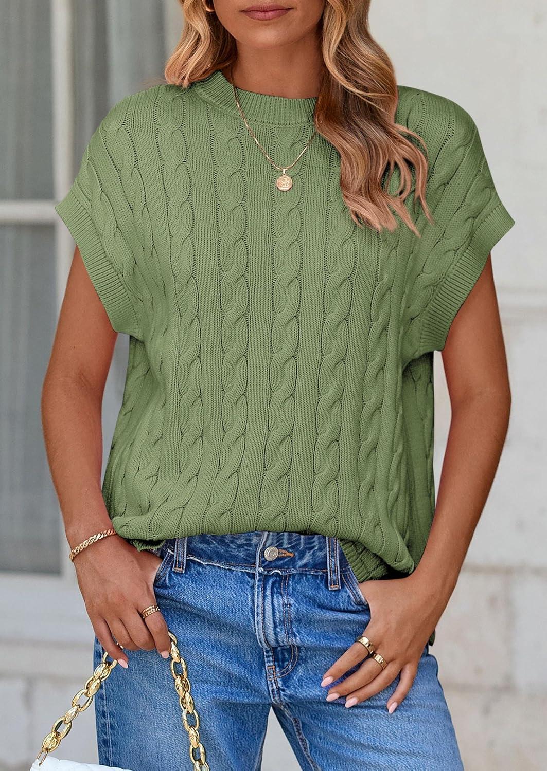 PRETTYGARDEN Women's Sweater Vest 2025 Summer Short Sleeve Tops Casual Crewneck Knit Oversized Pullover Trendy Spring Outfits(Bean Green)