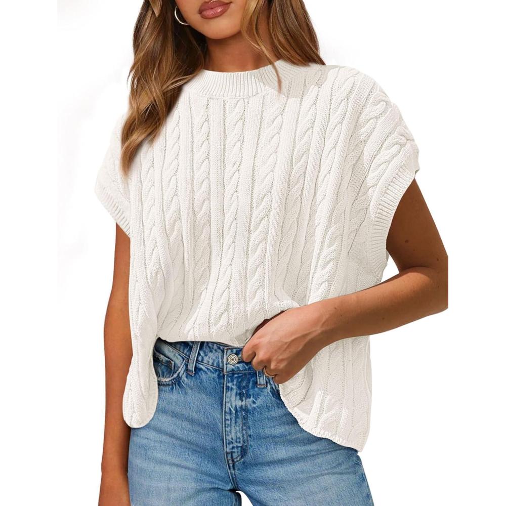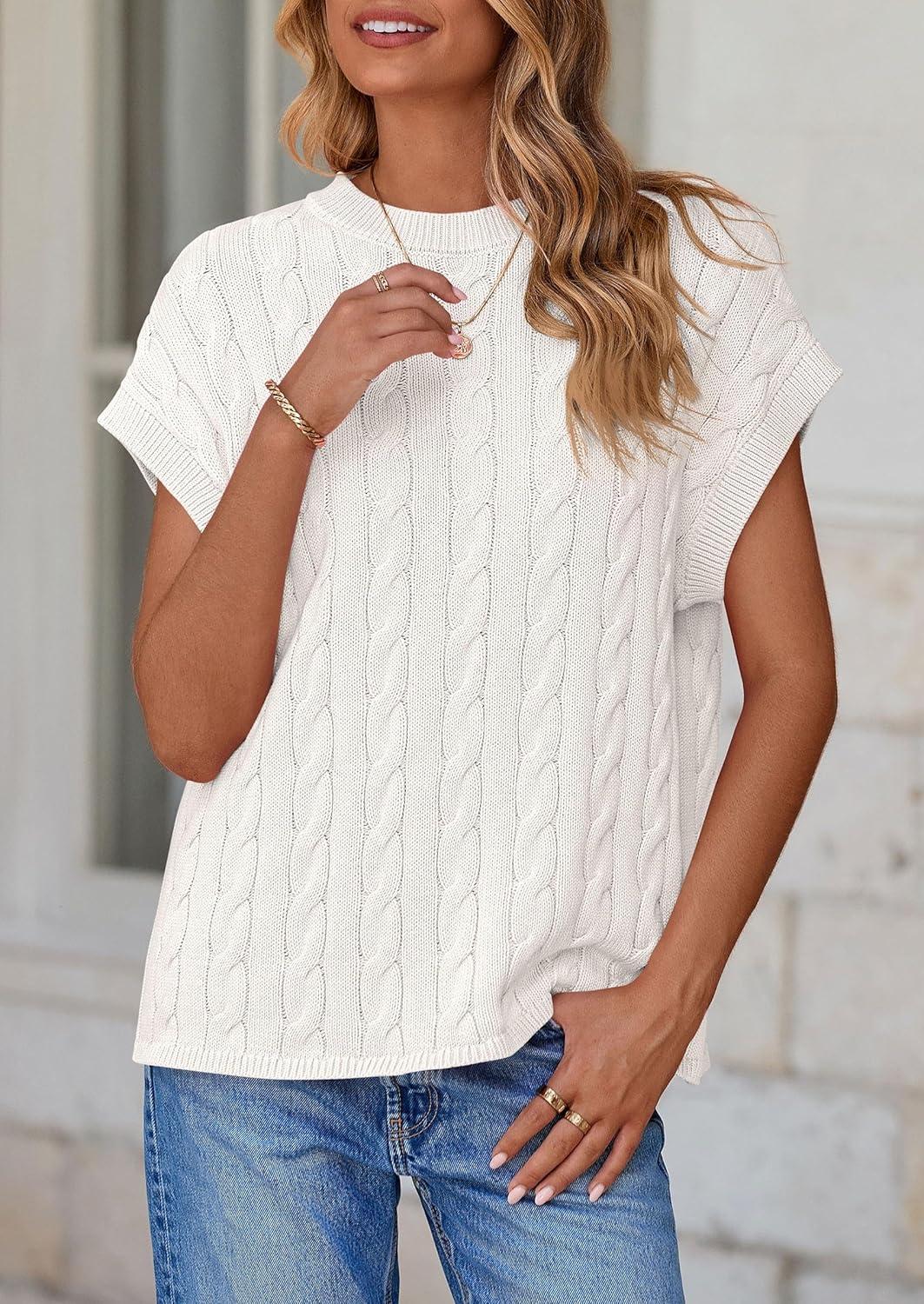PRETTYGARDEN Women’s Sweater Vest 2025 Summer Short Sleeve Tops Casual Crewneck Knit Oversized Pullover Trendy Spring Outfits(White)