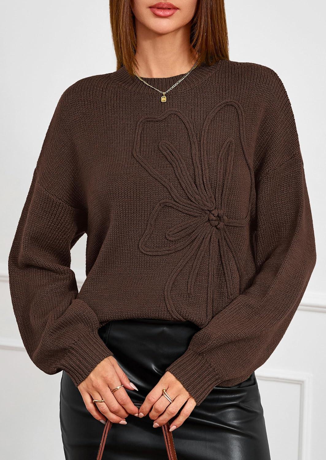 PRETTYGARDEN Womens Sweaters 2025 Fall Fashion Long Sleeve Crewneck Floral Knit Pullover Sweater Tops Winter Clothes(Brown)