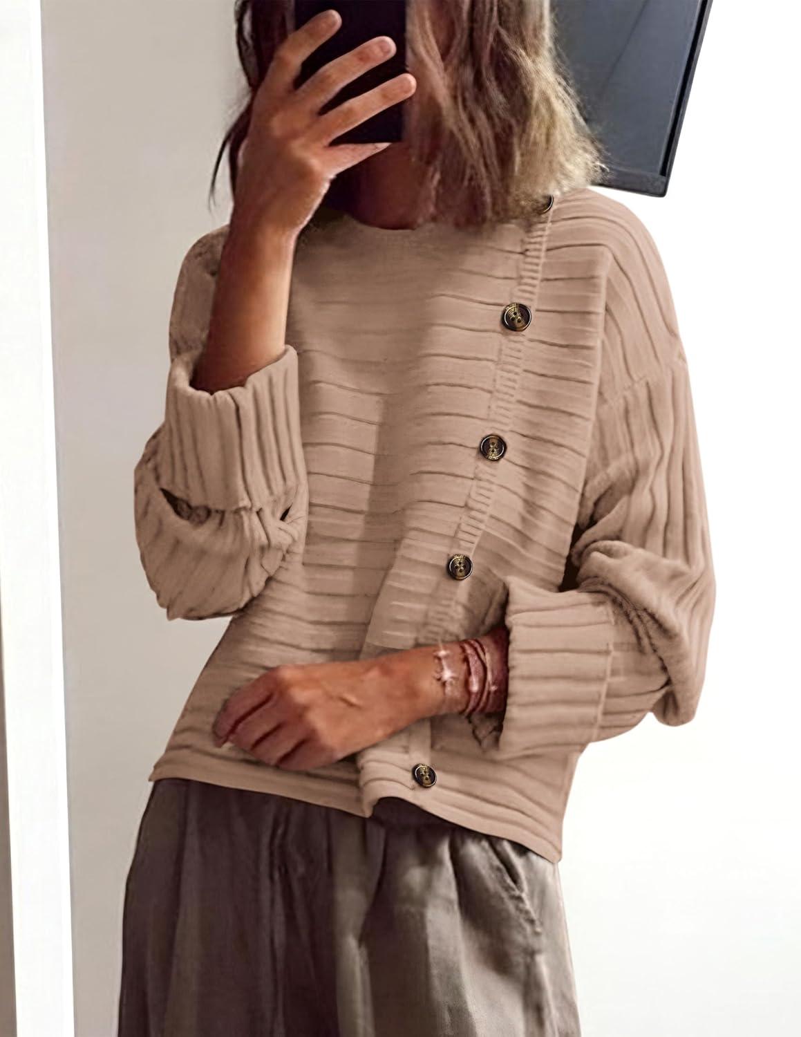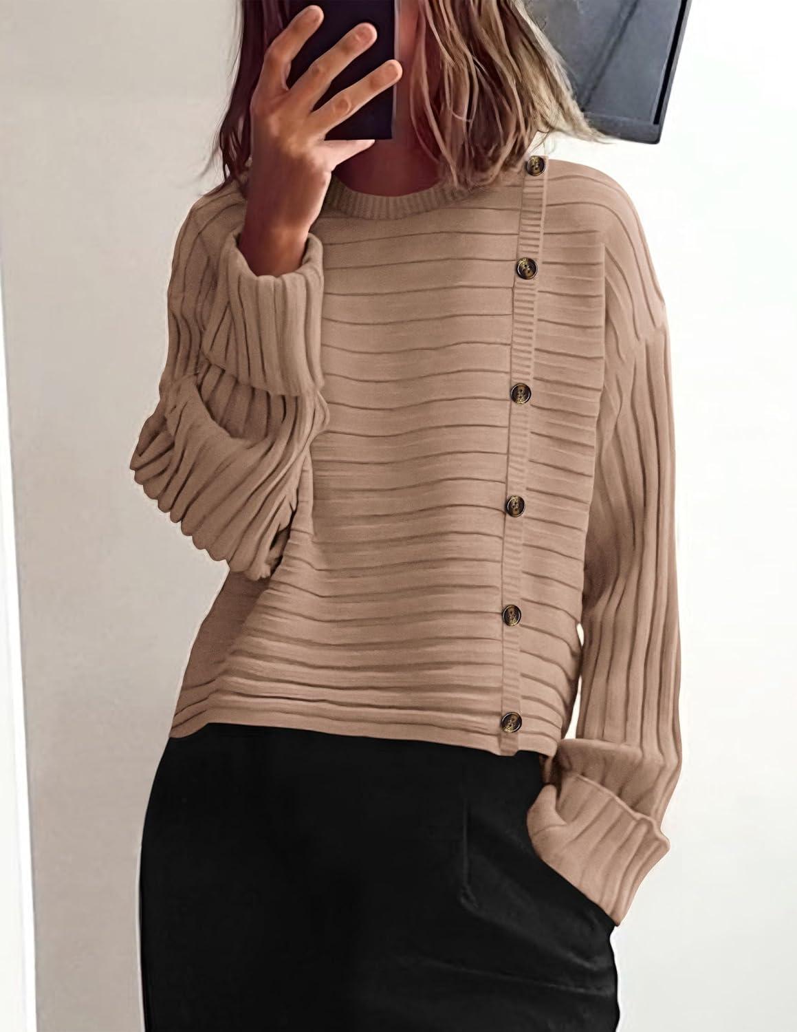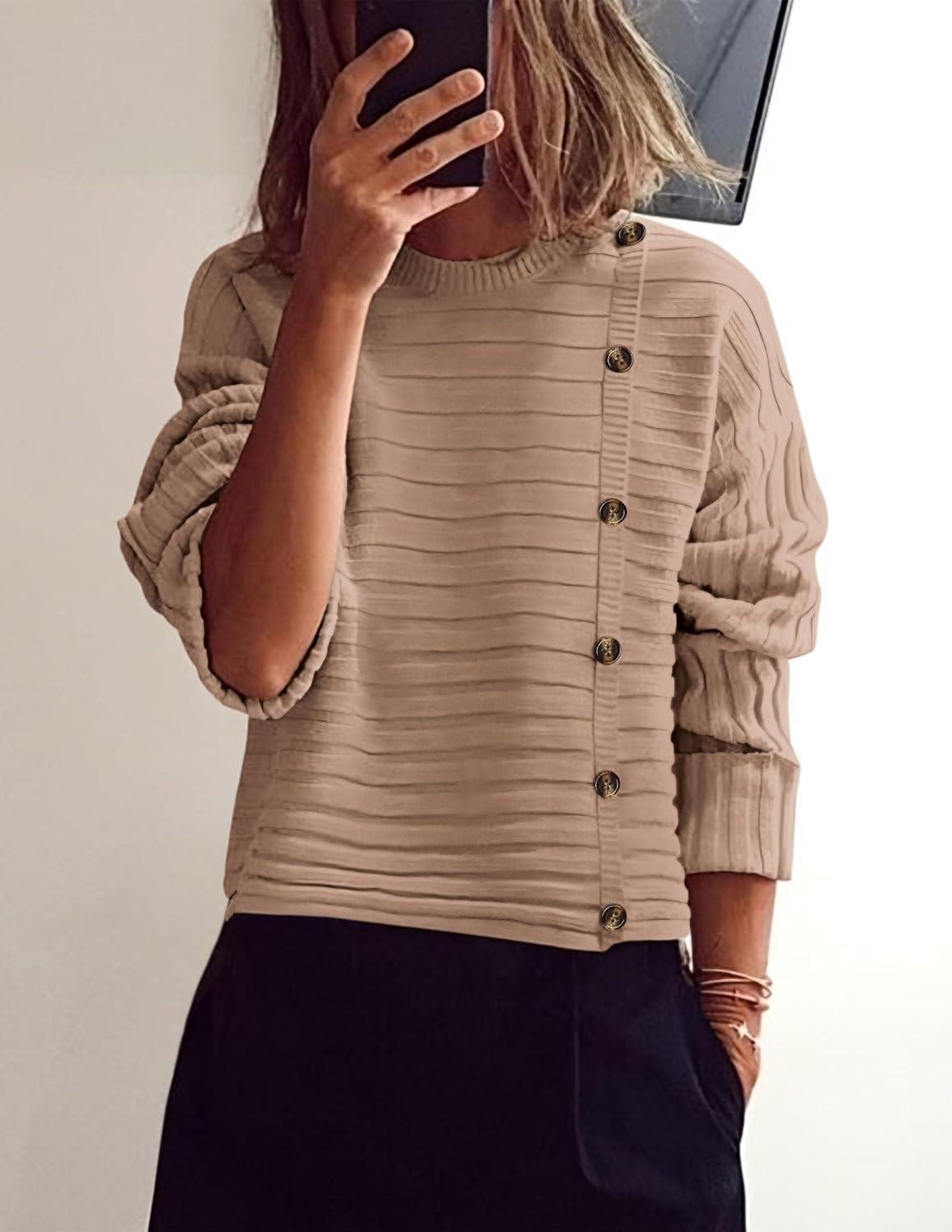 PRETTYGARDEN Womens Sweaters Fall 2025 Casual Long Sleeve Crewneck Button Loose Winter Knit Pullover Sweater Tops(Khaki)