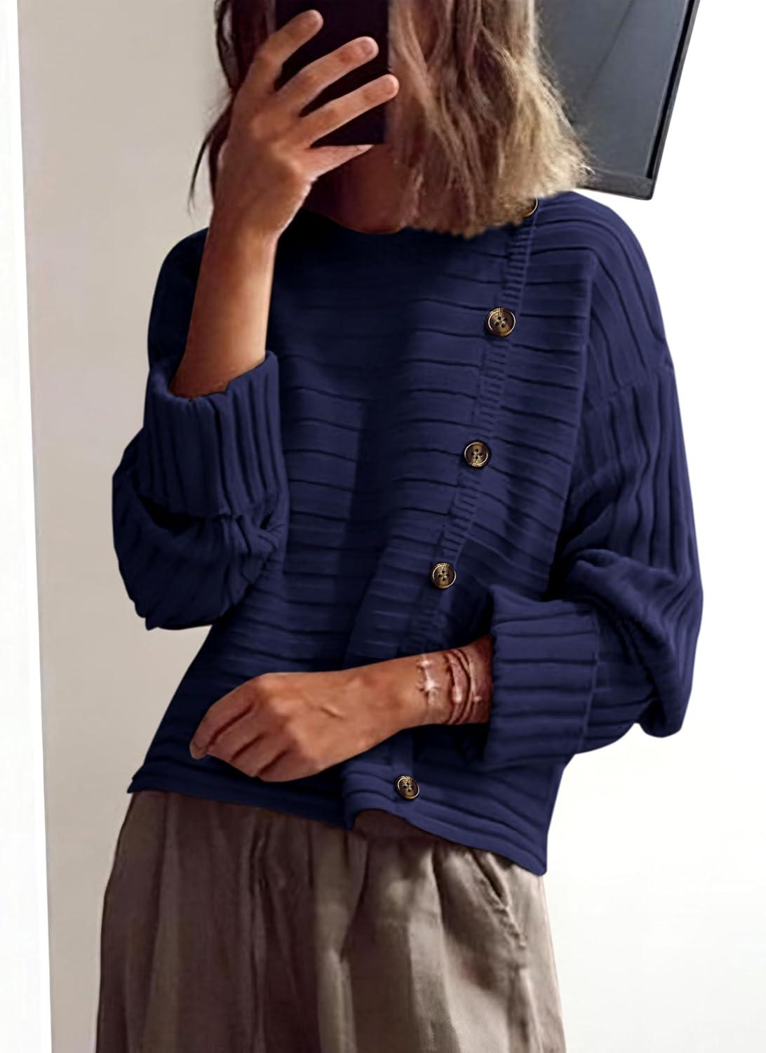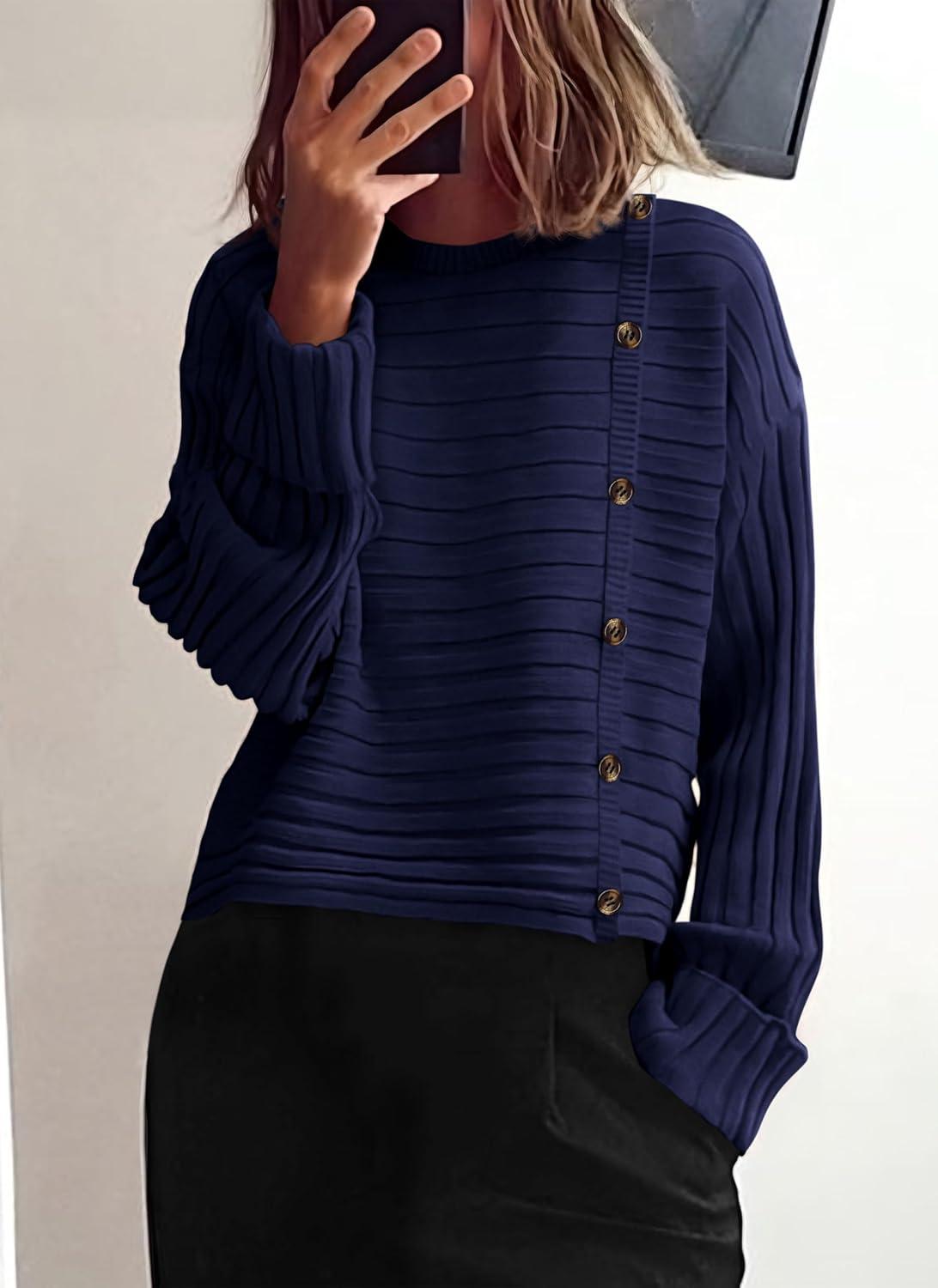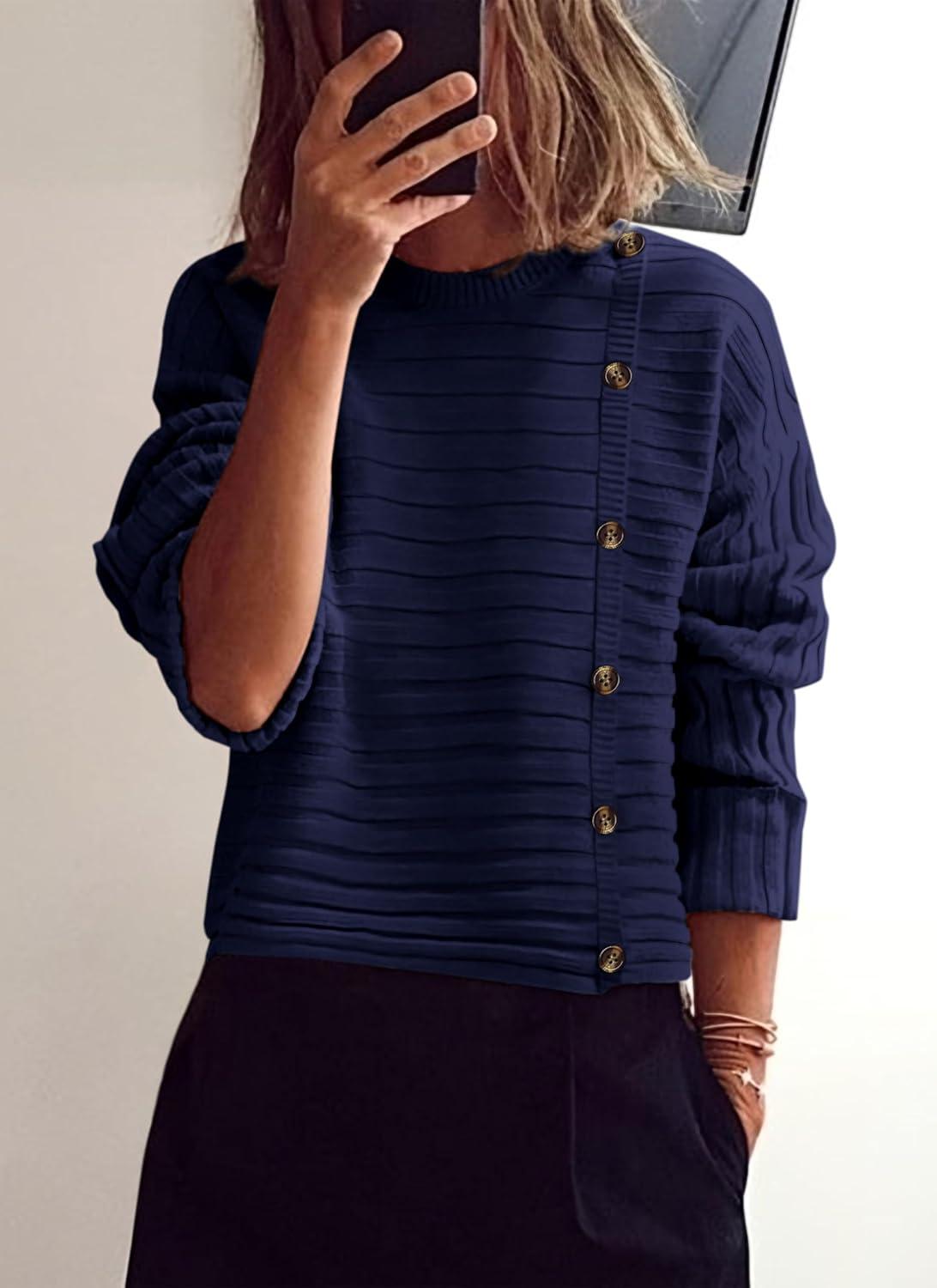 PRETTYGARDEN Womens Sweaters Fall 2025 Casual Long Sleeve Crewneck Button Loose Winter Knit Pullover Sweater Tops(Navy)