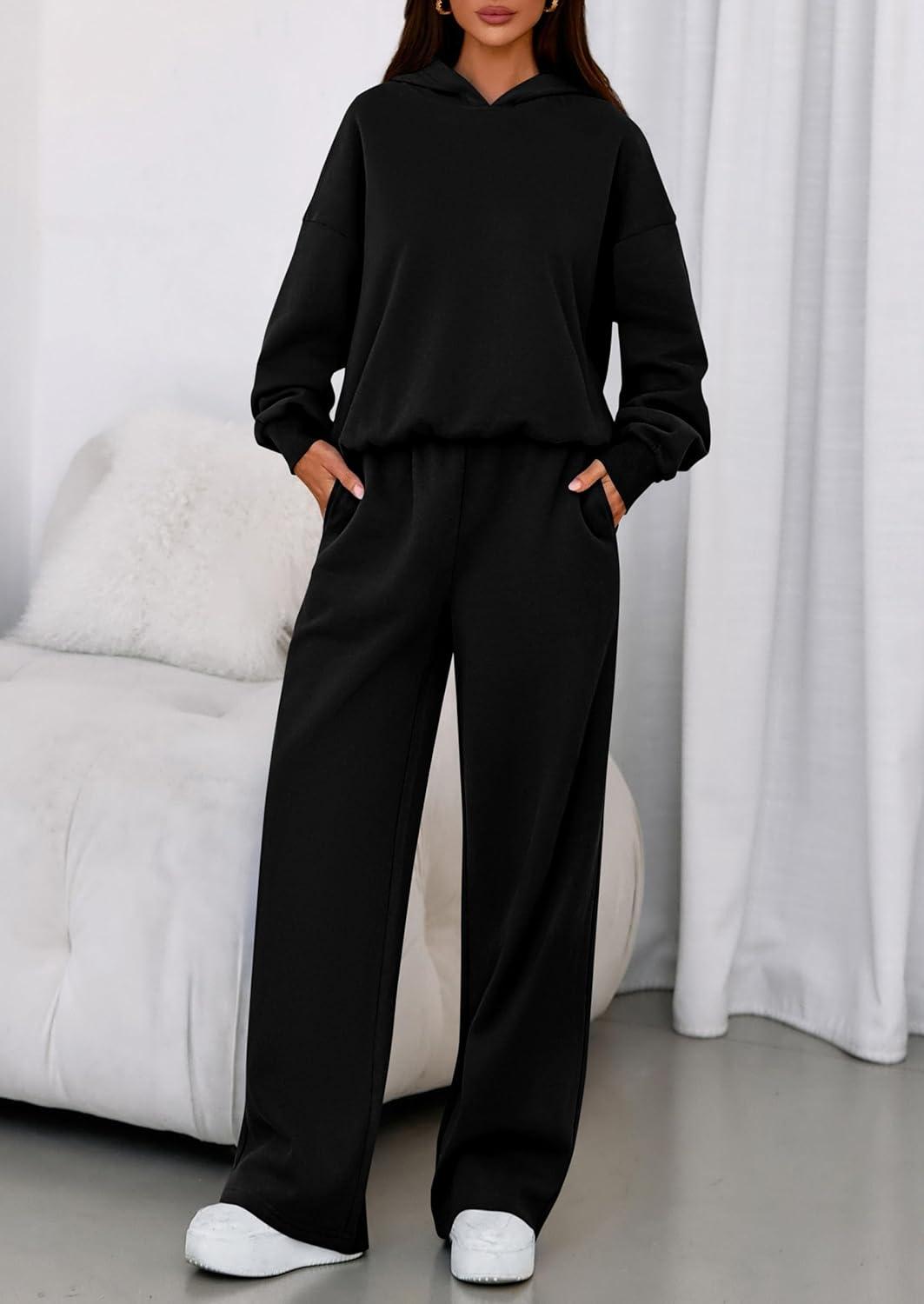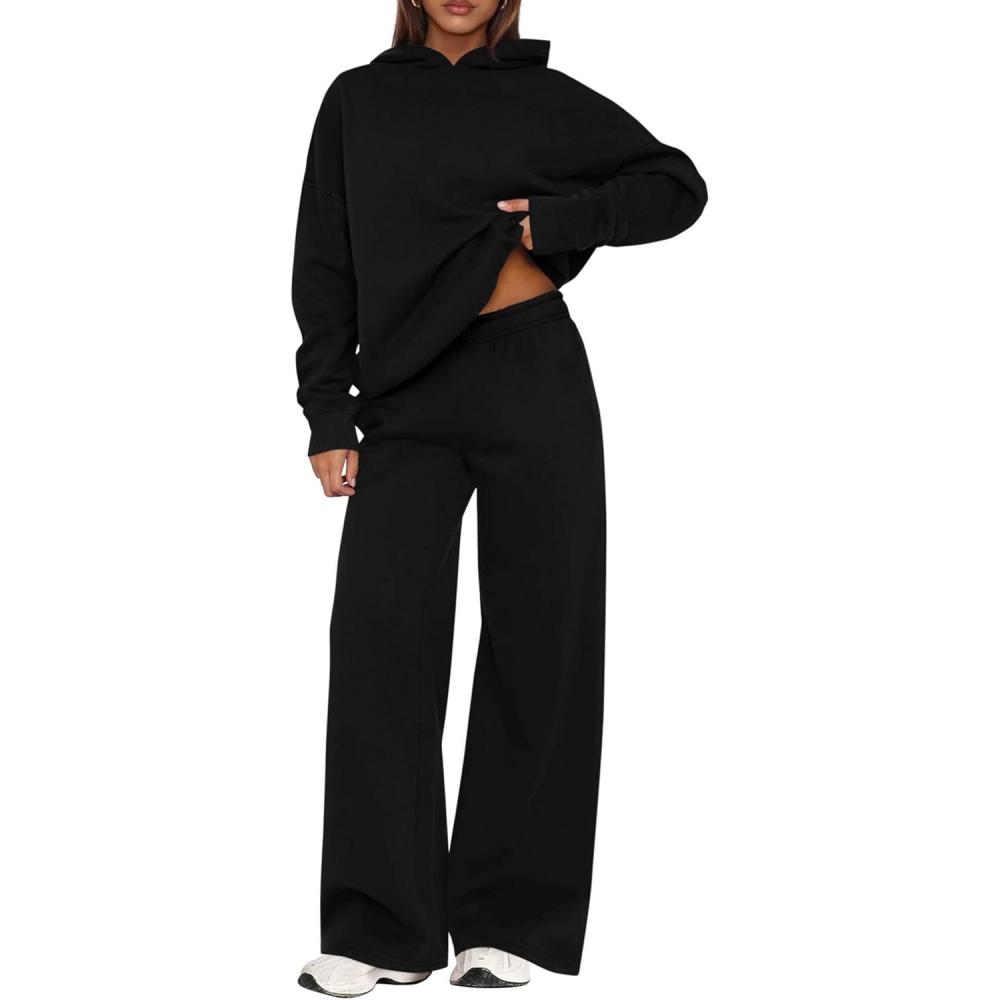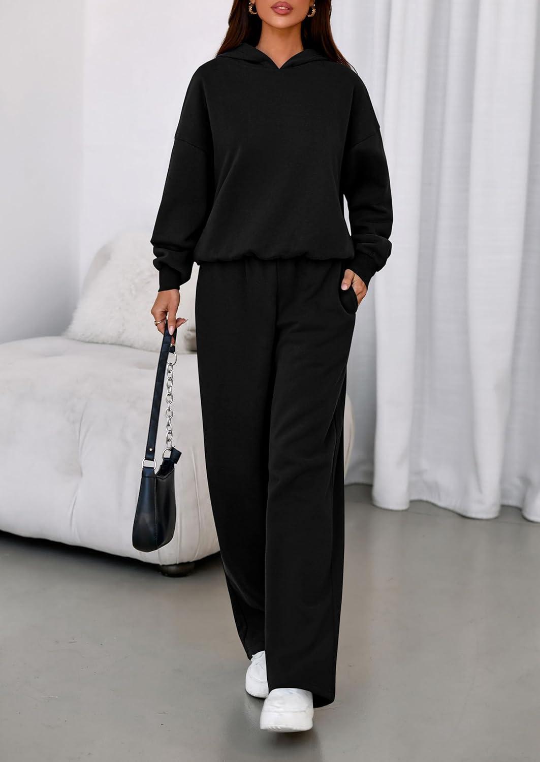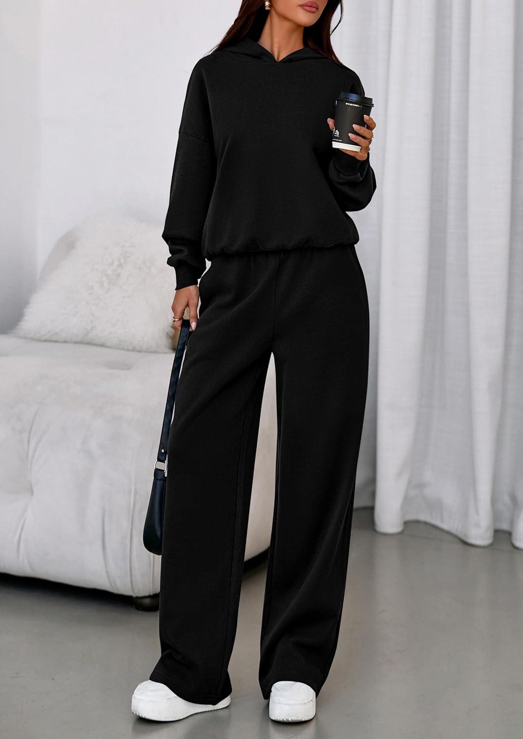 PRETTYGARDEN Womens Sweatsuits 2 Piece Set 2025 Casual Winter Long Sleeve Hoodie Loose Wide Leg Sweatpants Fall Tracksuit(Black)